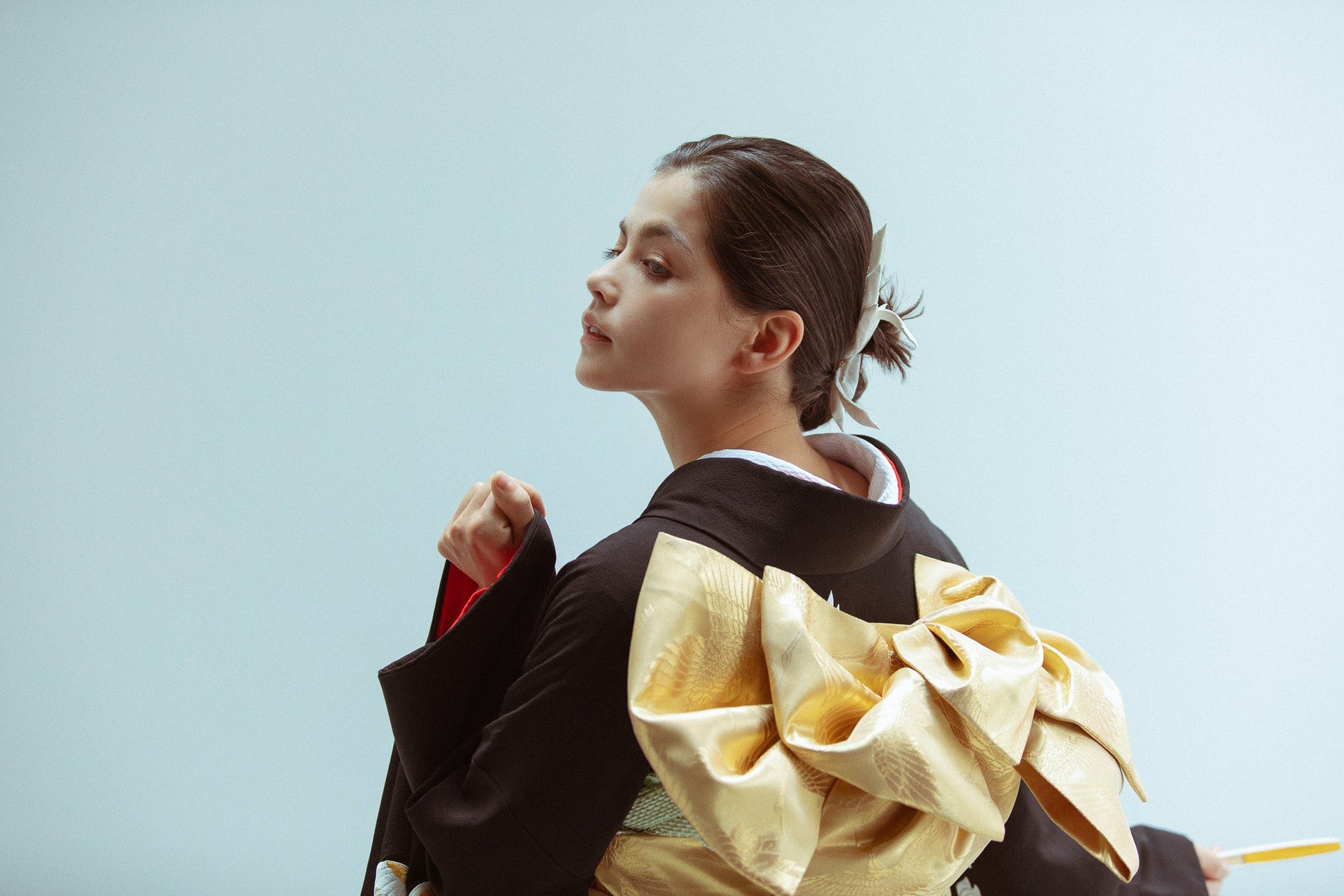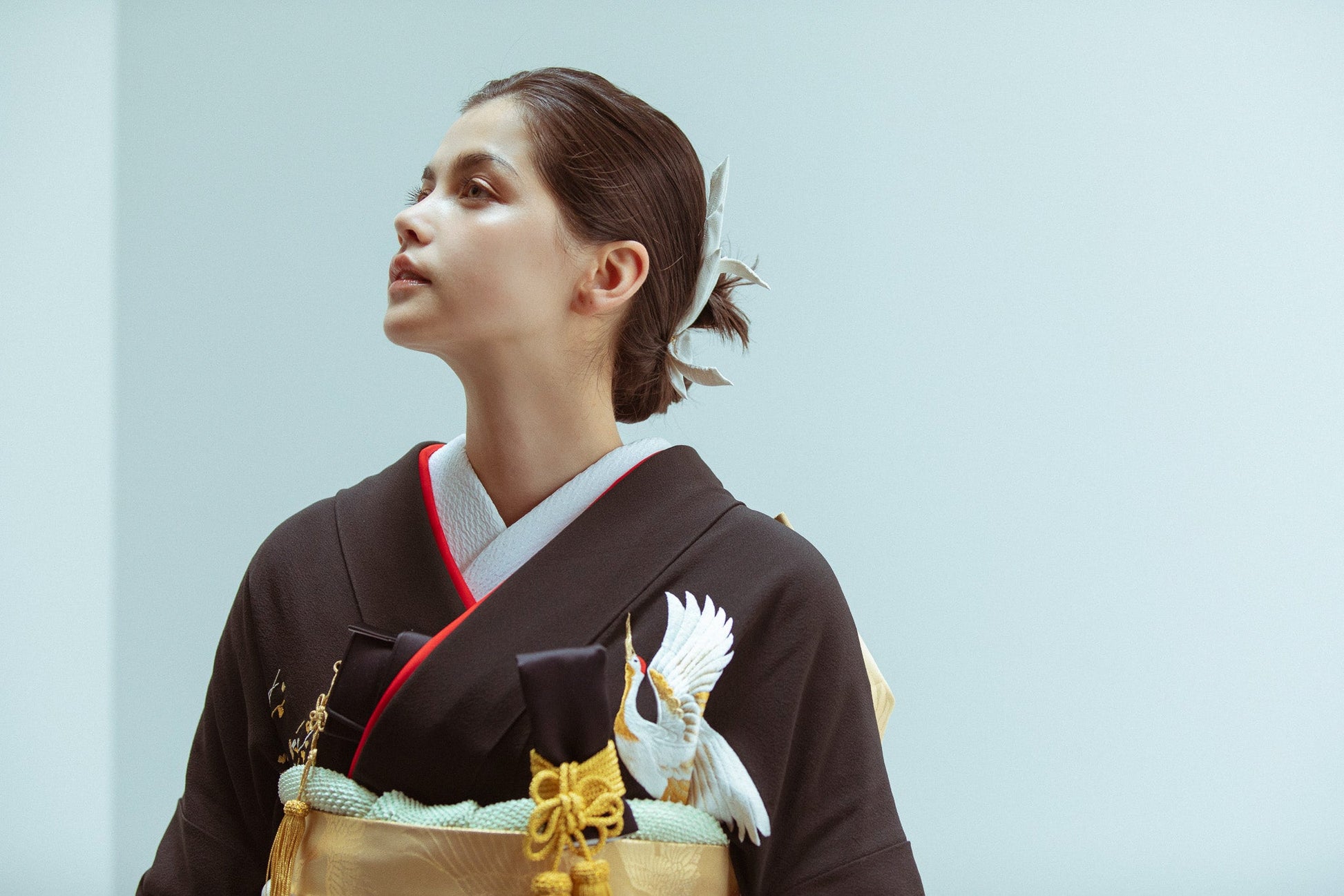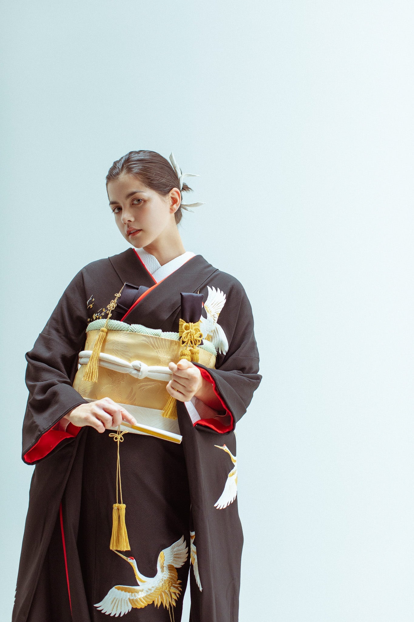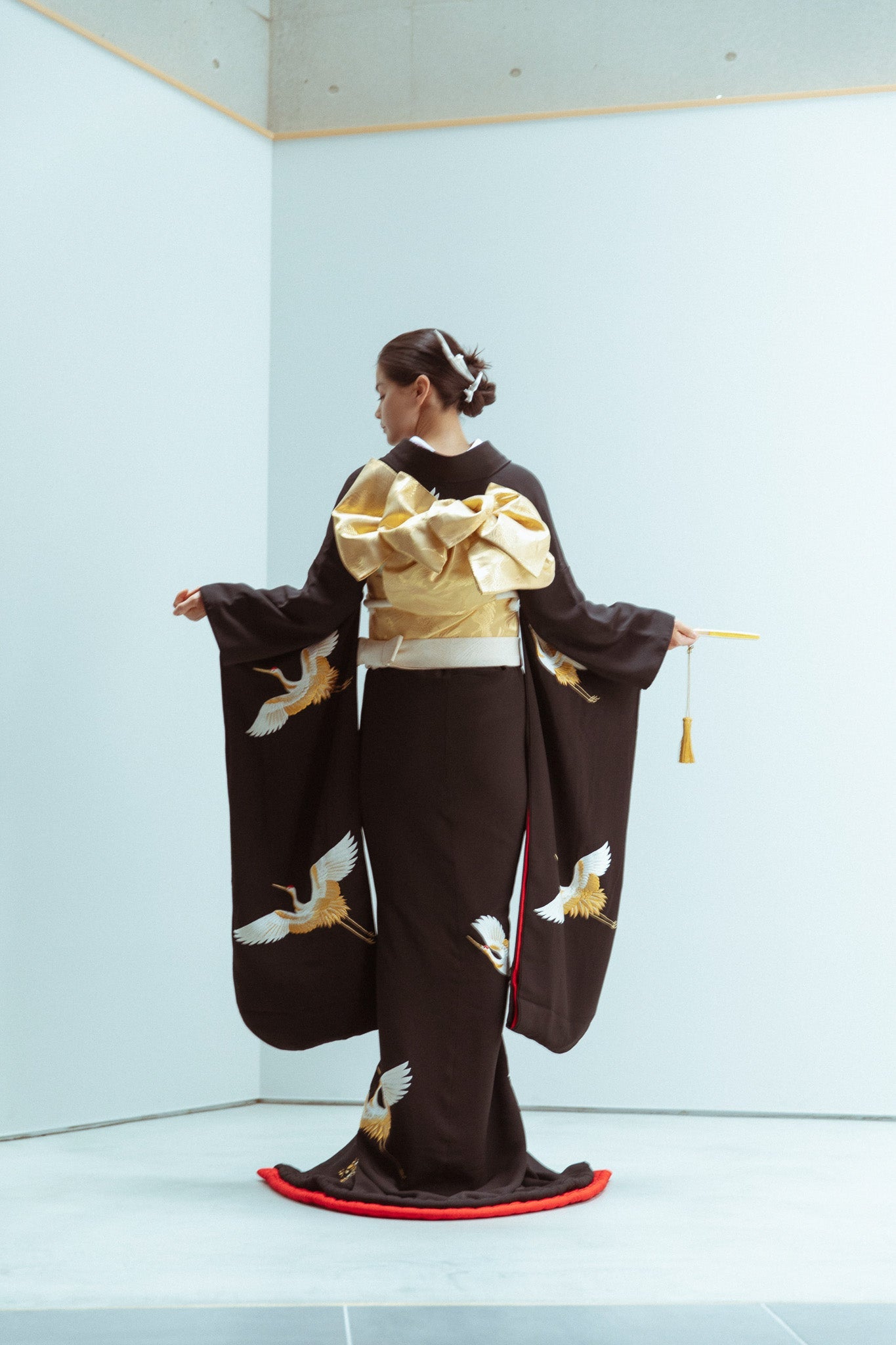 黒地ちりめん鶴【結婚式 和装 引き振袖 レンタル】