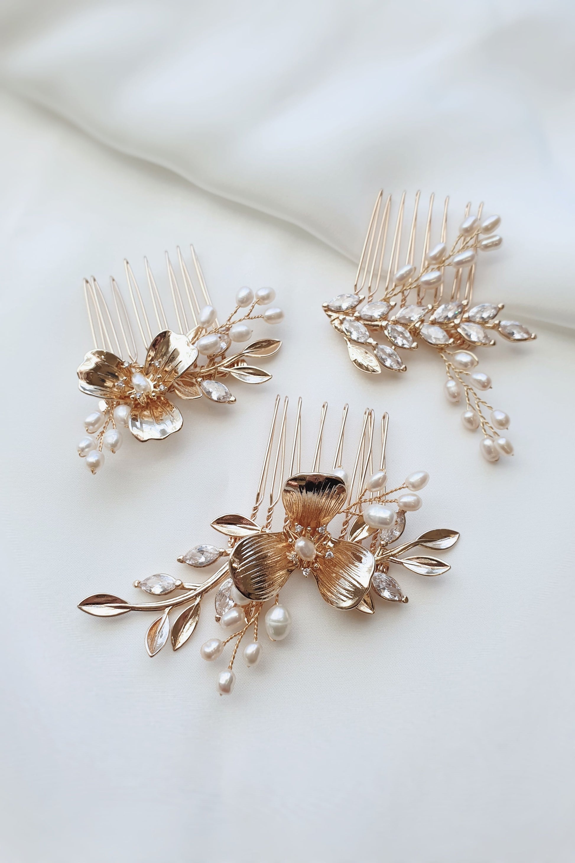 淡水パールとジルコニアストーンが上品に輝くフラワー&リーフモチーフのヘアコームセットです。