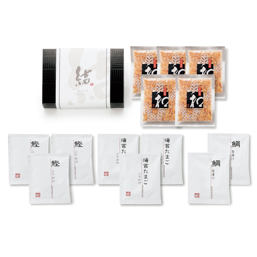 かつおの旨みを凝縮した鰹節やおめでたい鯛の身が入った鯛茶漬けなど、ご飯の美味しさを引き立てるたくさんの縁起物をバランスよく揃えた定番ギフトです。