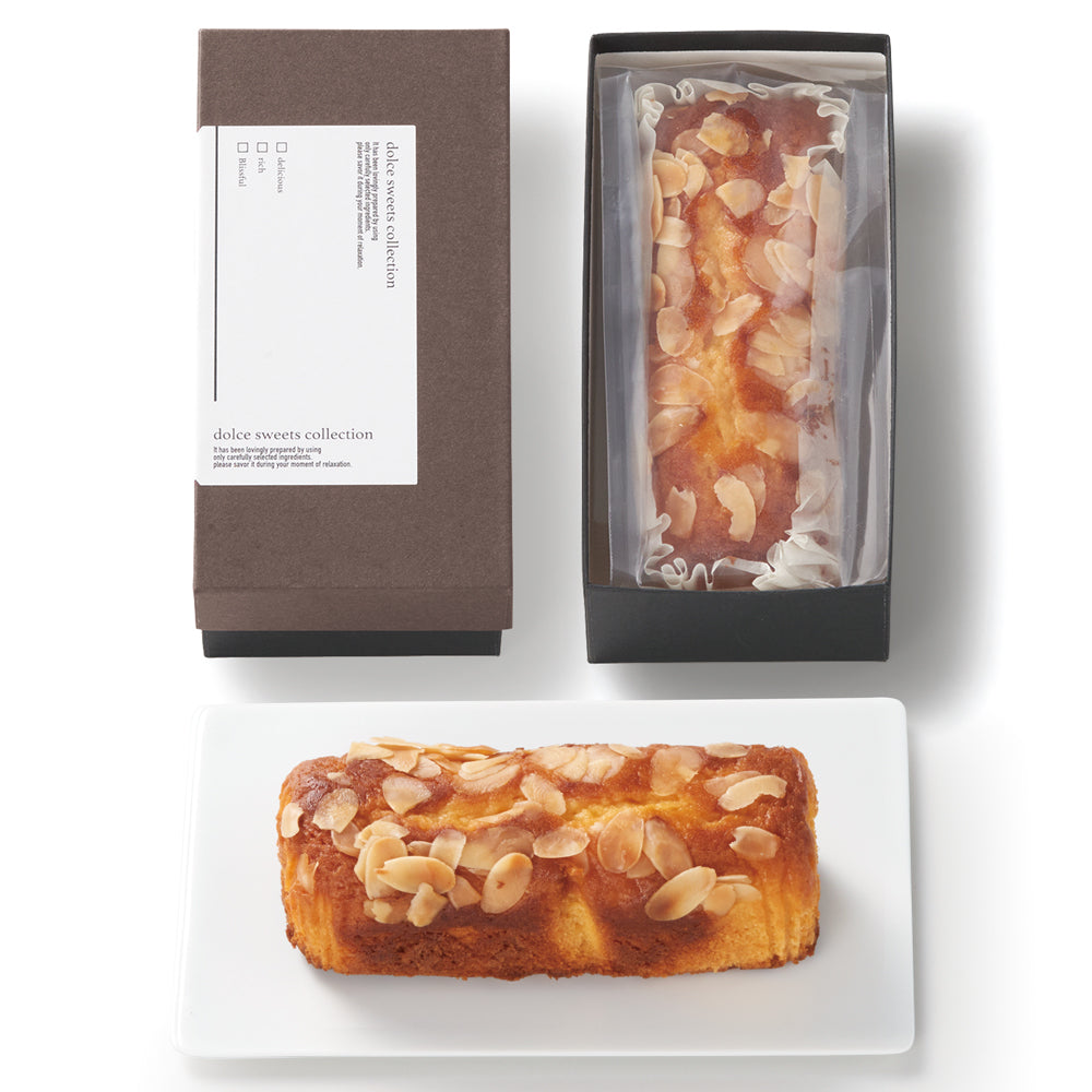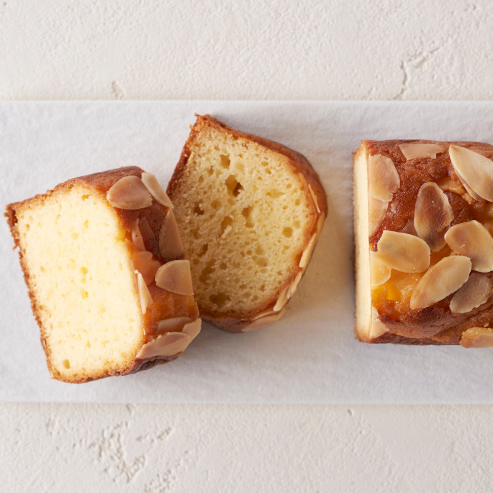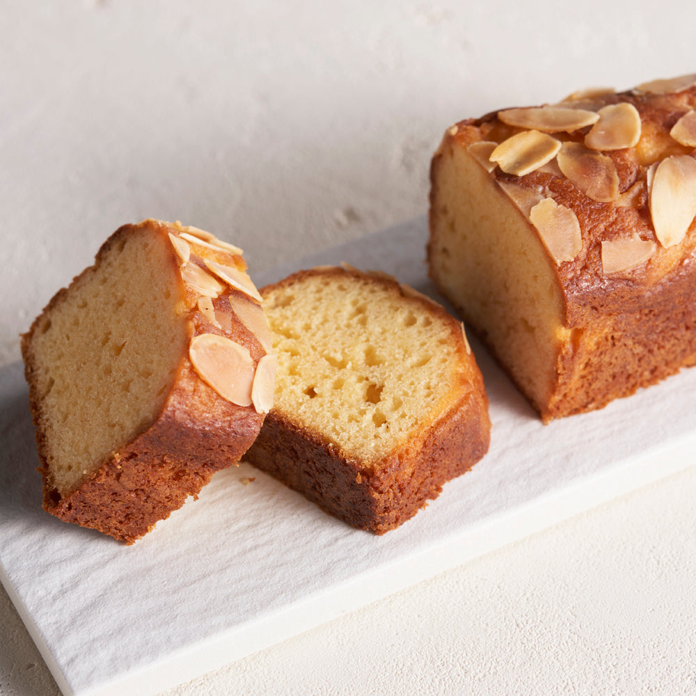 スライスアーモンドをぎっしりとちりばめ、シンプルな素材で焼き上げたしっとりプレーンな生地のパウンドケーキ。