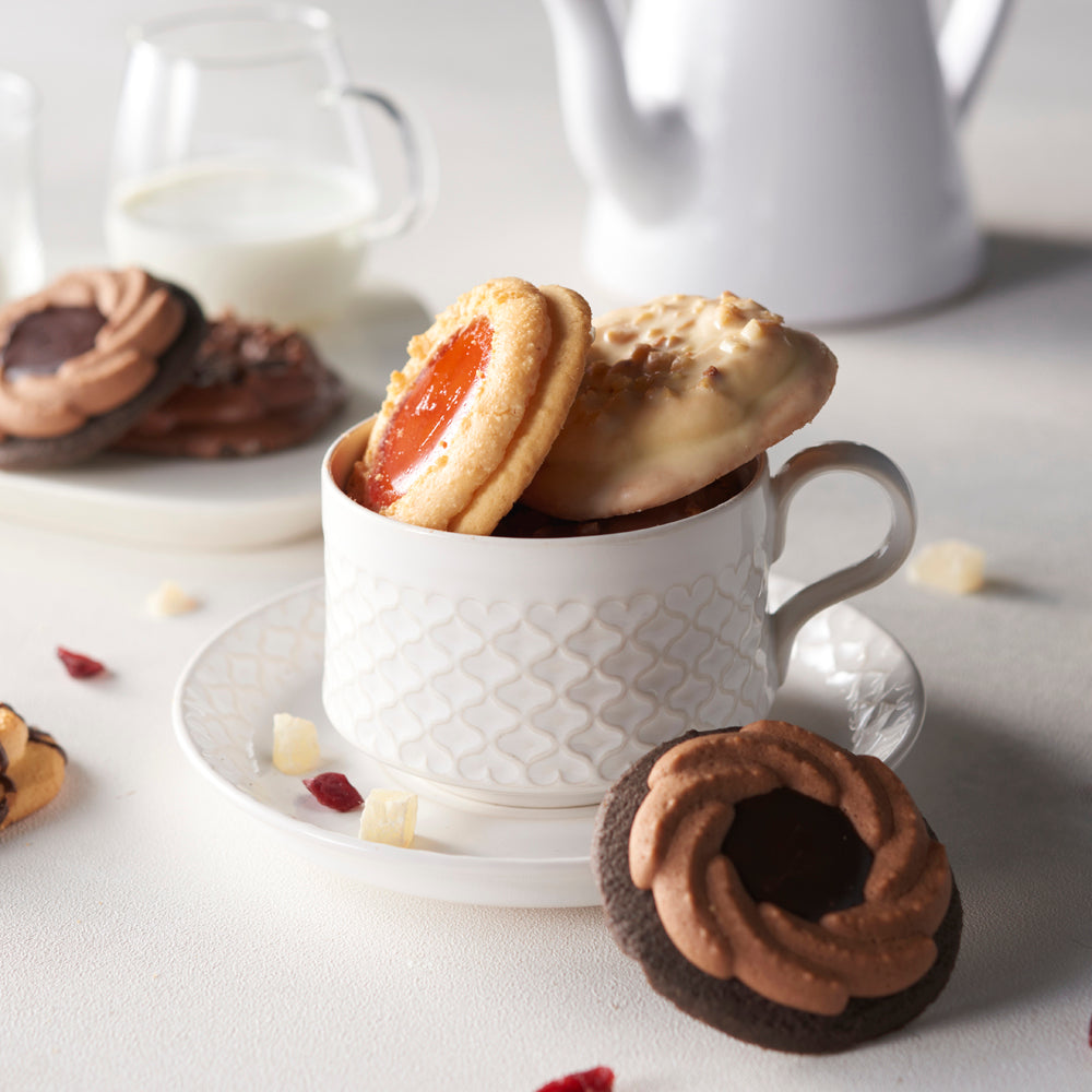 2種類の生地を重ねたクッキーにストロベリージャムやチョコレート、ナッツをトッピングした目にも楽しい華やかなスイーツです。