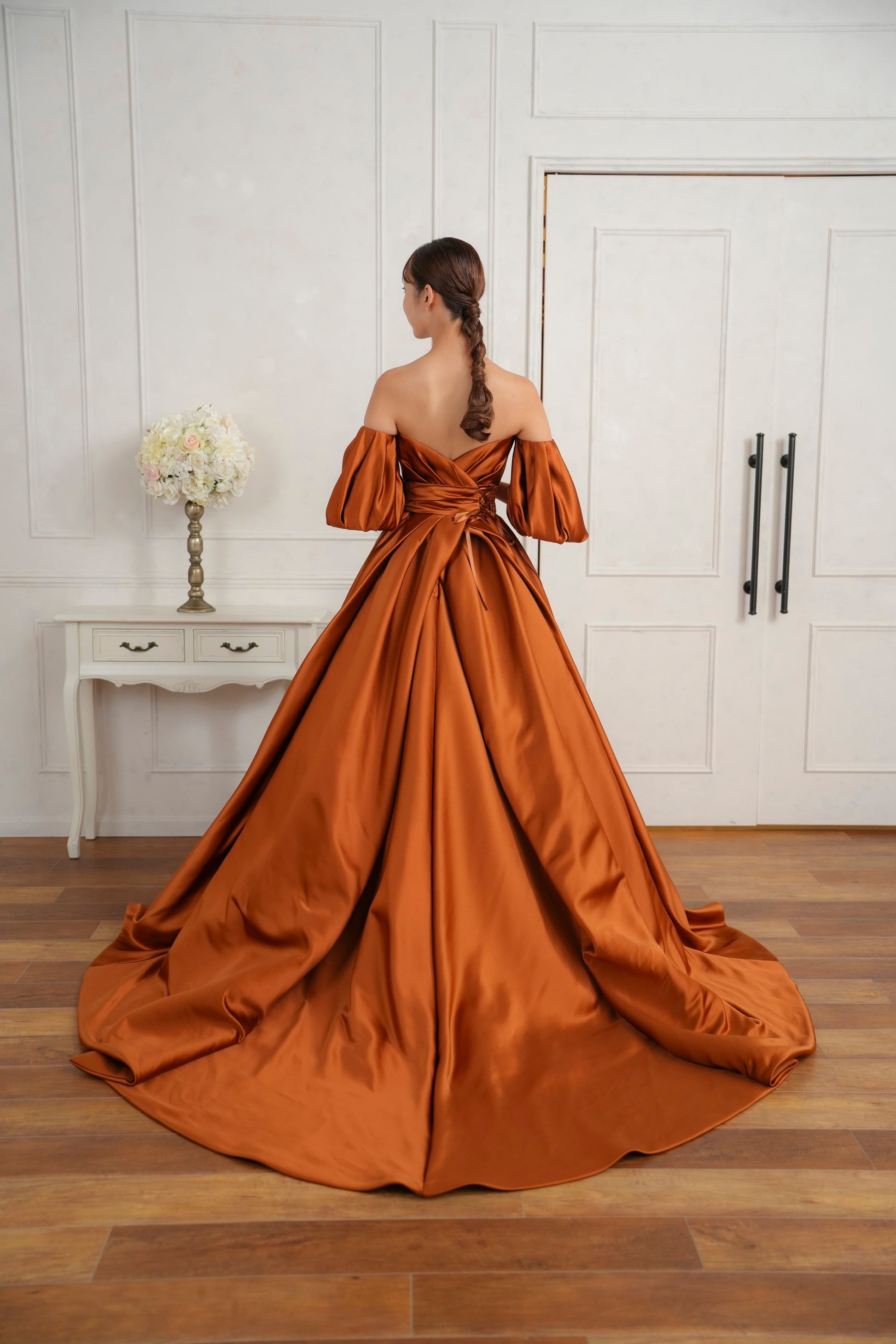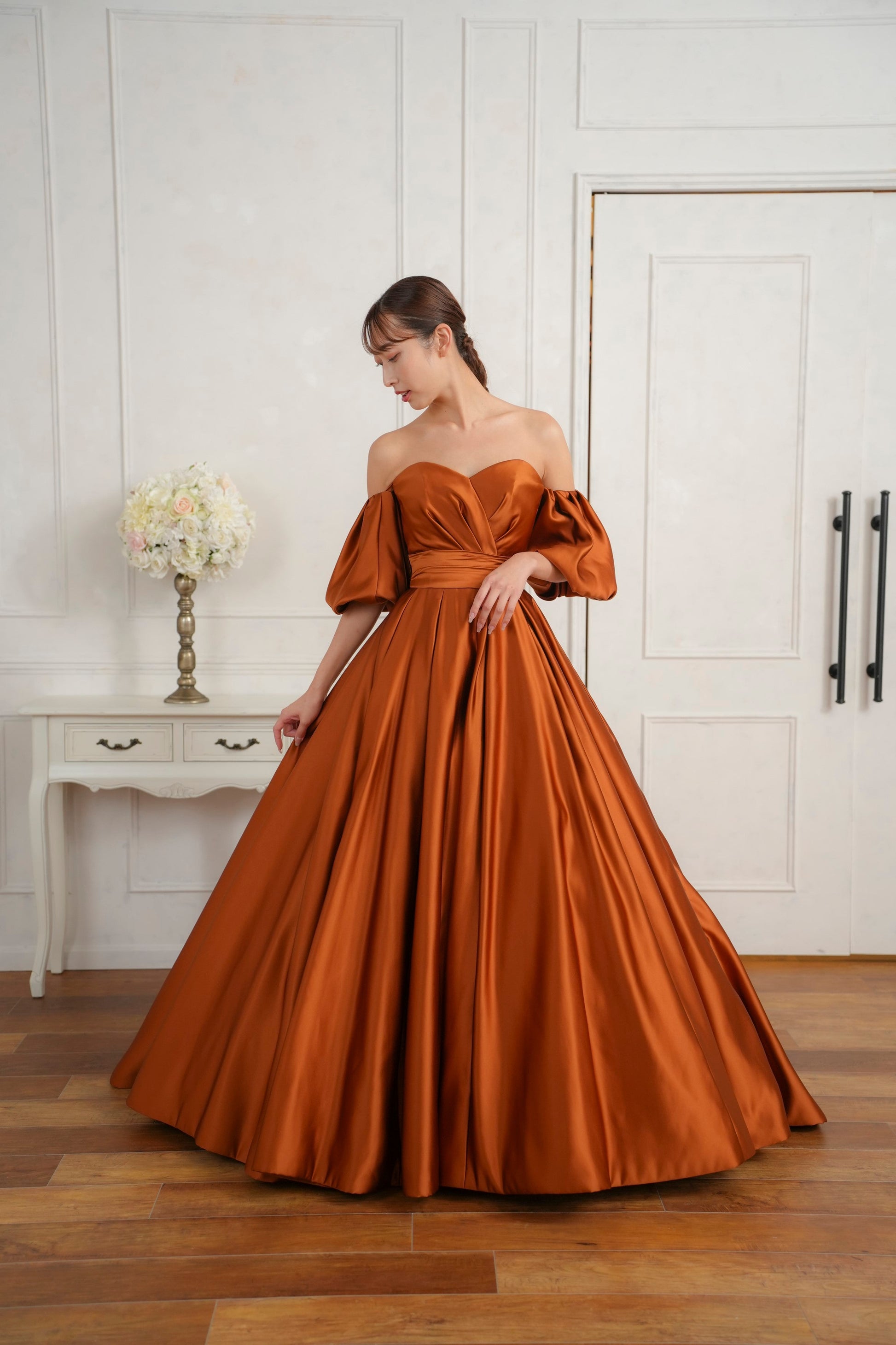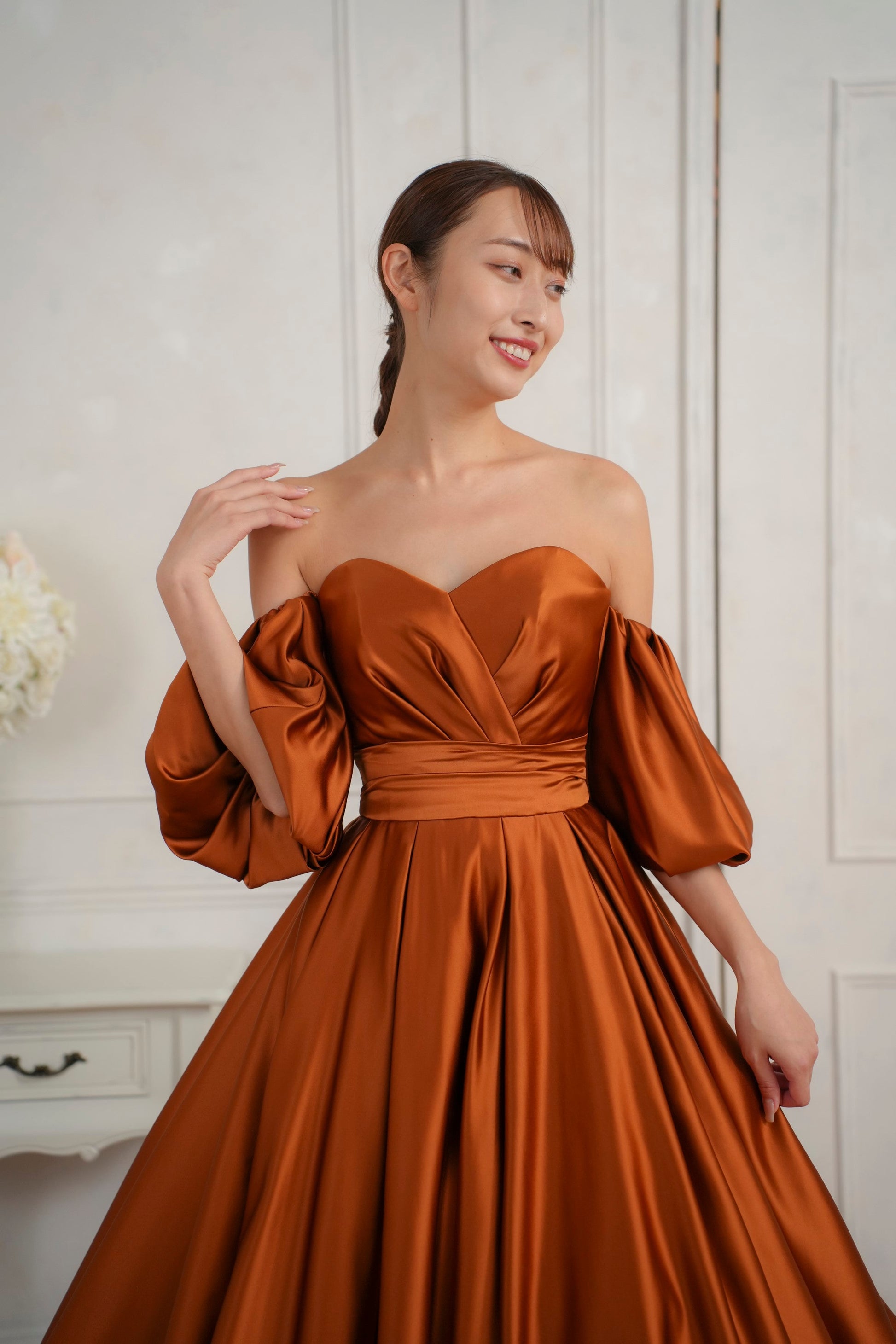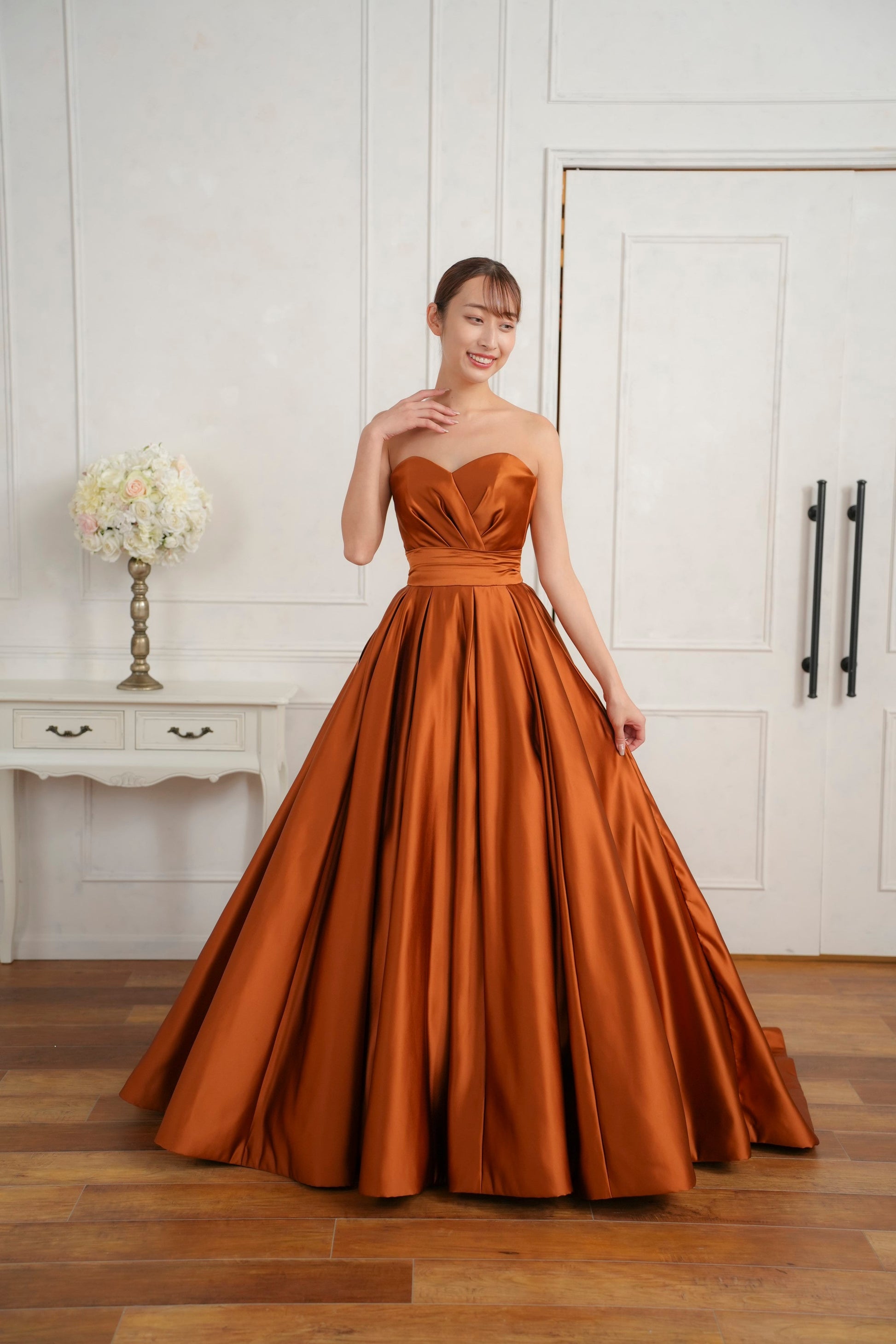 上質なサテンが美しい光沢を放つテラコッタのカラードレス。