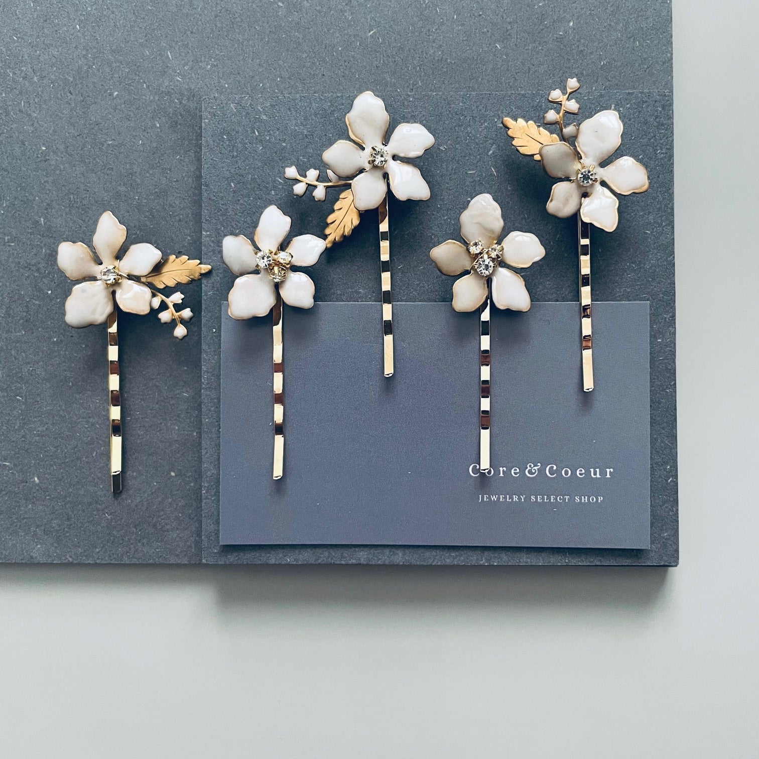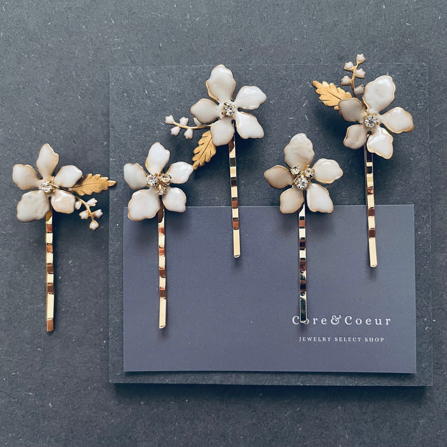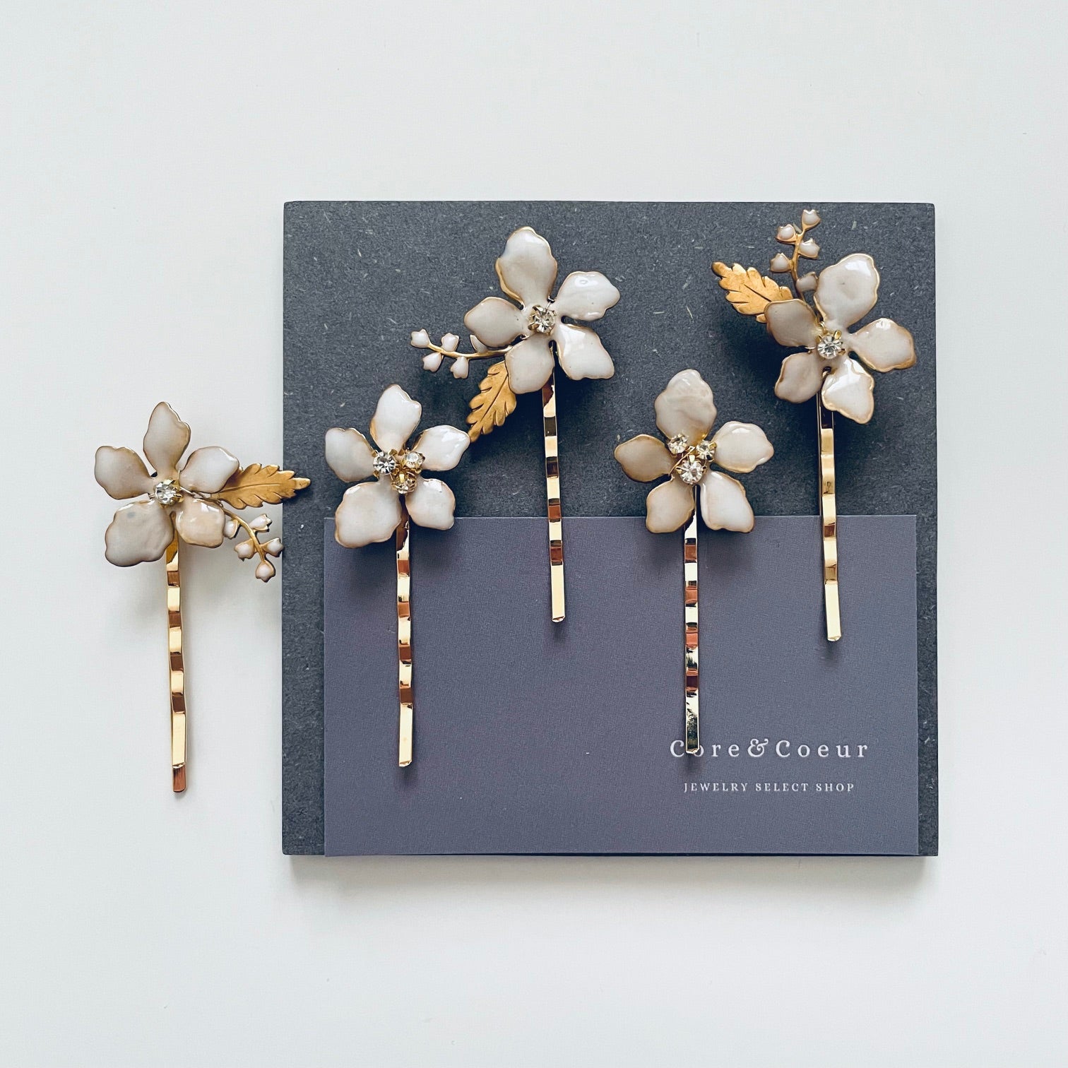 お花の中心にはクリスタルをあしらい華やかな煌めきをプラス。