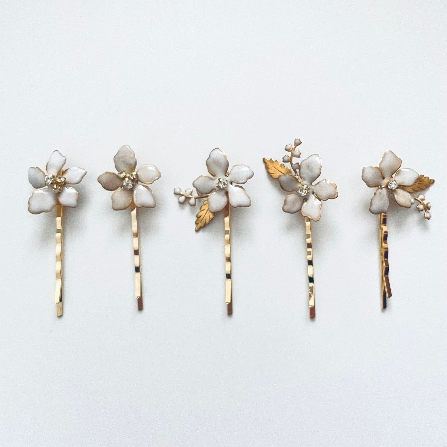 小さなリーフを添えたピン3本とフラワーのみ2本の5本セットです。