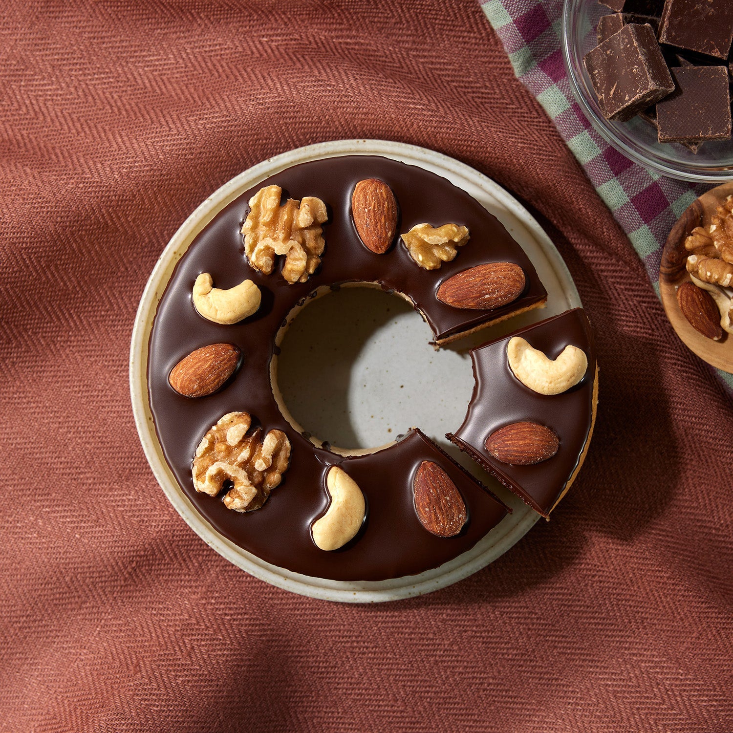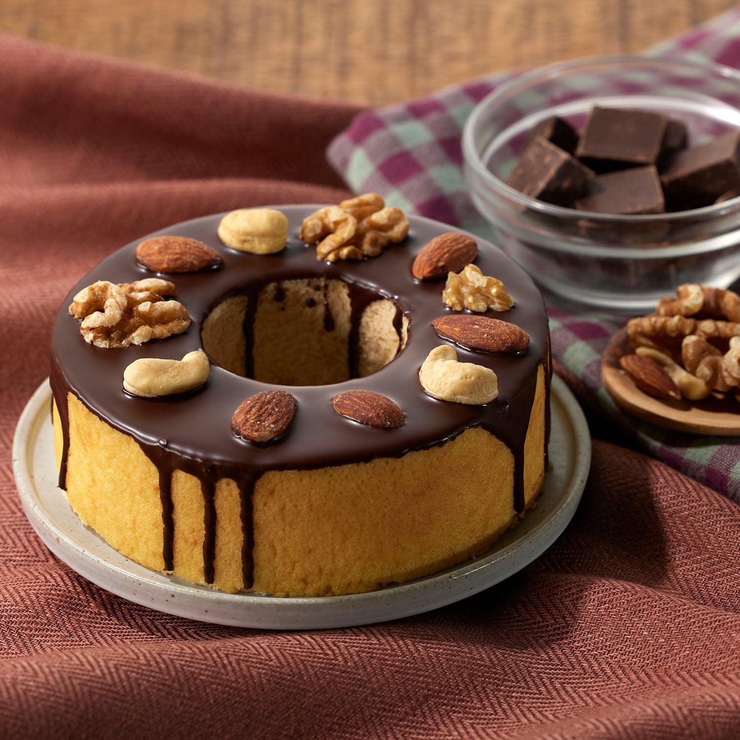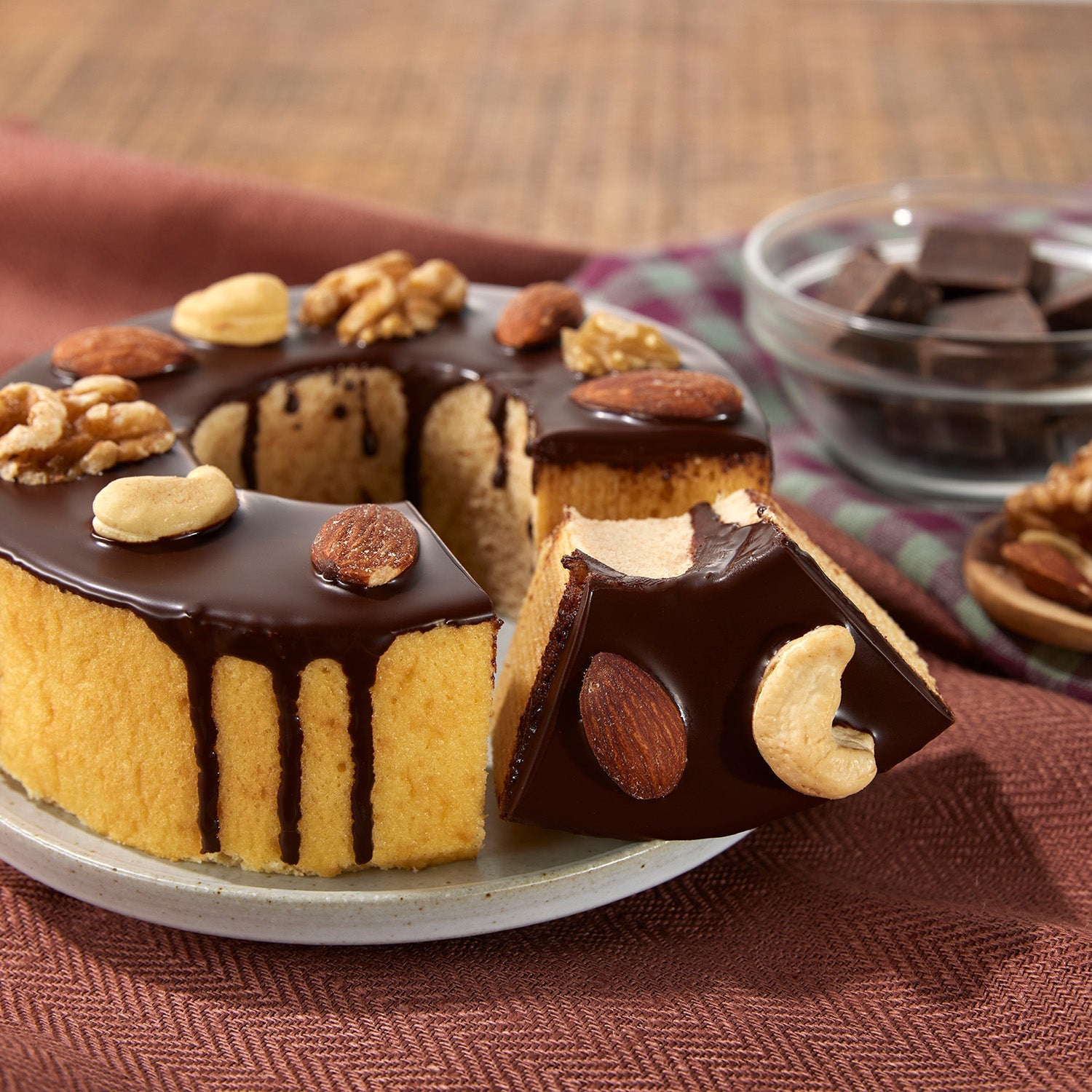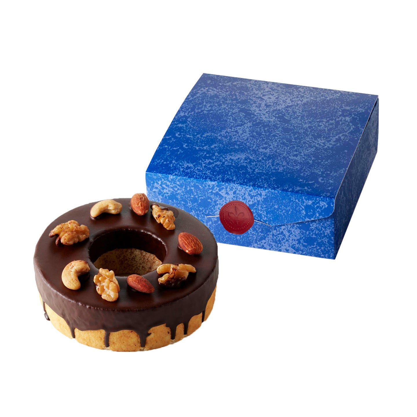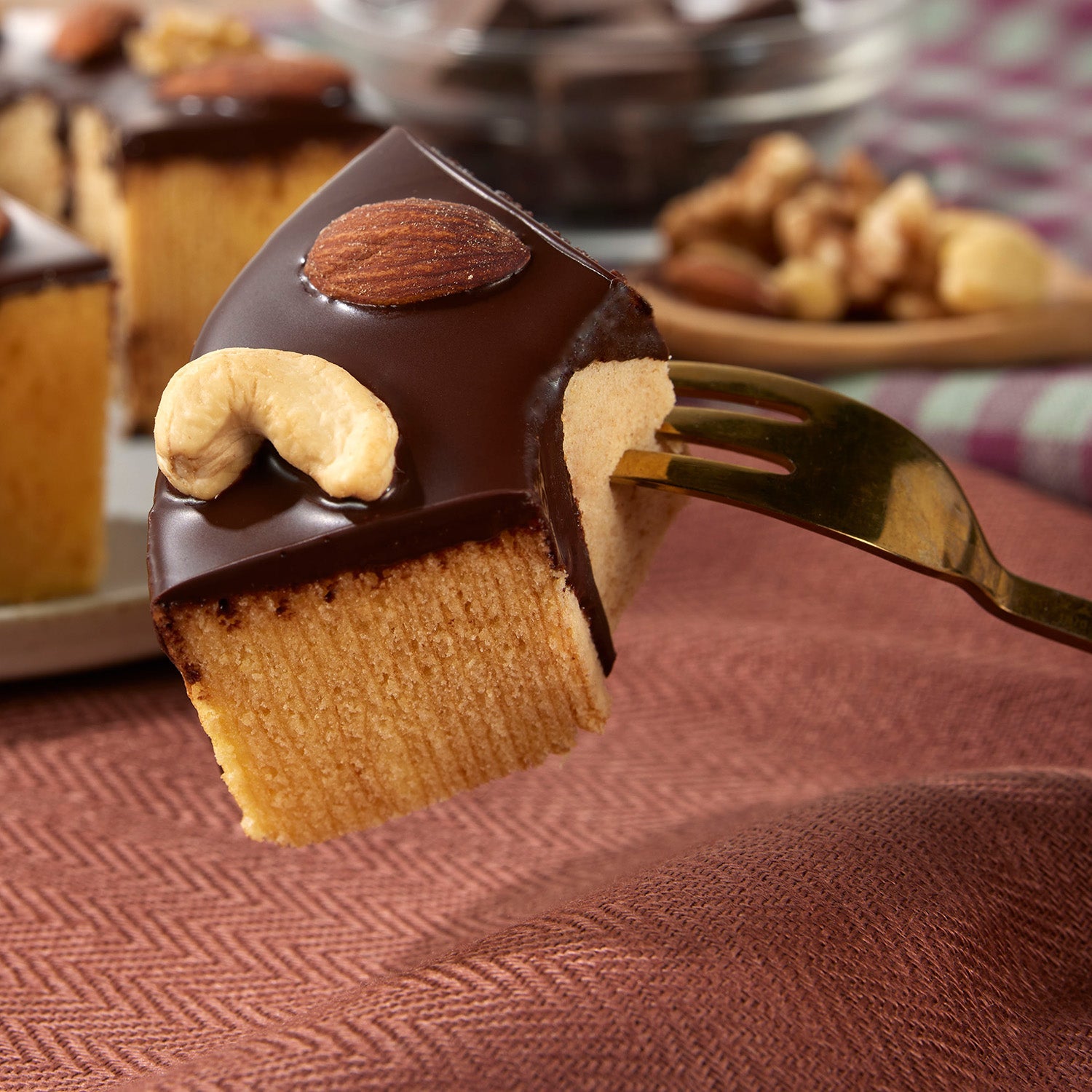 素材本来の味を活かしたバウムクーヘンにチョココーティングとナッツをトッピングした贅沢なバウムクーヘン。