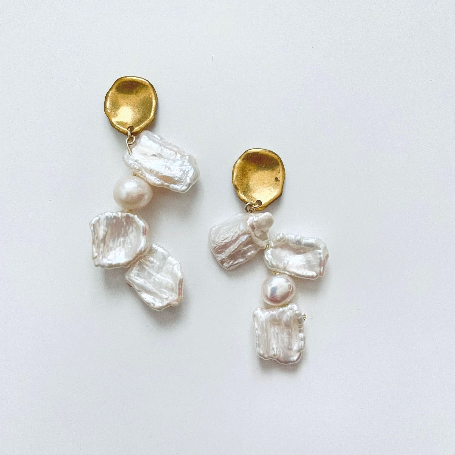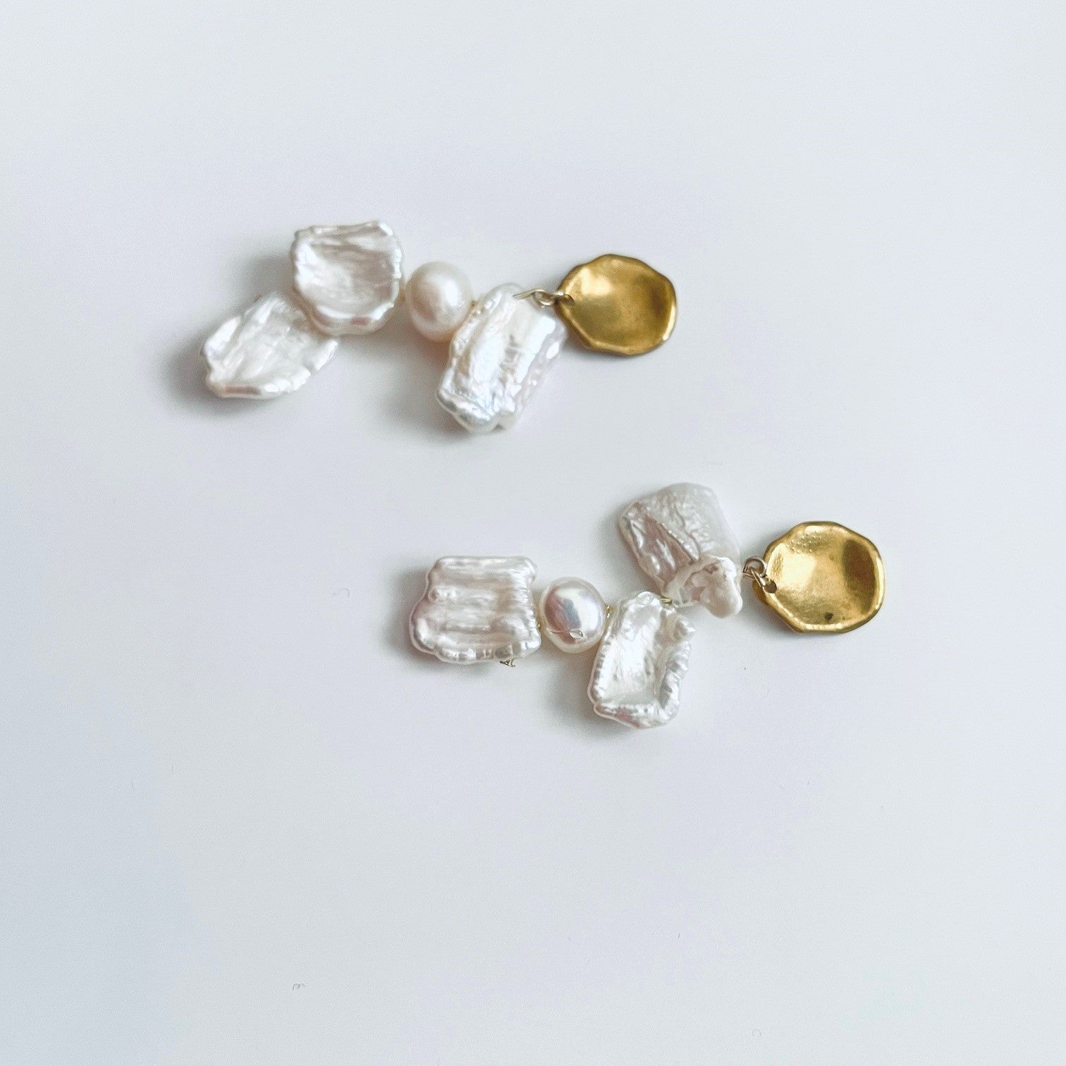 個性のある形のケシパールと淡水パールを組み合わせた左右アシンメトリーのデザインは、一際目を引く存在感を放ちます。