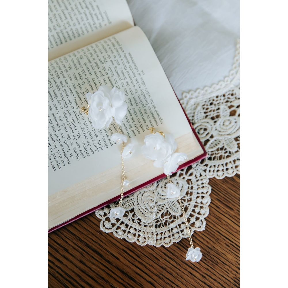 デザイナーの手によって一つ一つ手作りされた美しい花々が、花嫁様のお耳元を優しく彩ります。