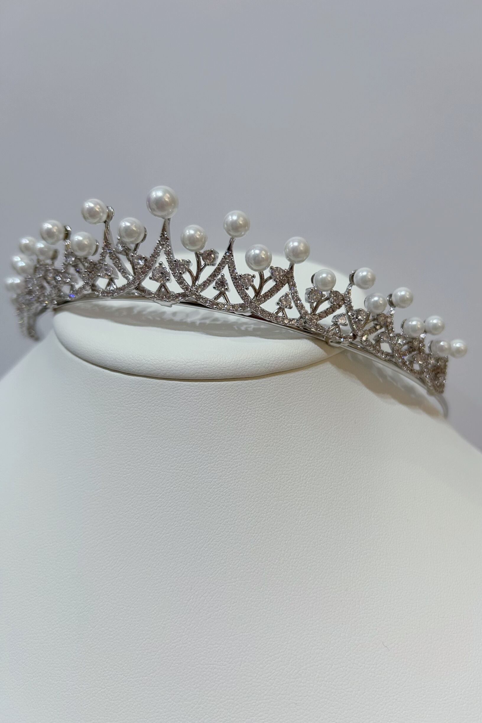 ジルコニアストーンとイミテーションパールを使用したティアラです。
