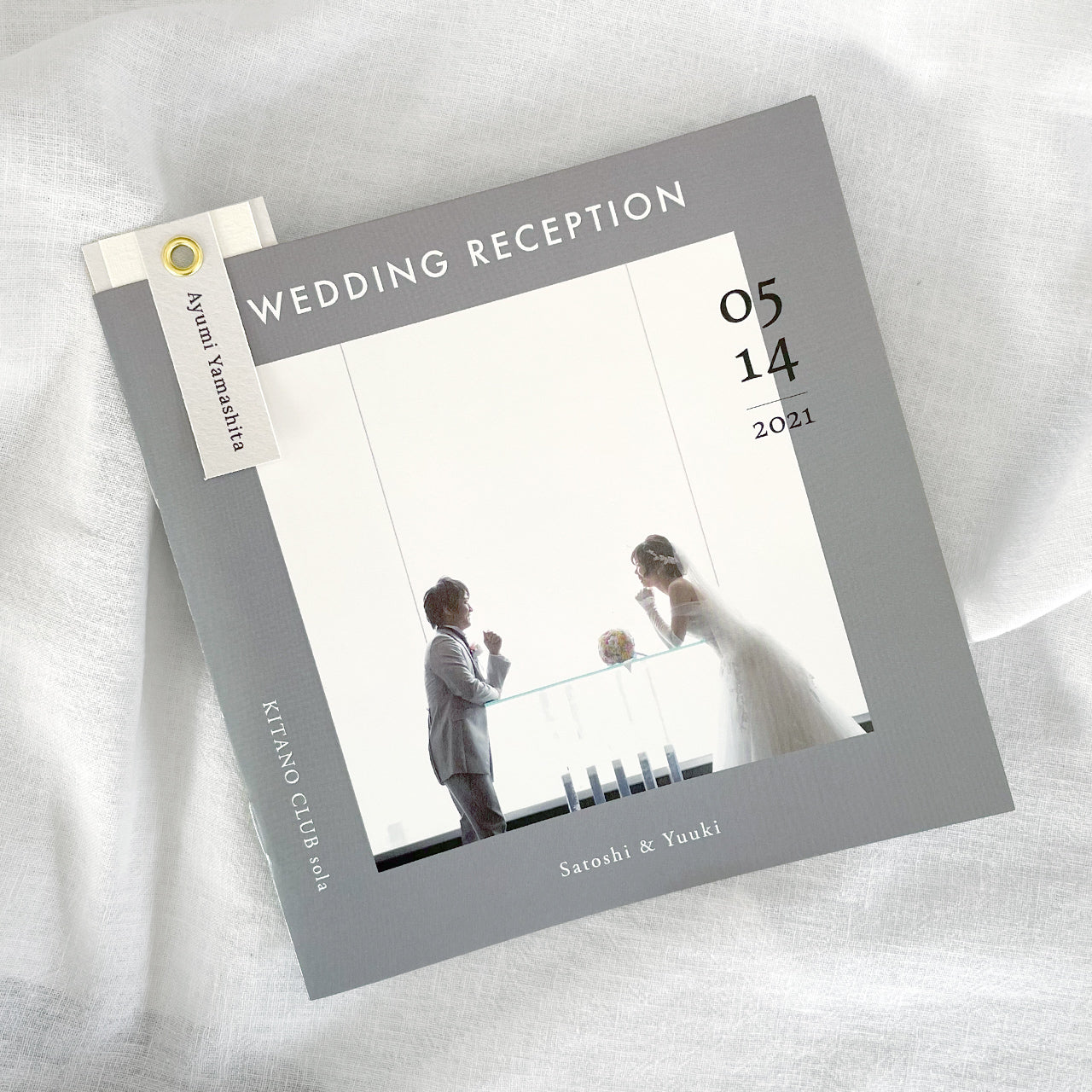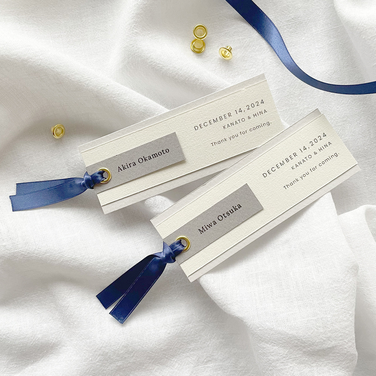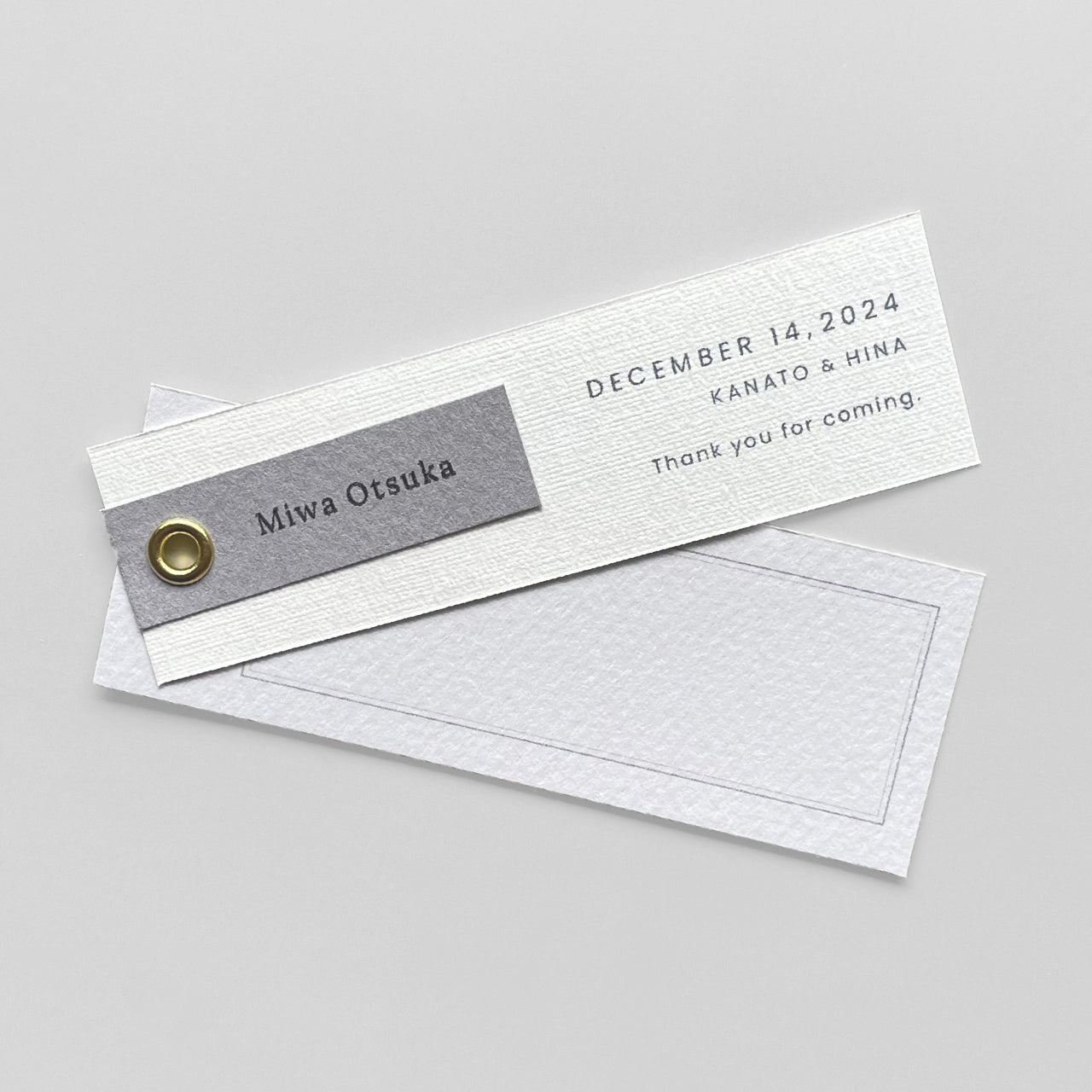 ゲストのお名前タグとカードをハトメで綴じた、しおり型の席札。