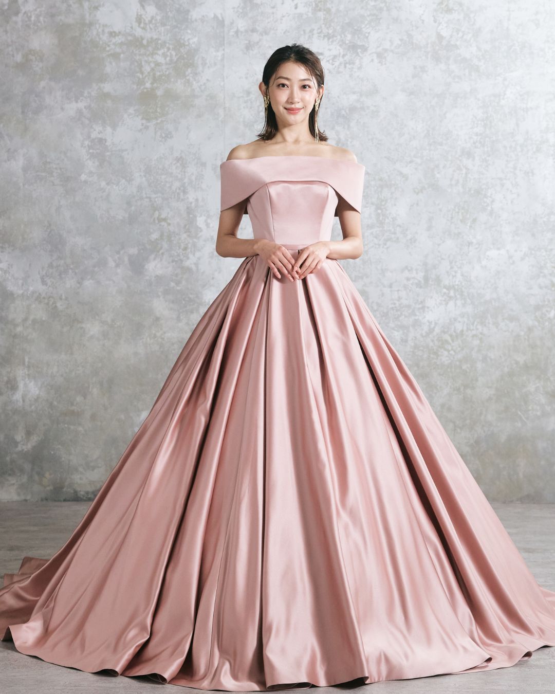 カッティングの美しさに心奪われるAラインドレスは、サテン地のしなやかさと上品な光沢感が、グレイッシュなピンクカラーをシックで上品に彩ります。