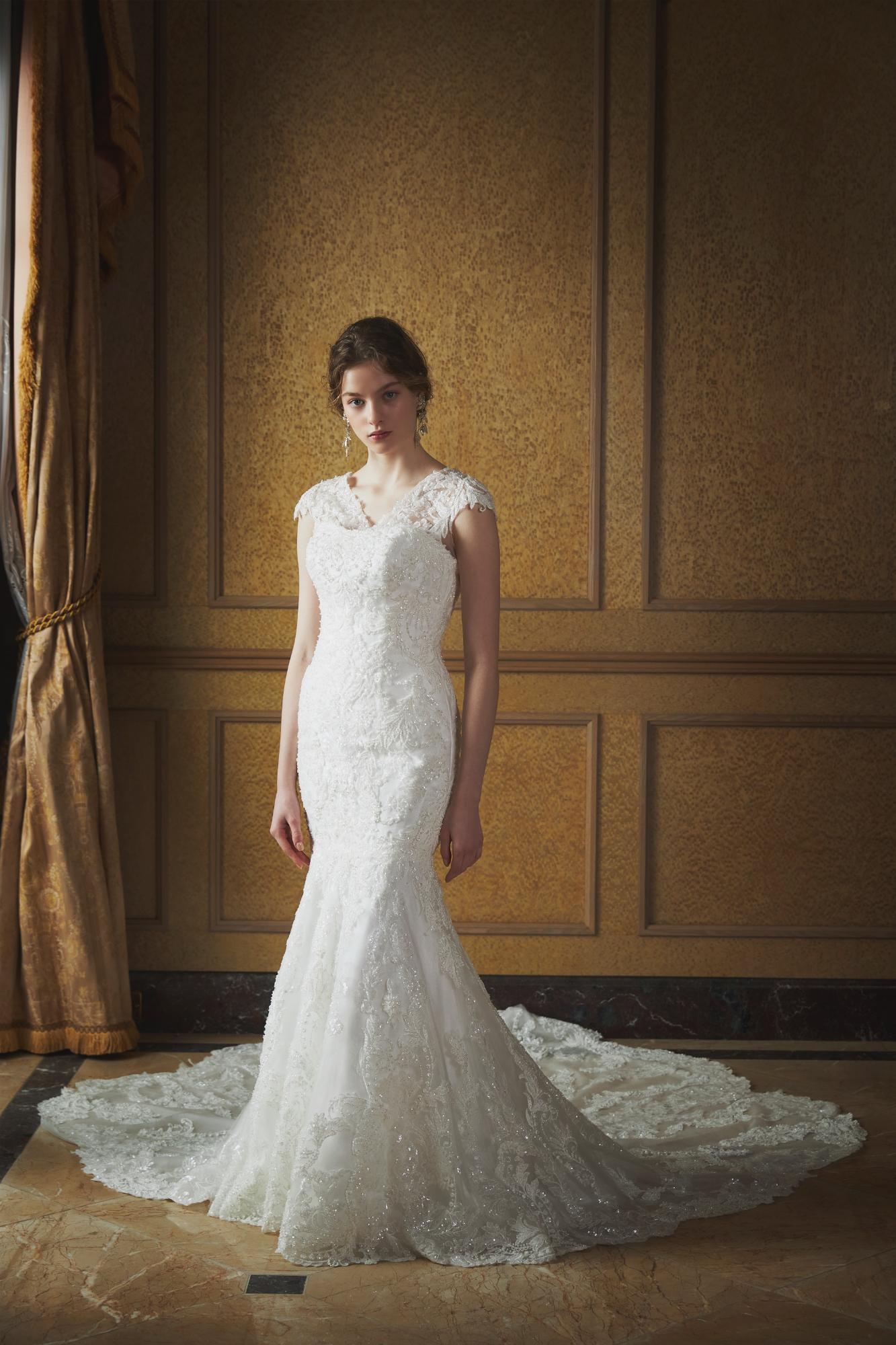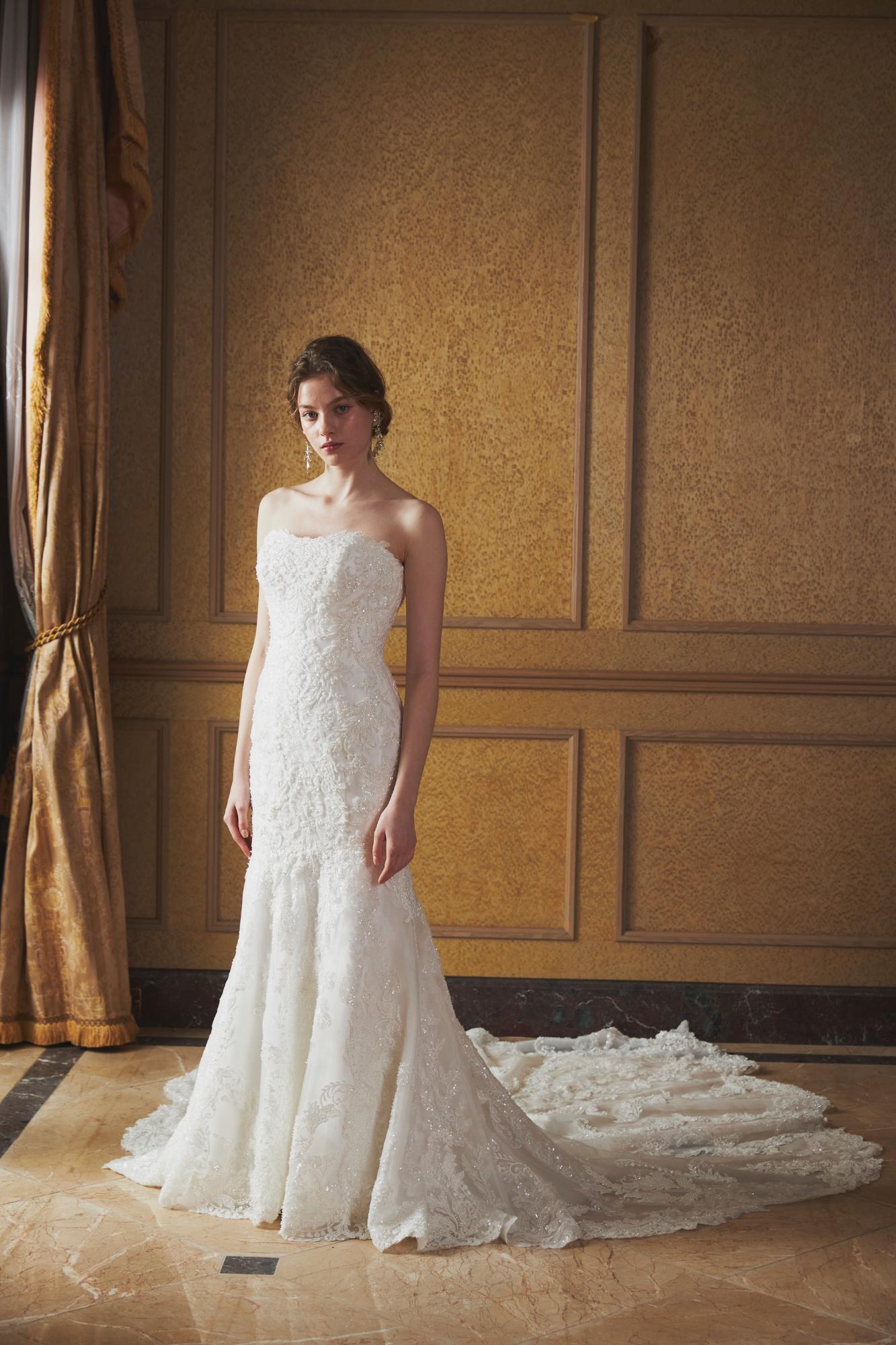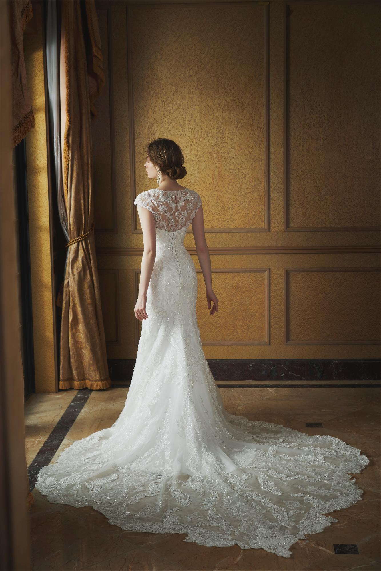レースのヨークとVカットのトレーンでバックスタイルも魅了する。