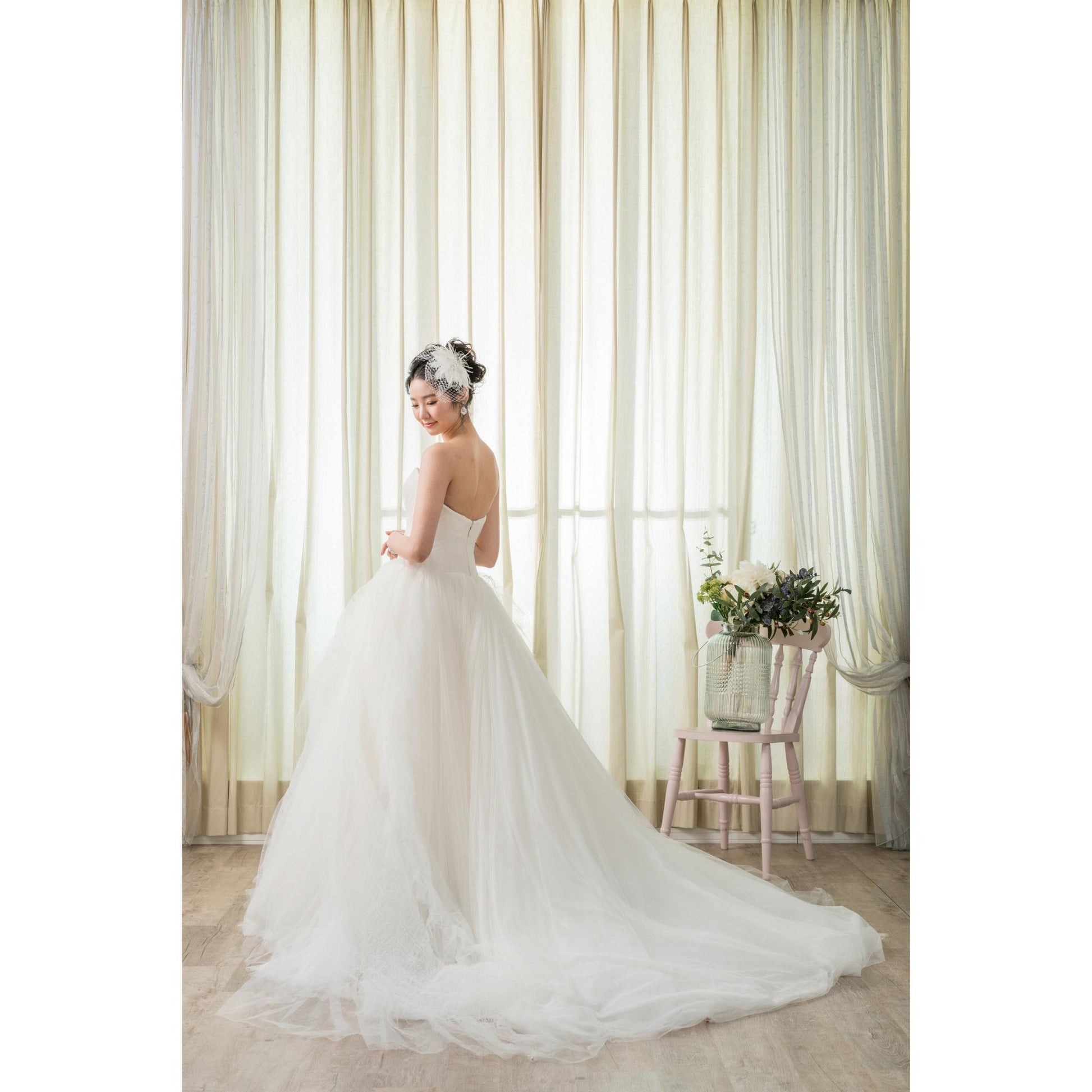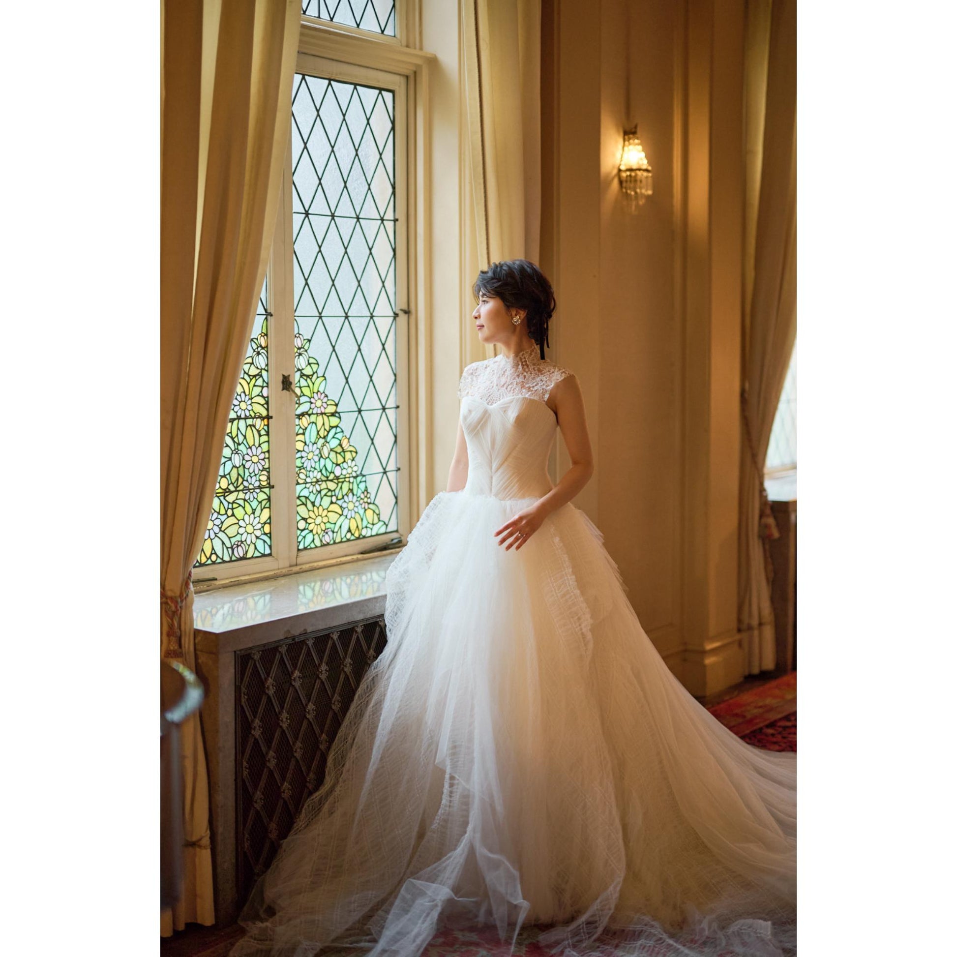 オクタヴィアの最大の特徴はチェック模様の繊細なチュール!着る花嫁さまによって、可憐にもスタイリッシュにもなる不思議な魅力を持った1着です♡