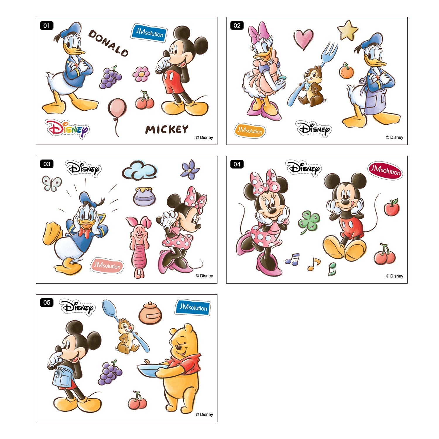 アミノ酸とコラーゲン配合で肌に売るおピを与え健やかな美しい肌へ導くディズニーキャラクターのステッカーが入ったJMsolutionのフェイスマスク
