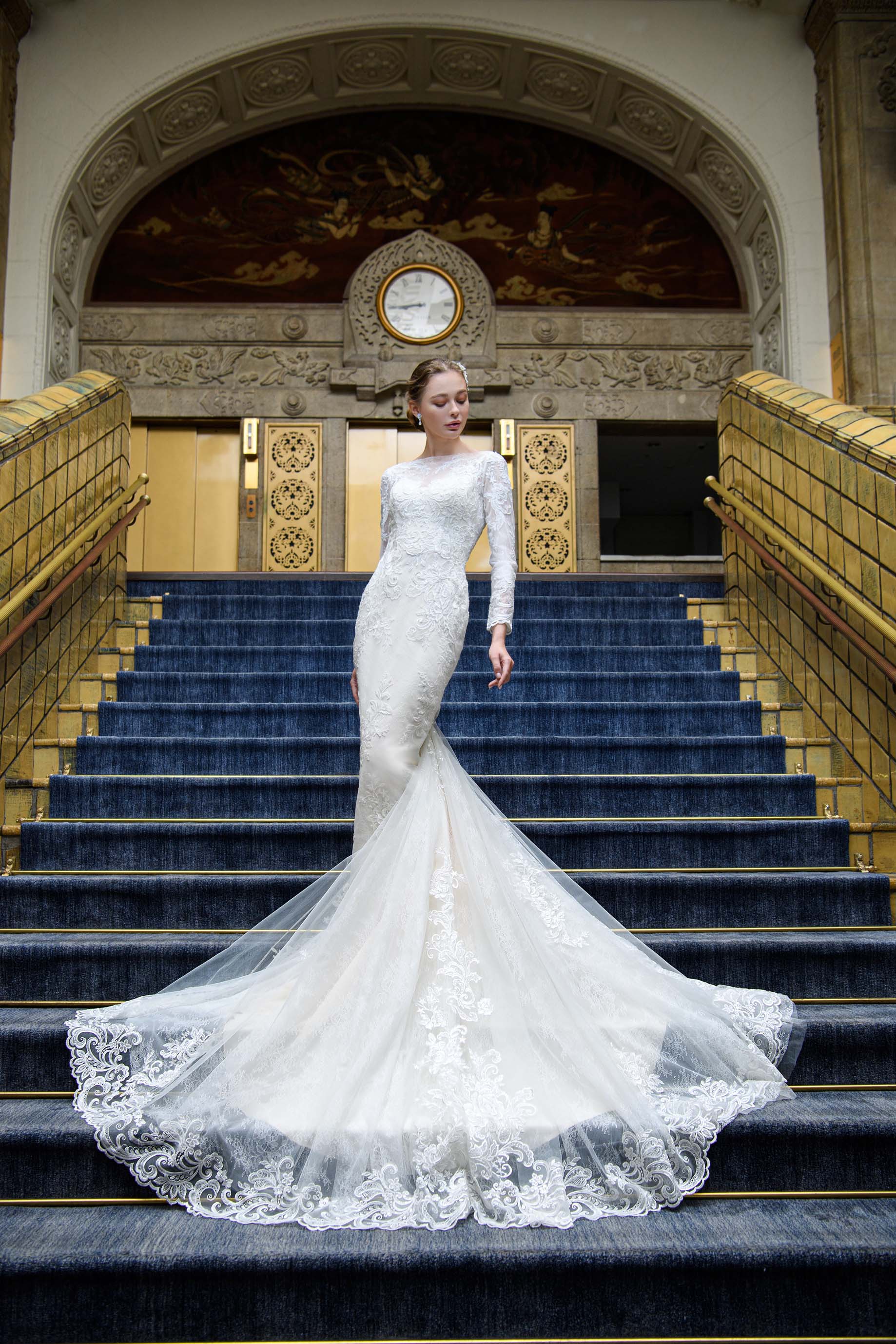 クラシカルモダンな表情を見せる総レースのロングスリーブドレス。