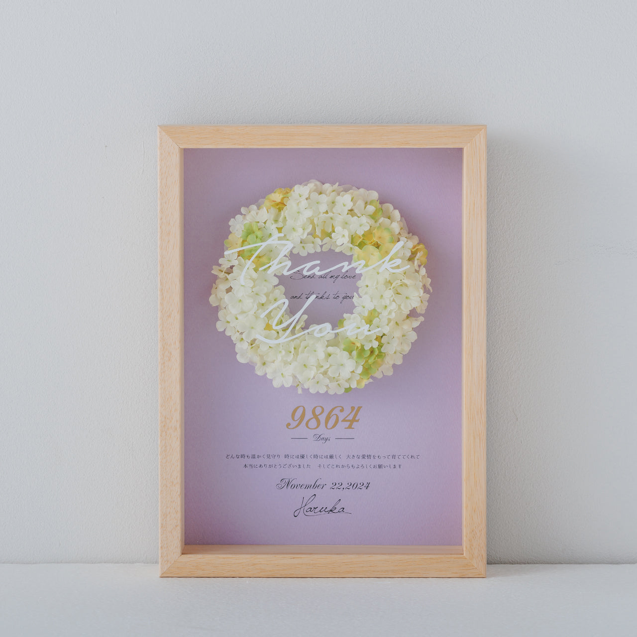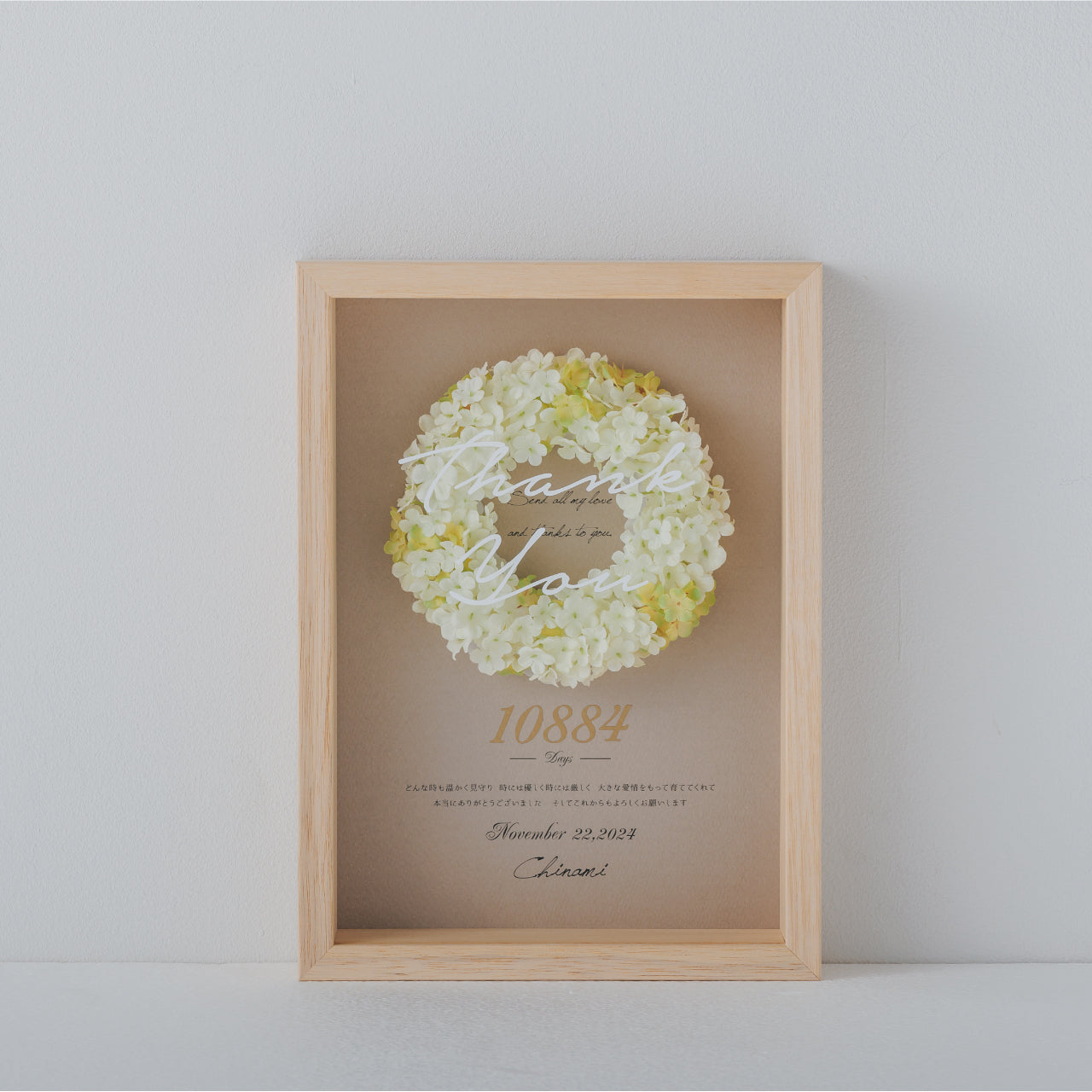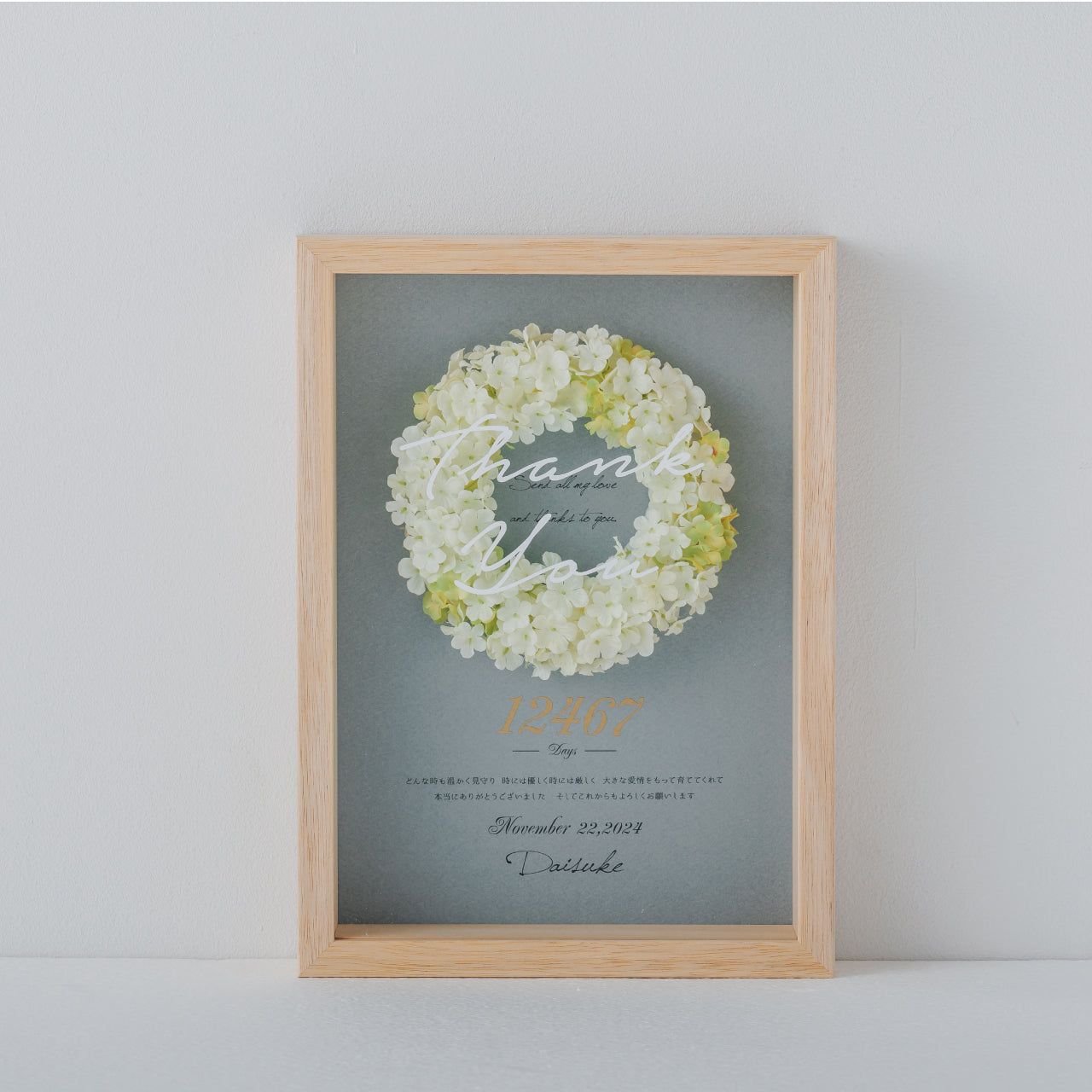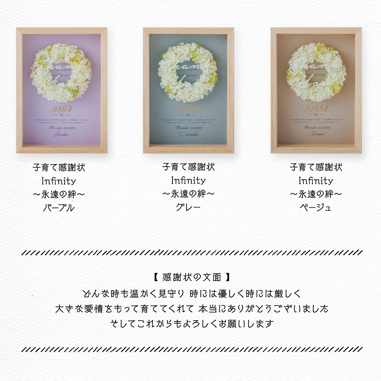 ありがとうの気持ちをホワイトリースに込めたシンプルな落ち着いた感じのある子育て感謝状です。