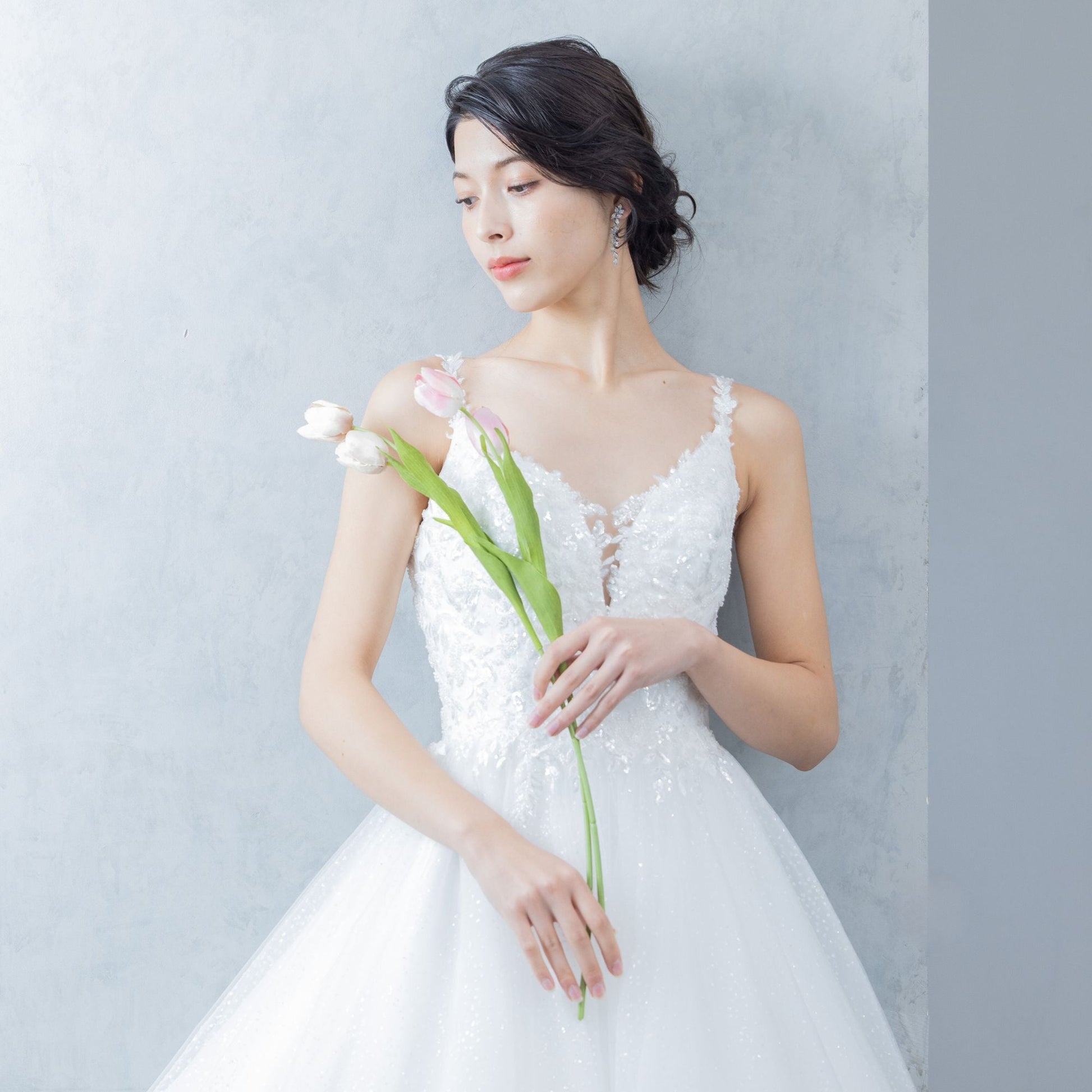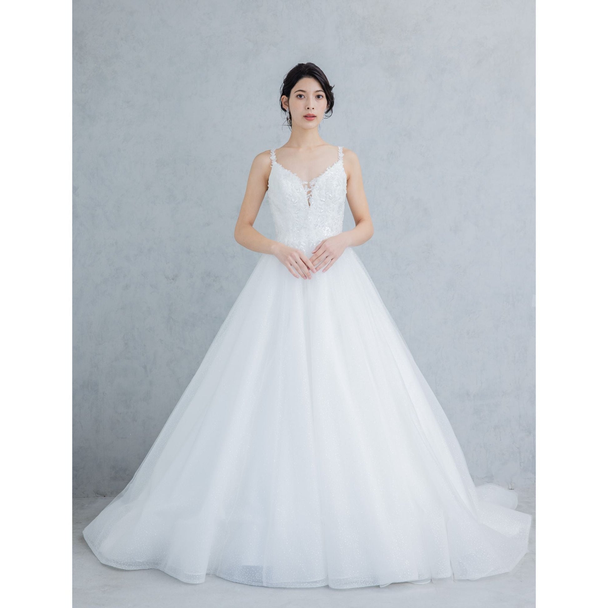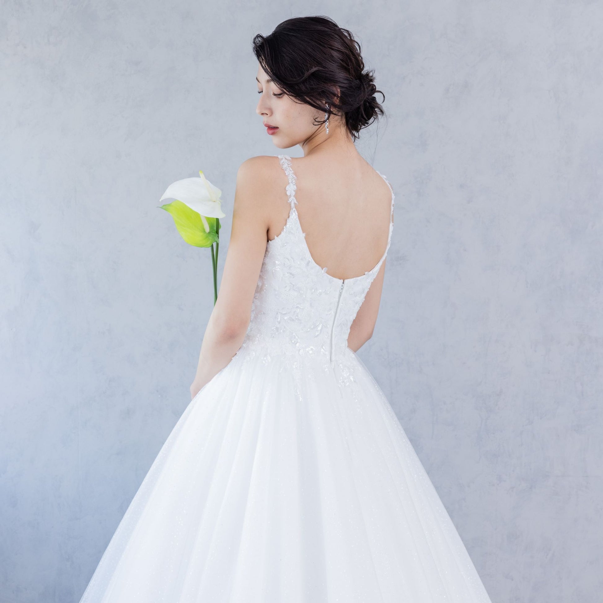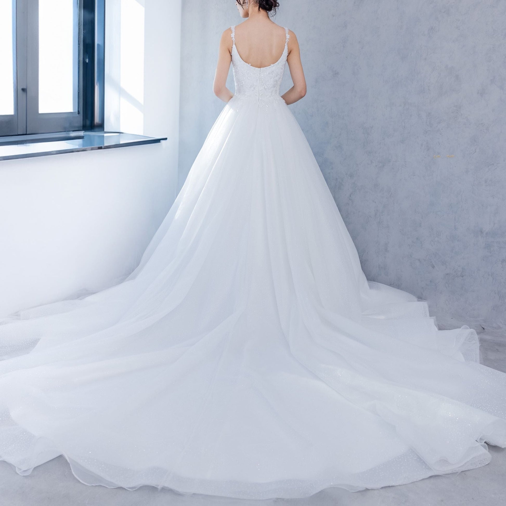 どの角度から見ても輝くグリッターチュールと贅沢なロングトレーンが女性心をくすぐるロマンティックな1着です