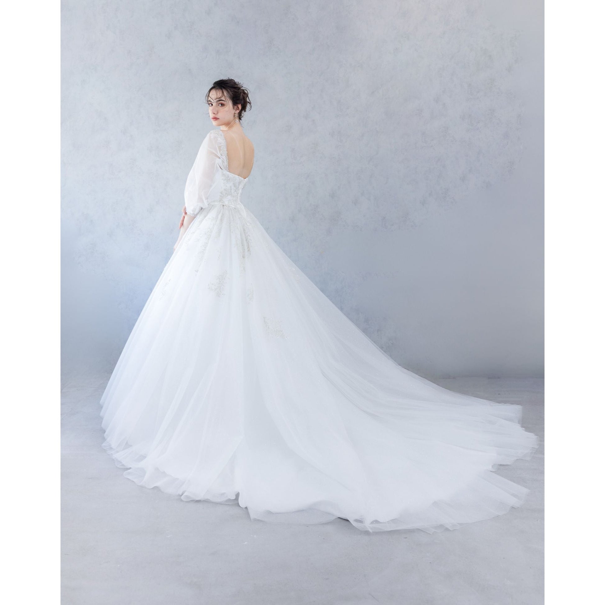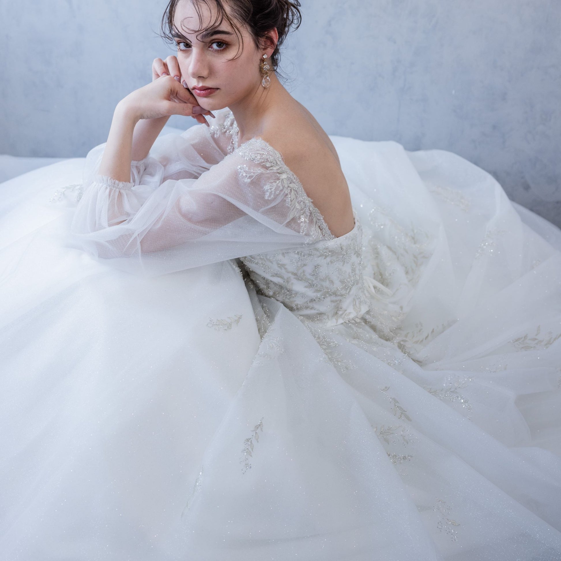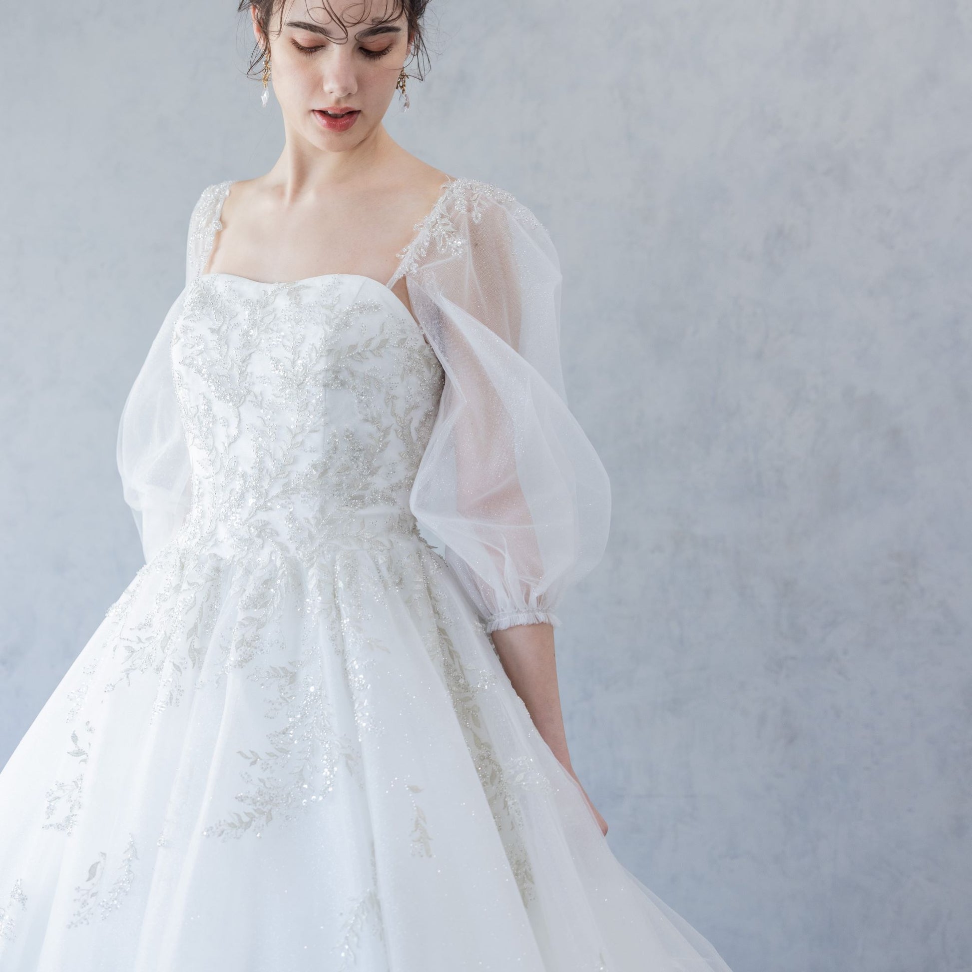 スイートなプリンセスラインのドレス 二の腕や肩回りが気になる方も着用いただきやすい、ロングパフスリーブを採用しました