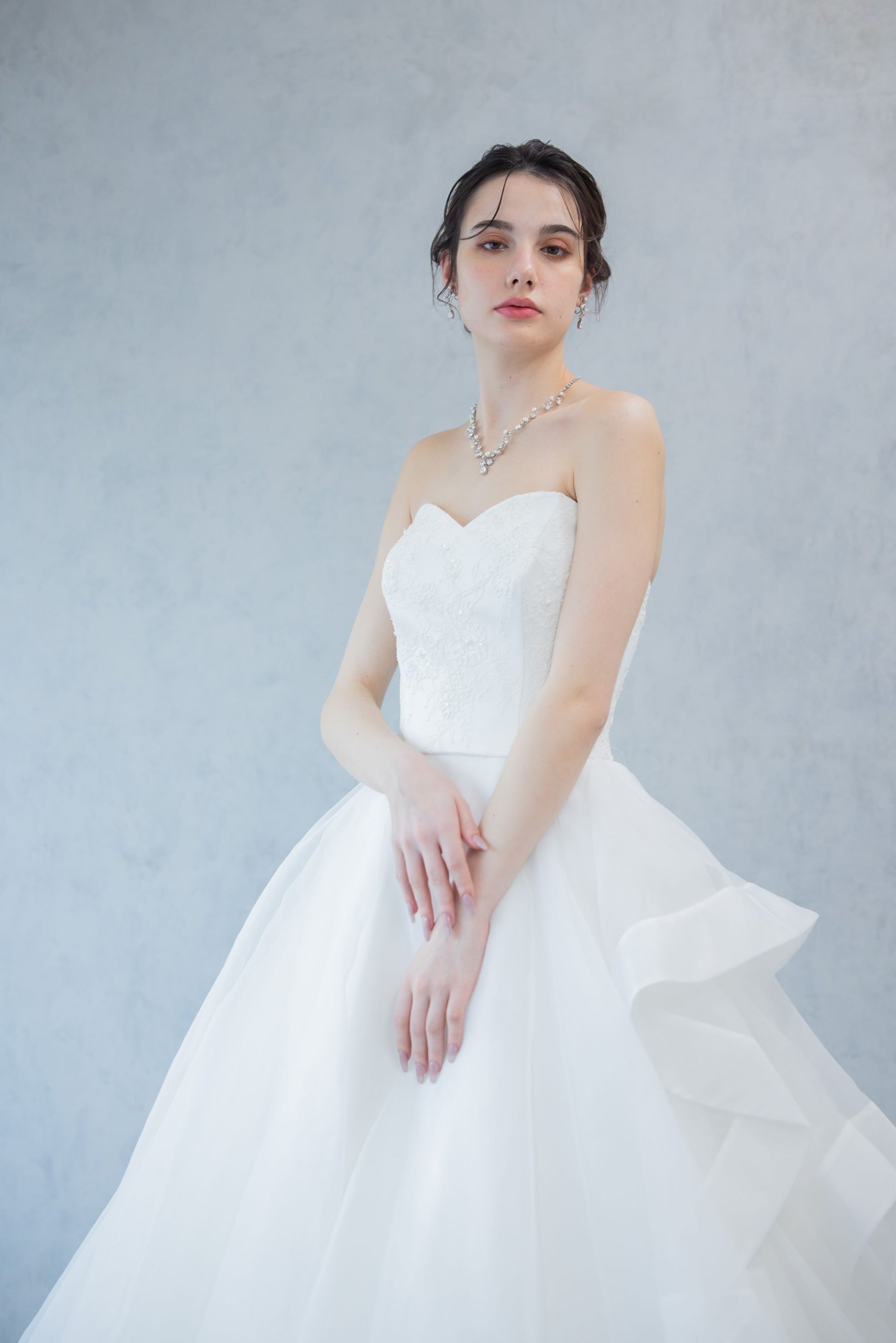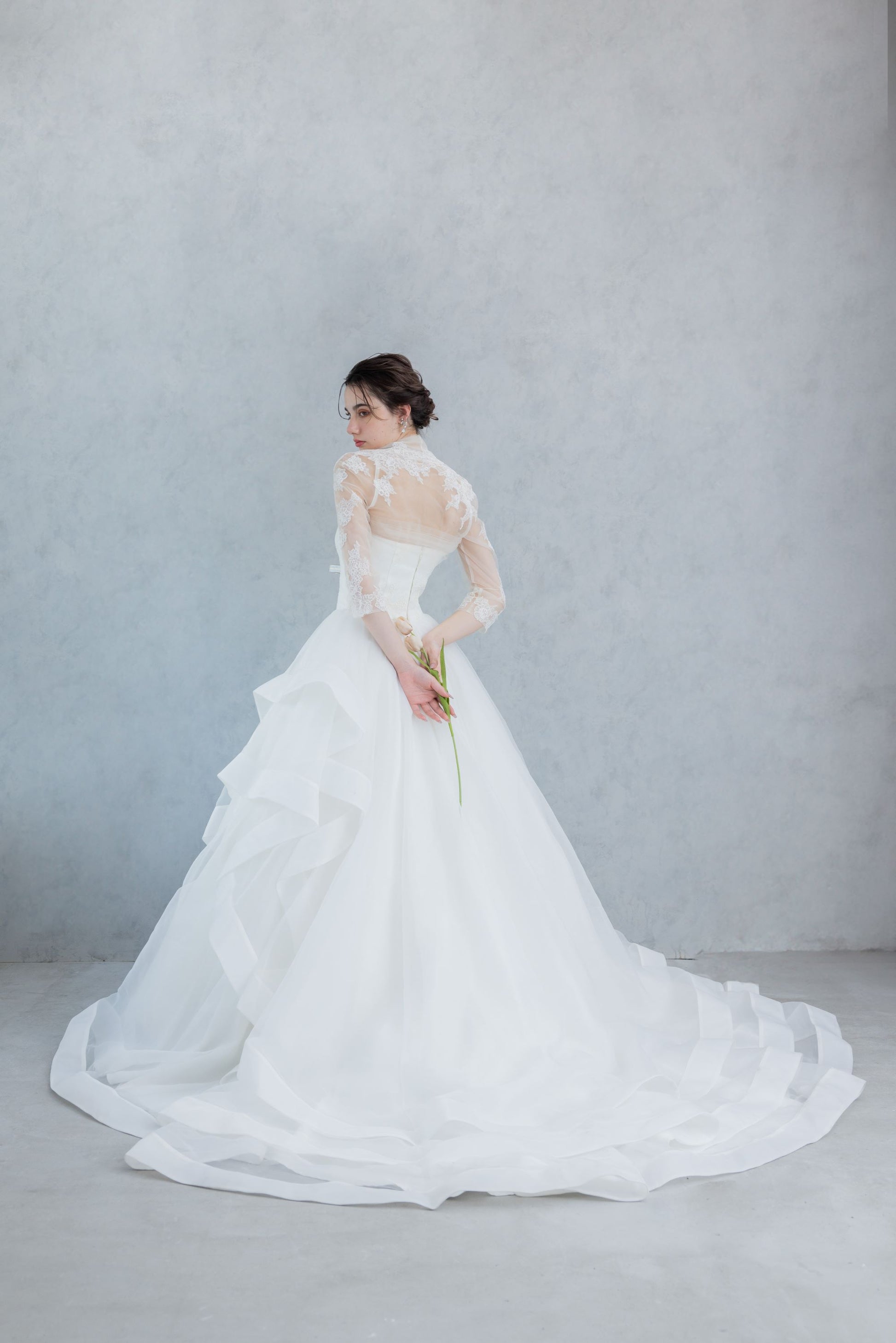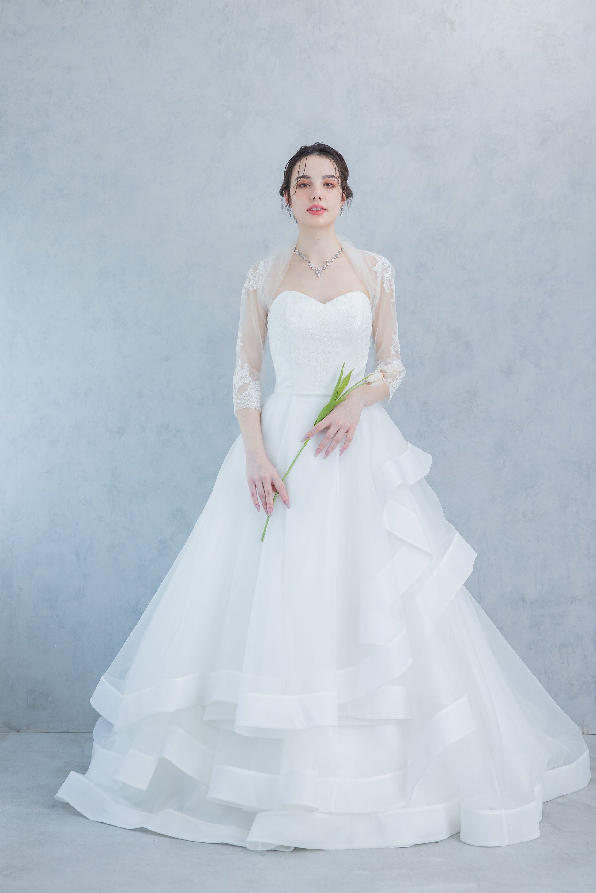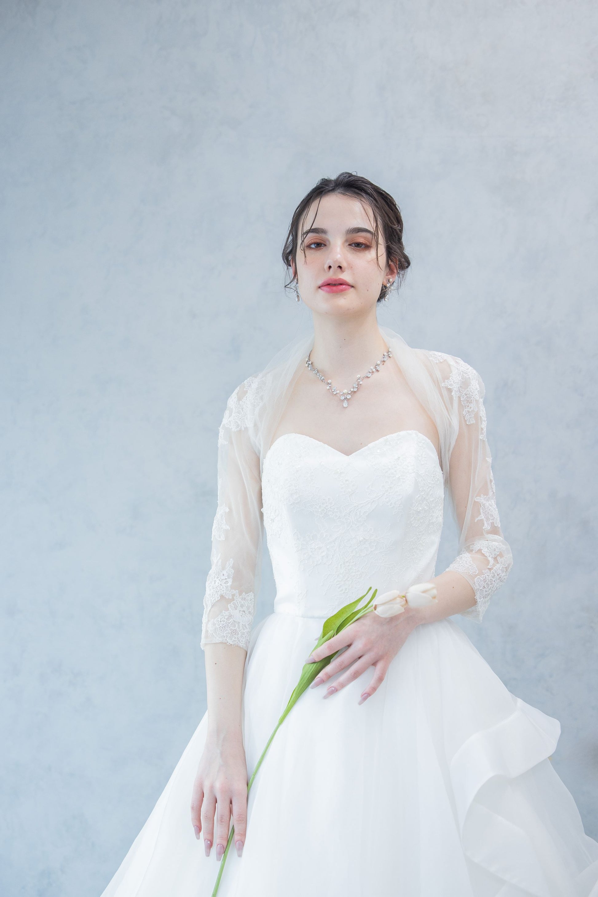 繊細な「ラッセルレース」をハートカットの胸元とドレスに合わせて開発した専用ボレロにたっぷりとあしらった、女性らしく華やかな印象のプリンセスドレス