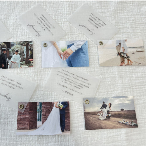 | 印刷備考 | ・お写真について 写真印刷専用用紙ではございません。 ご提出いただいたお写真の画質や逆行等で お送りするデータとは異なる仕上がりになります。 ・リクエストカードについて トレーシングペーパーへの印字は 文字の滲みや多少のズレが生じる場合がございます。 予めご了承ください。 ・ハトメ加工について この商品は一つ一つ手作業でハトメ加工を施しております。 ハンドメイドのため、0.5~1.5mm程度のズレが生じる場合がございます。 また、ハトメの部分は摩擦によって破れてしまう可能性がございます。 お取り扱いにご注意ください。 |