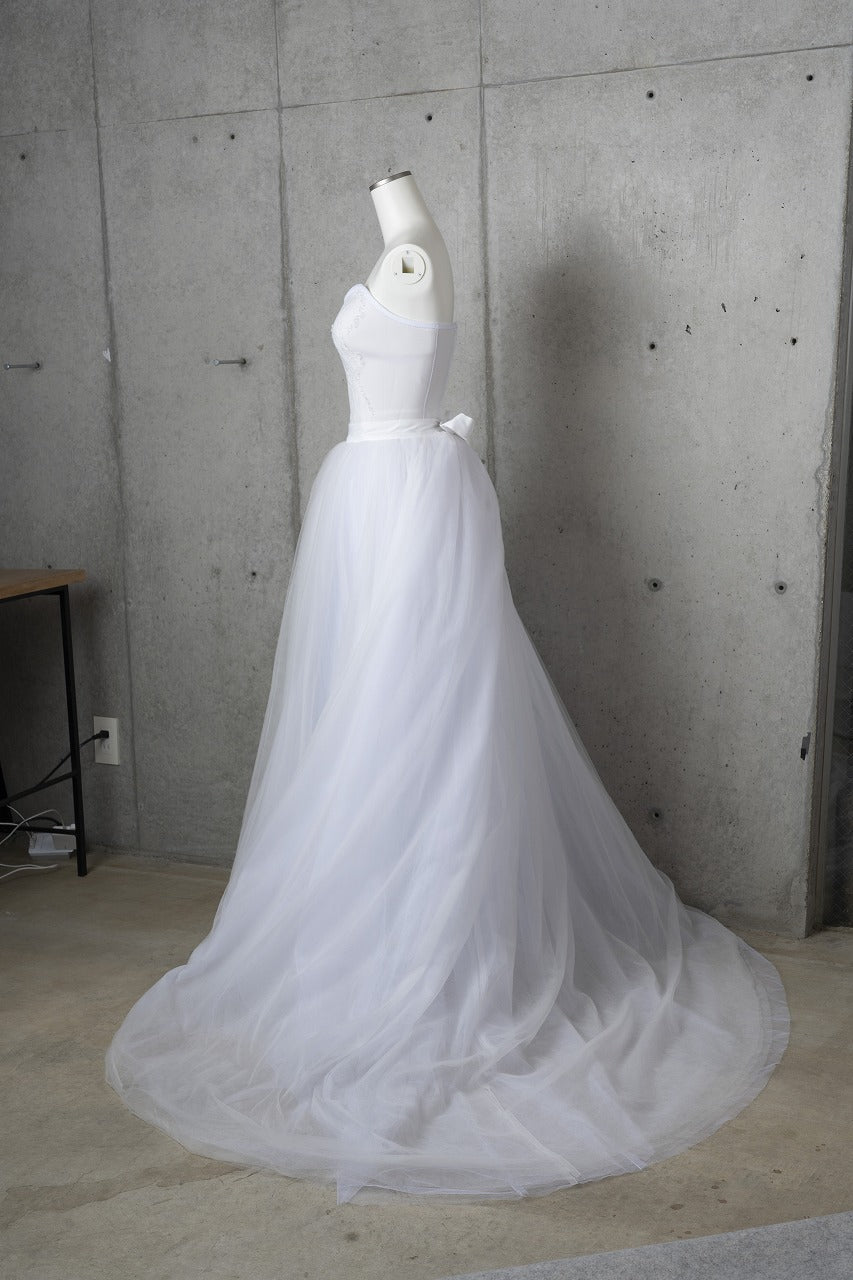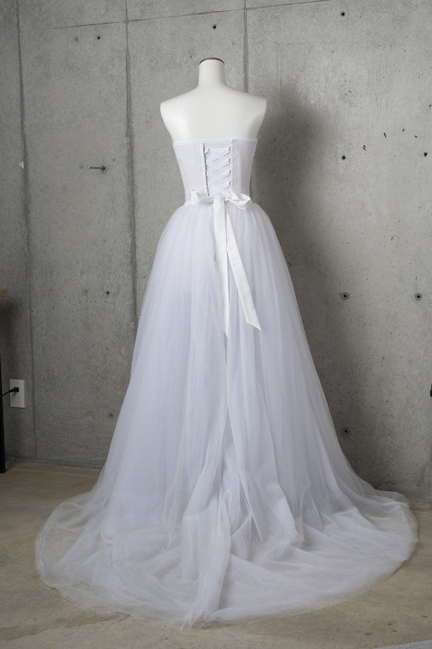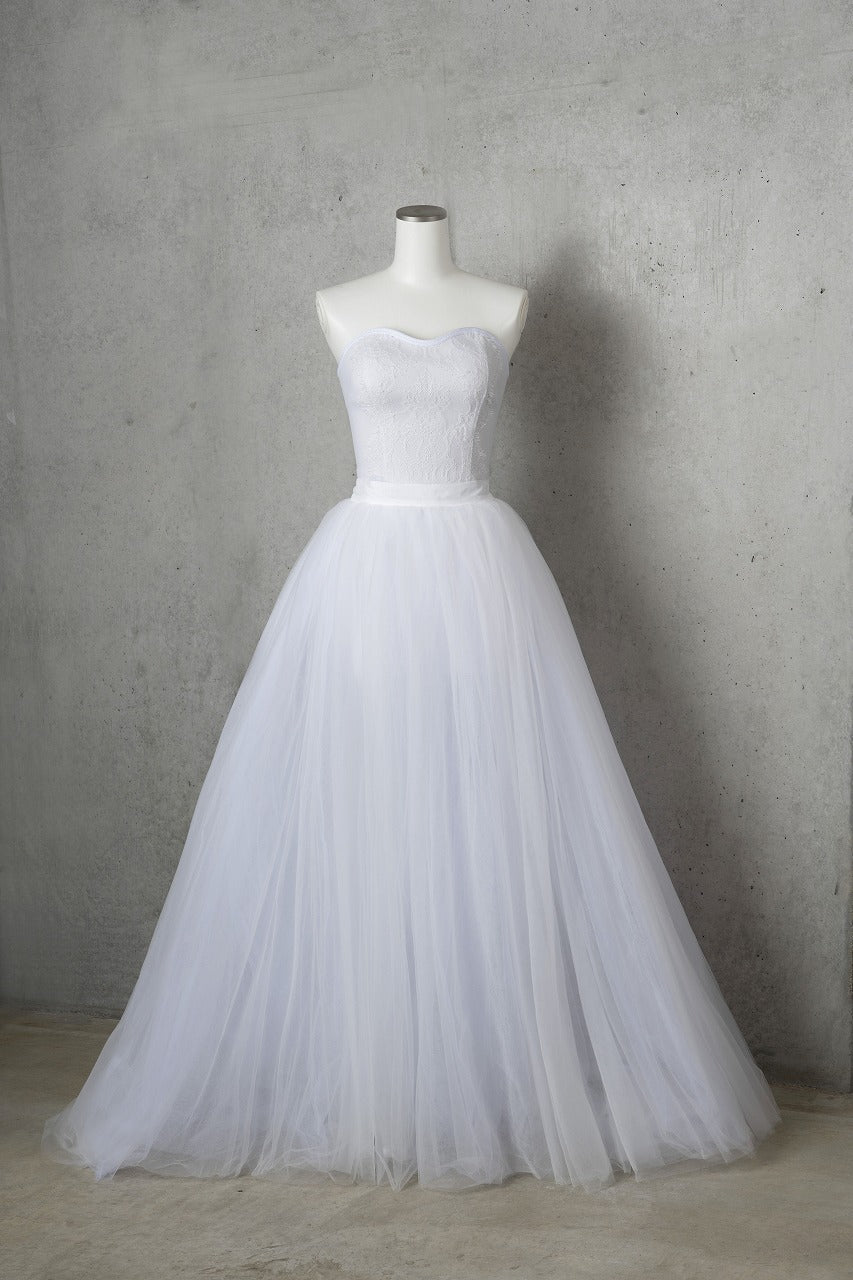 繊細なレースが施されたトップスに、チュールを何枚も重ねたボリュームのあるスカートを合わせたプリンセスライン。