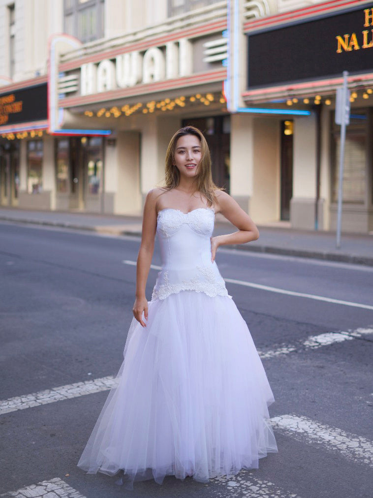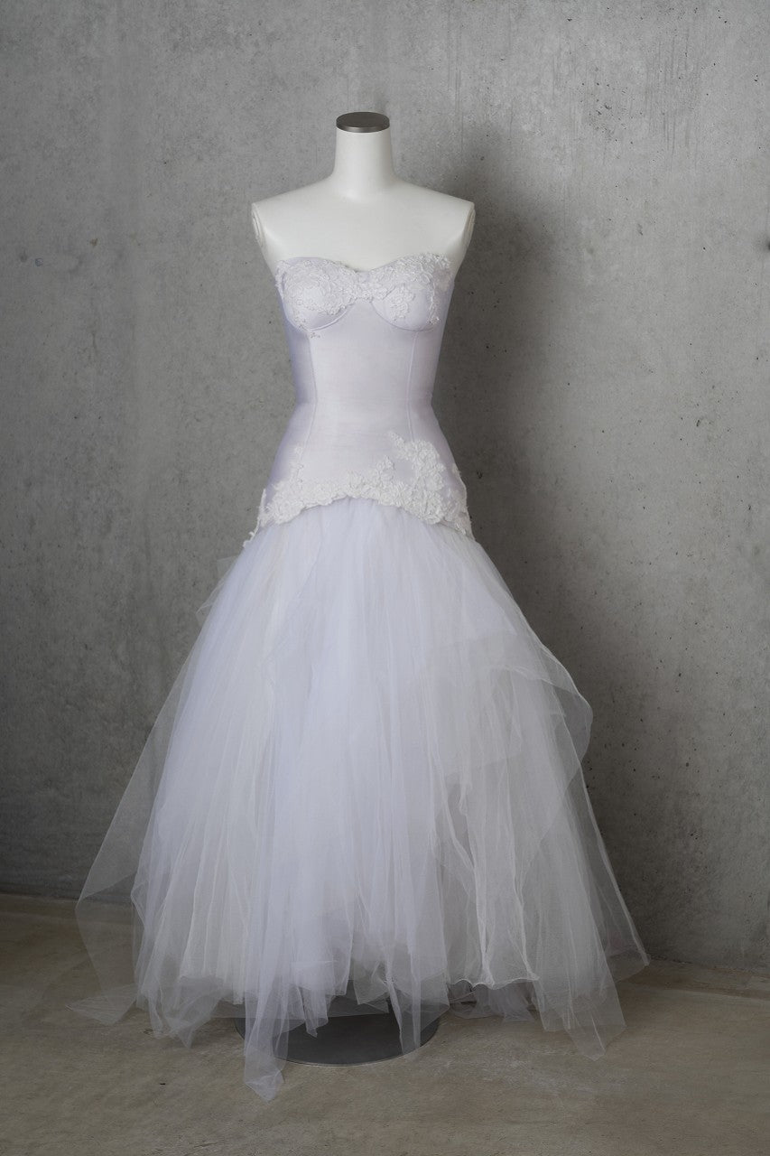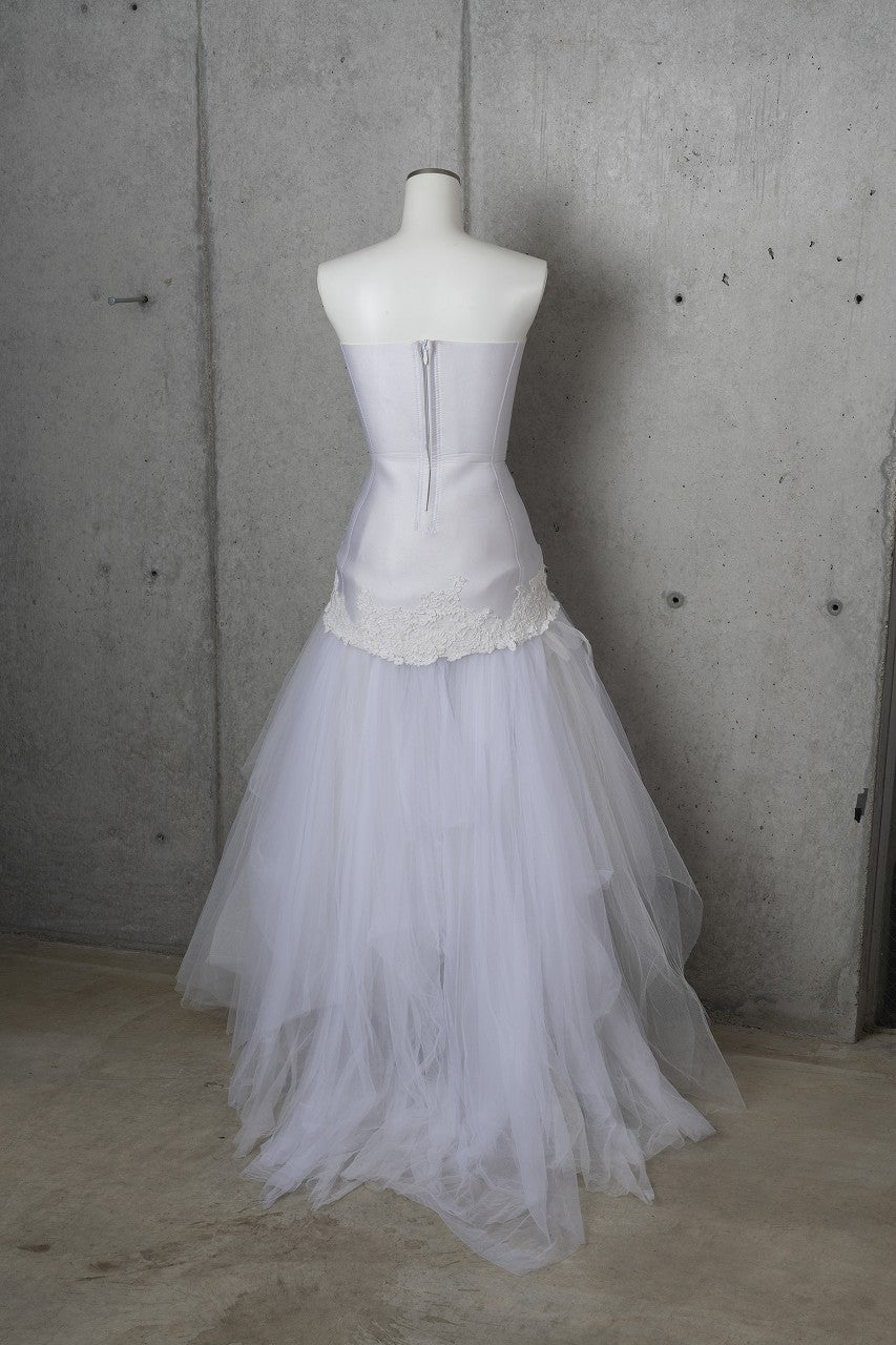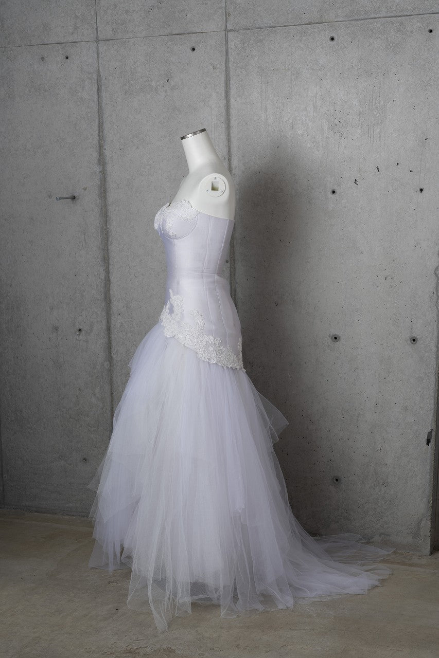 ボディコンシャスなビスチェ風デザインのソフトマーメイド。カップ部分にはコードレースが施されています。スカートは何重にも重なったチュールで華やかな印象に。