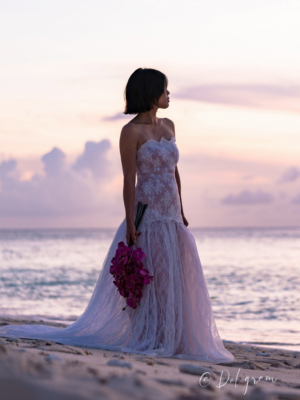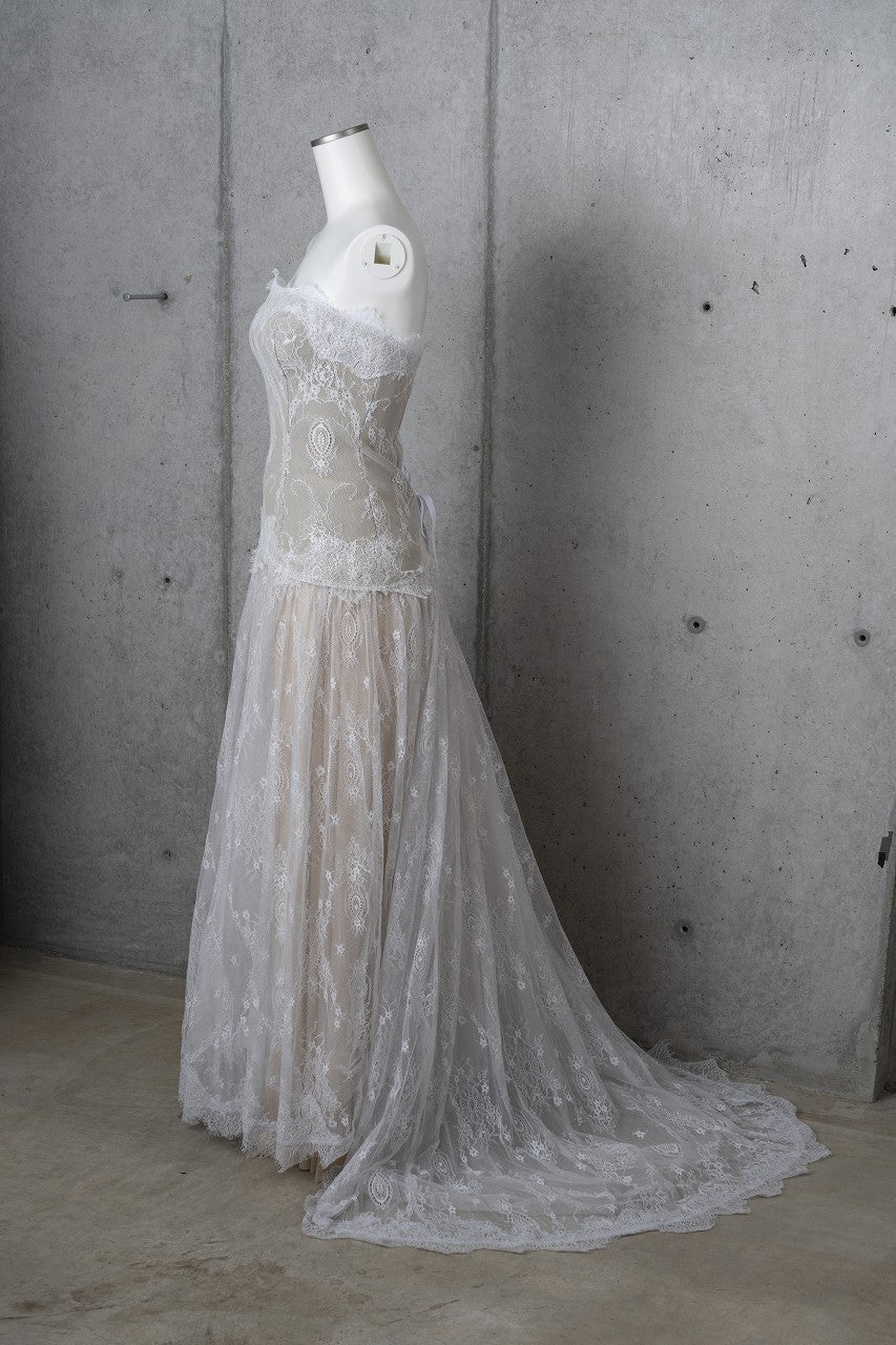 淡いピンクのニュアンスカラーが花嫁様の肌色をより美しく魅せ、レースの繊細さが引き立つ贅沢な1着。