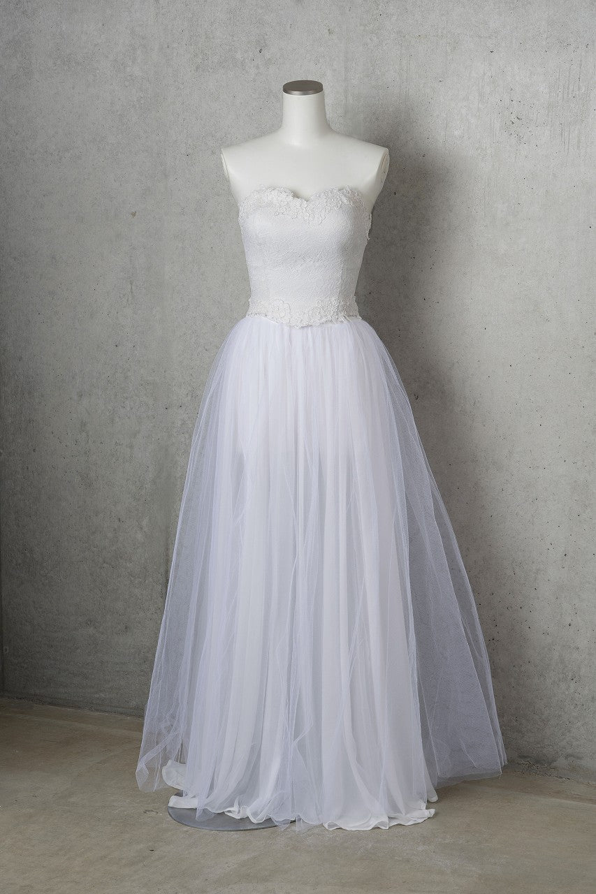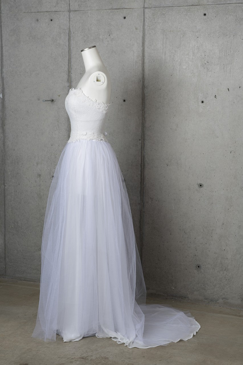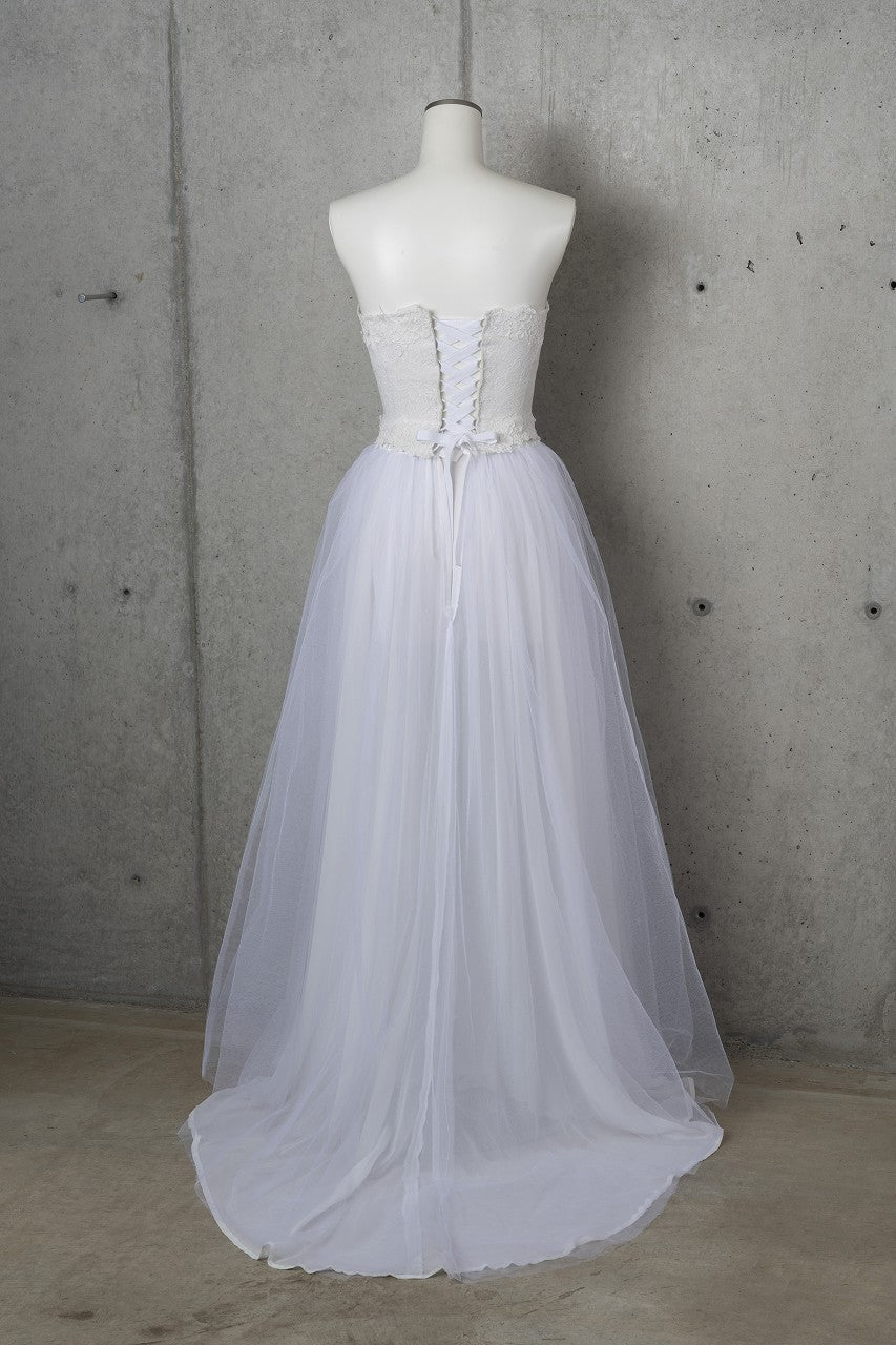 スカートはシフォンの上にチュールを2枚重ねて、ボリュームがありすぎないソフトAライン。
