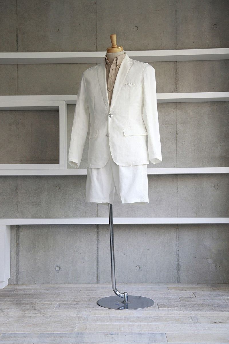 撥水加工が施された非常に薄いストレッチ素材を使用したテーラードジャケットとハーフパンツの組み合わせです。