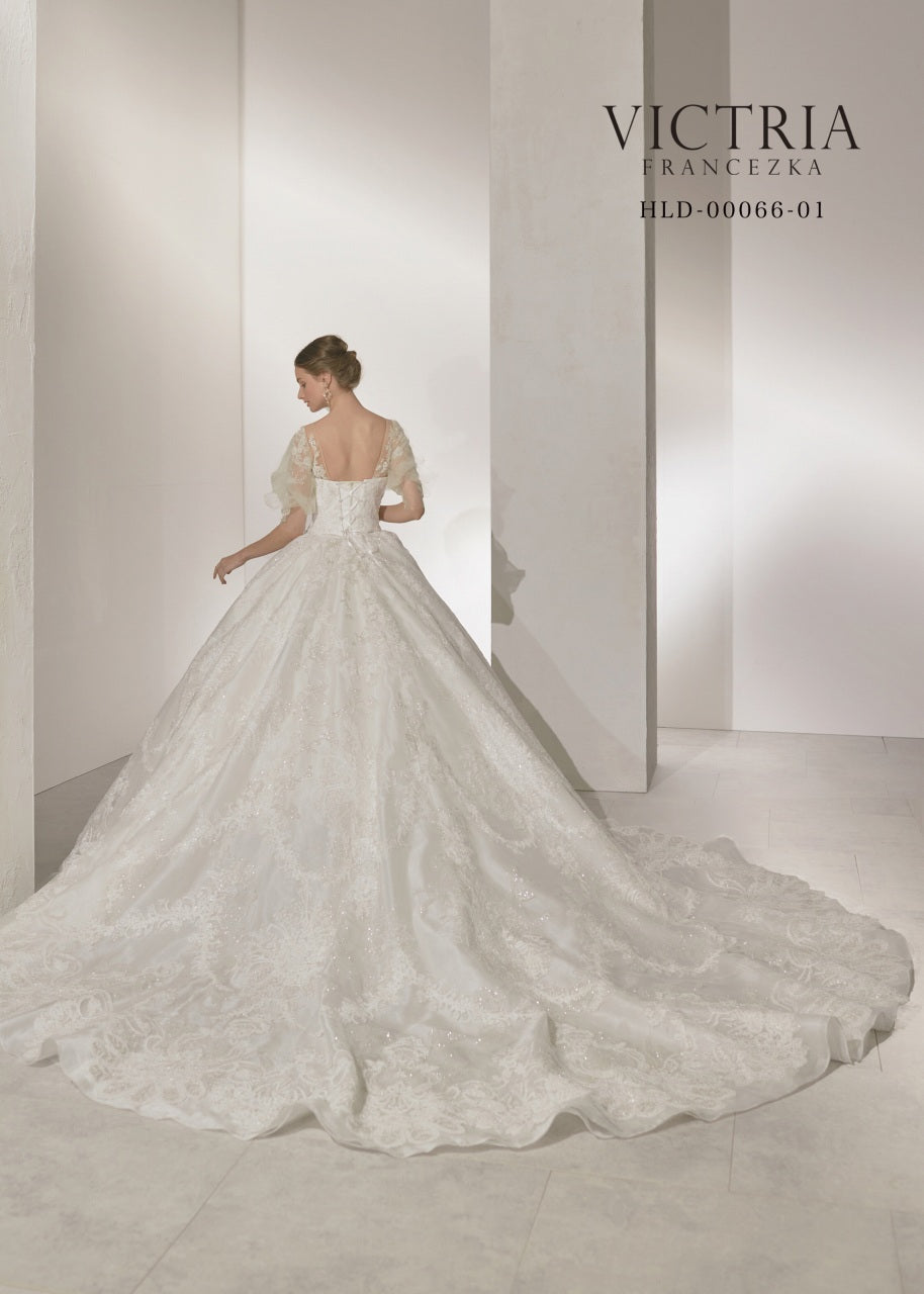 ガザールオーガンジーをふんだんに使用し、歩く度に裾が揺れ動く軽やかな印象のドレスです。