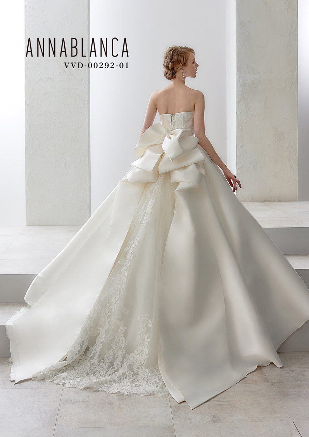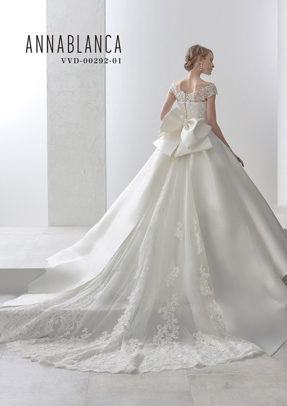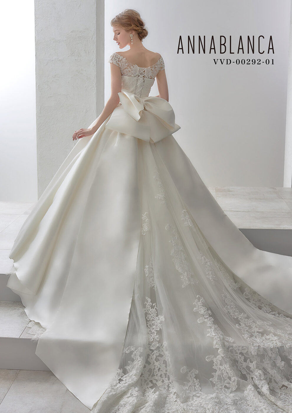 バックスタイルは、ボリュームのある立体リボンとレースの立ち上がりが豪華なトレーンが特徴的です。v