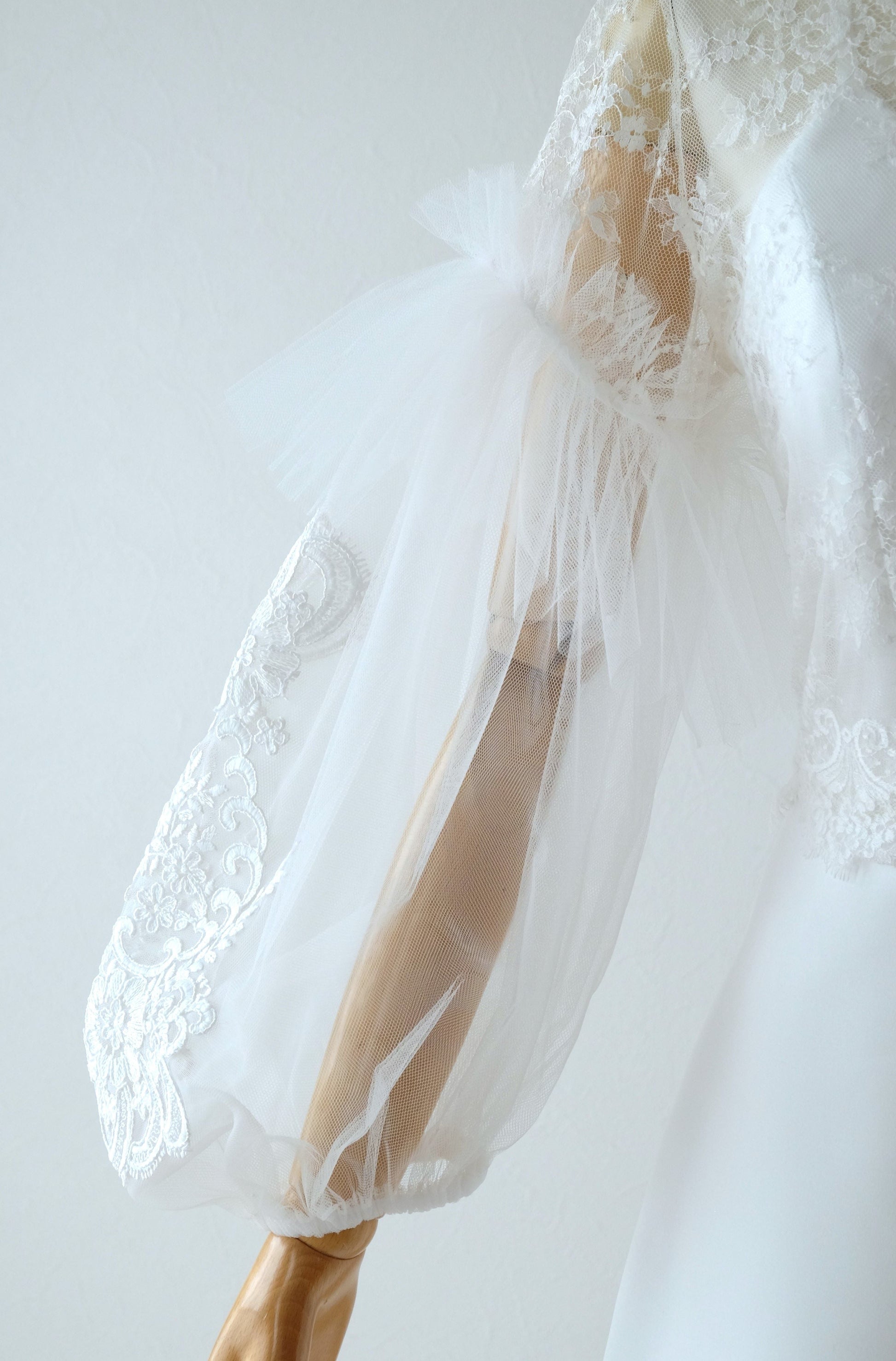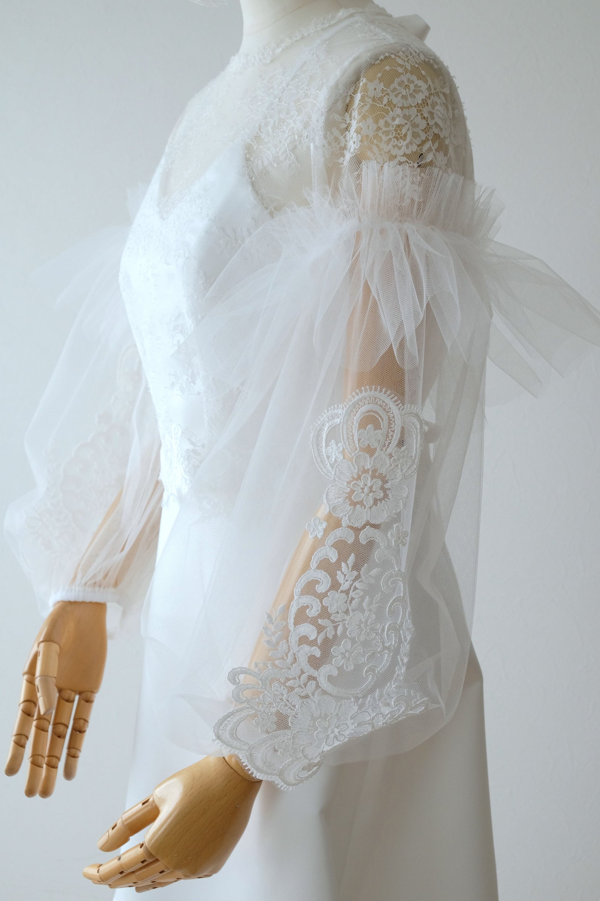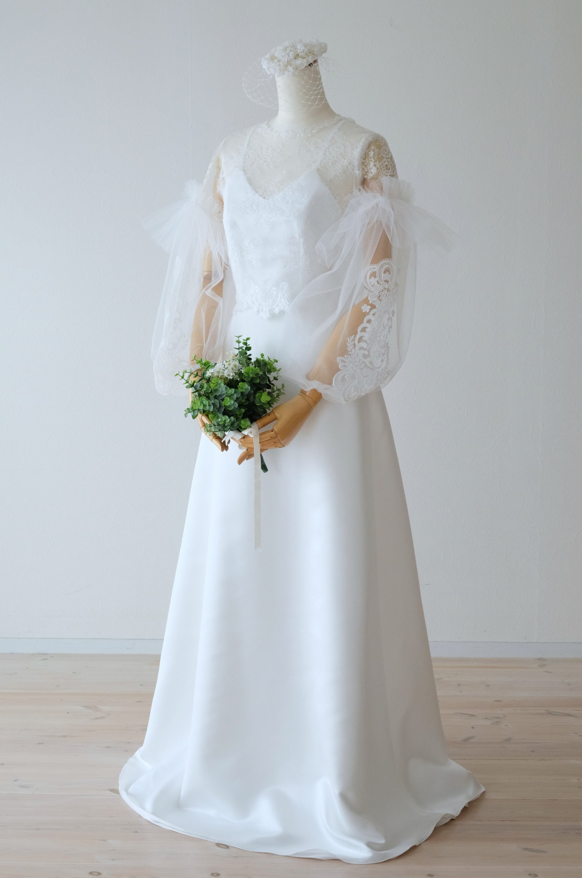 お袖のレースの刺繍が特徴的なドレスは、チュールのフリルがさらに