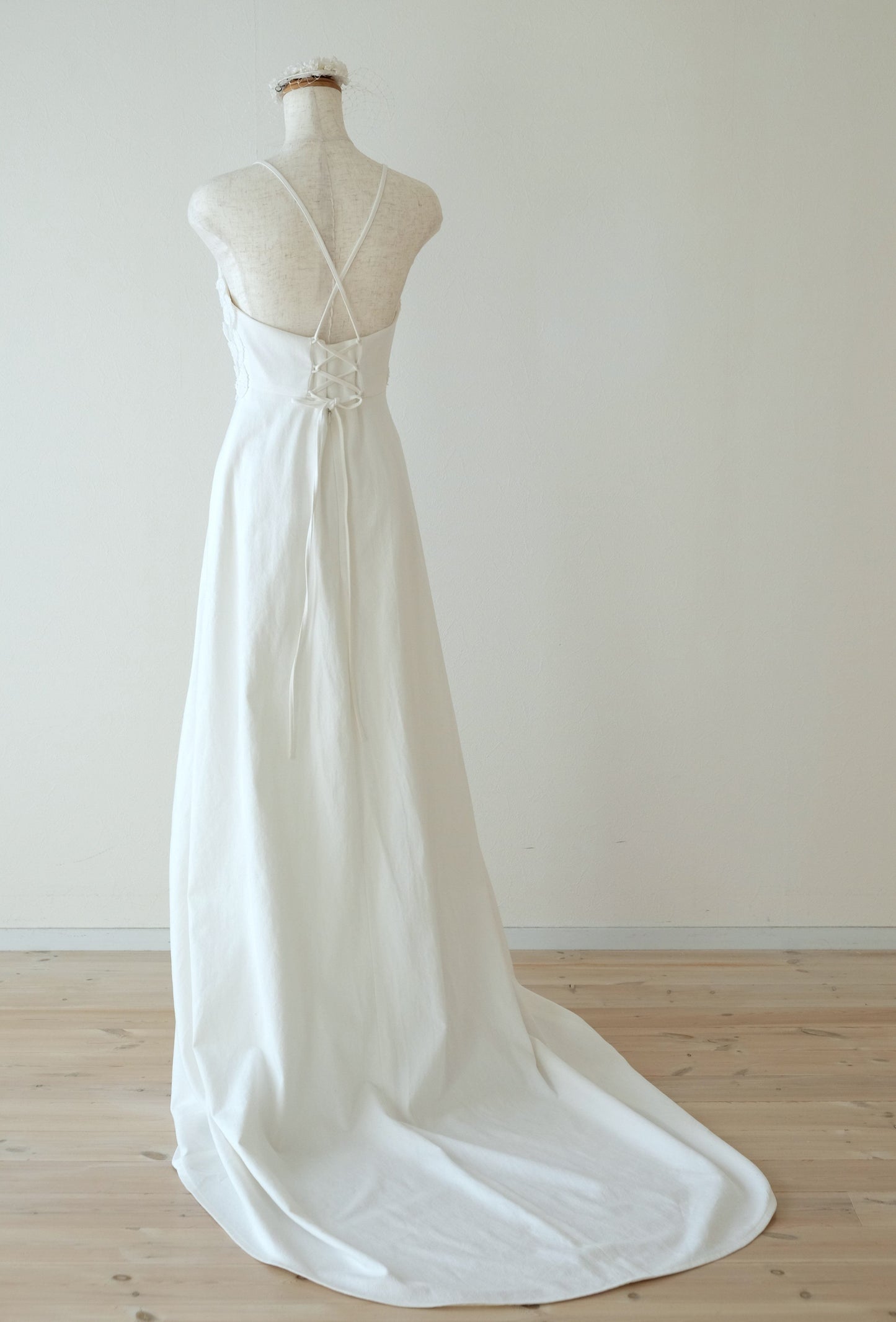 デニムらしく、ダブルステッチでカジュアルな要素をいれながら、シルエットはスレンダーなトレーン付きとアンバランスが魅力なドレスです。