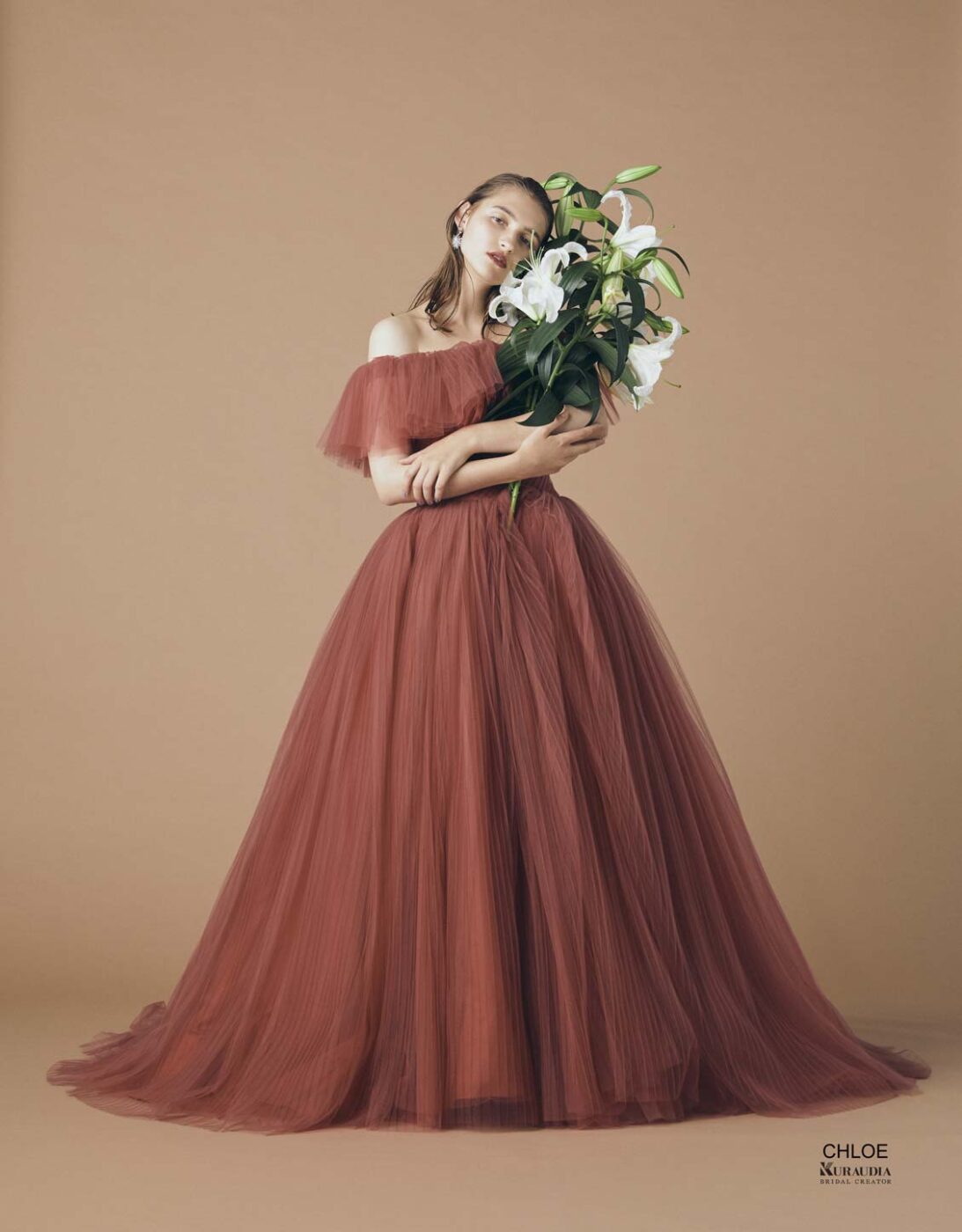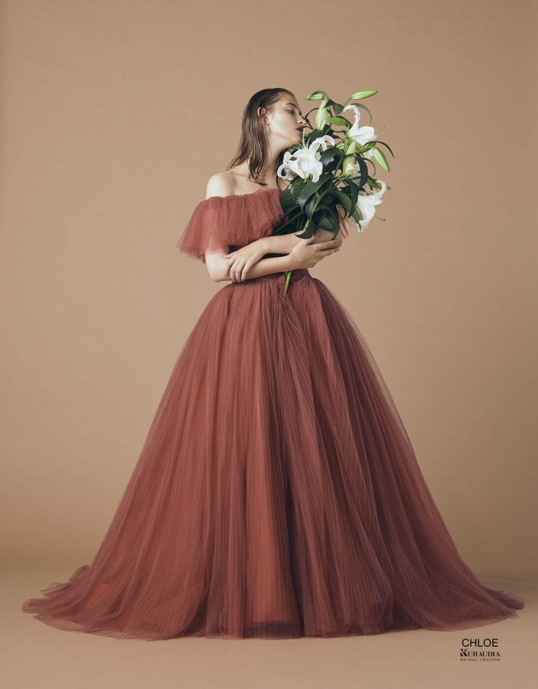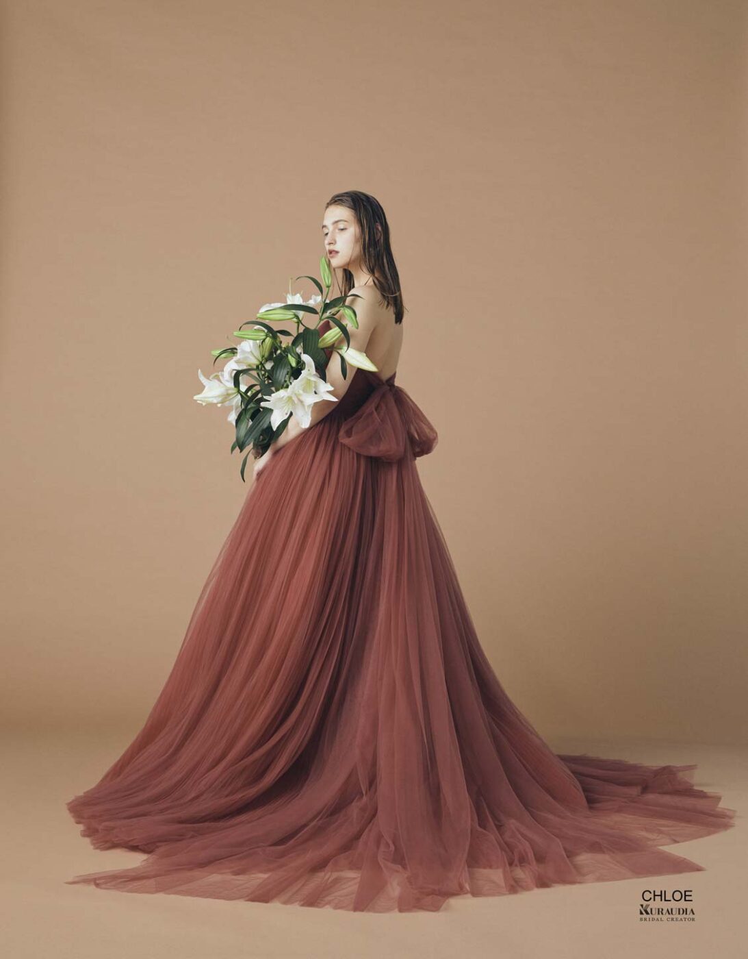 日本の染色工房でオリジナルに染め上げたテラコッタの絶妙な色合いにプリーツ加工を施したソフトチュールをたっぷり使ったフォトジェニックなドレス
