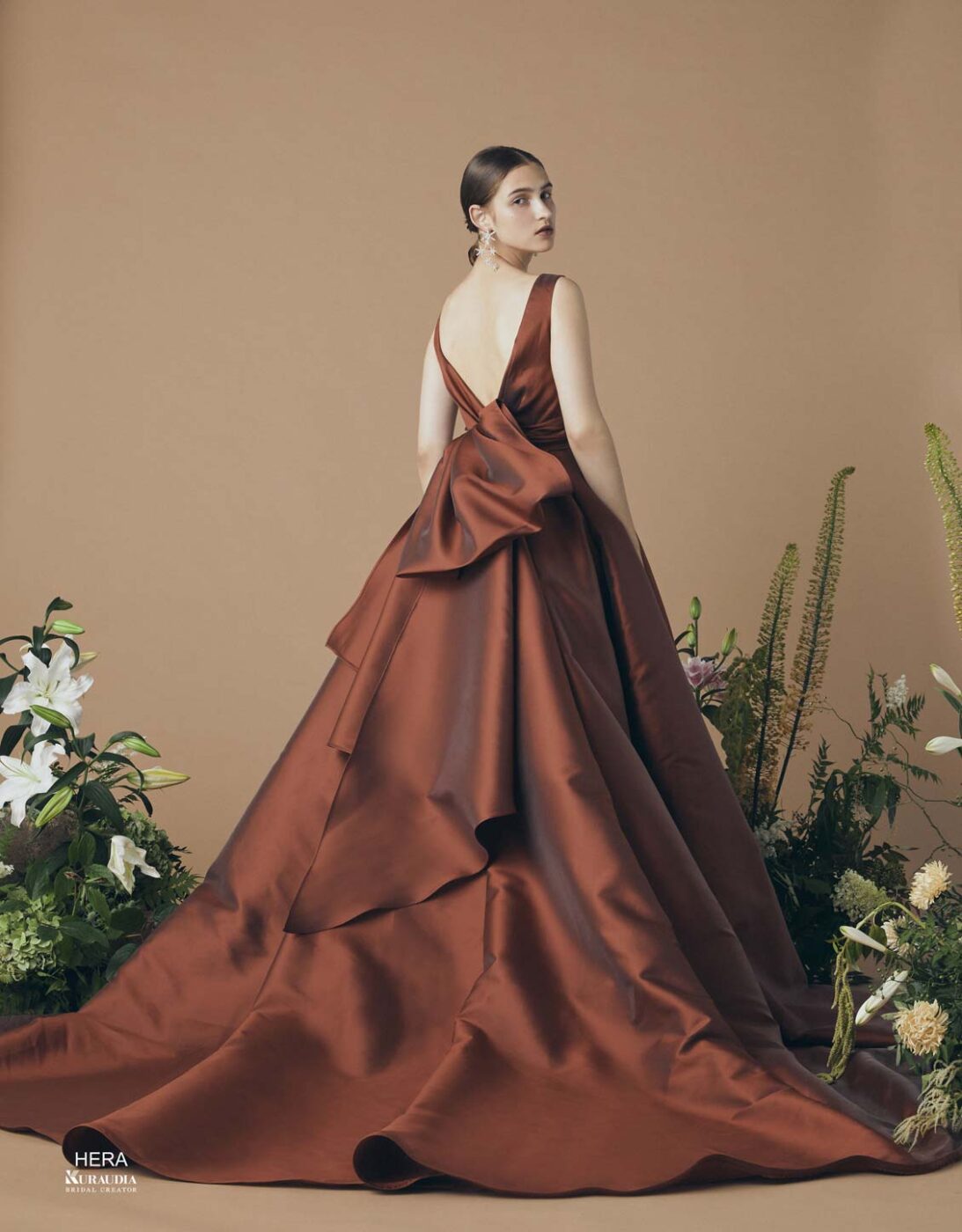 上質なインポートのシルクミカドを立体的で構築的なテクニックで魅せるドレス。