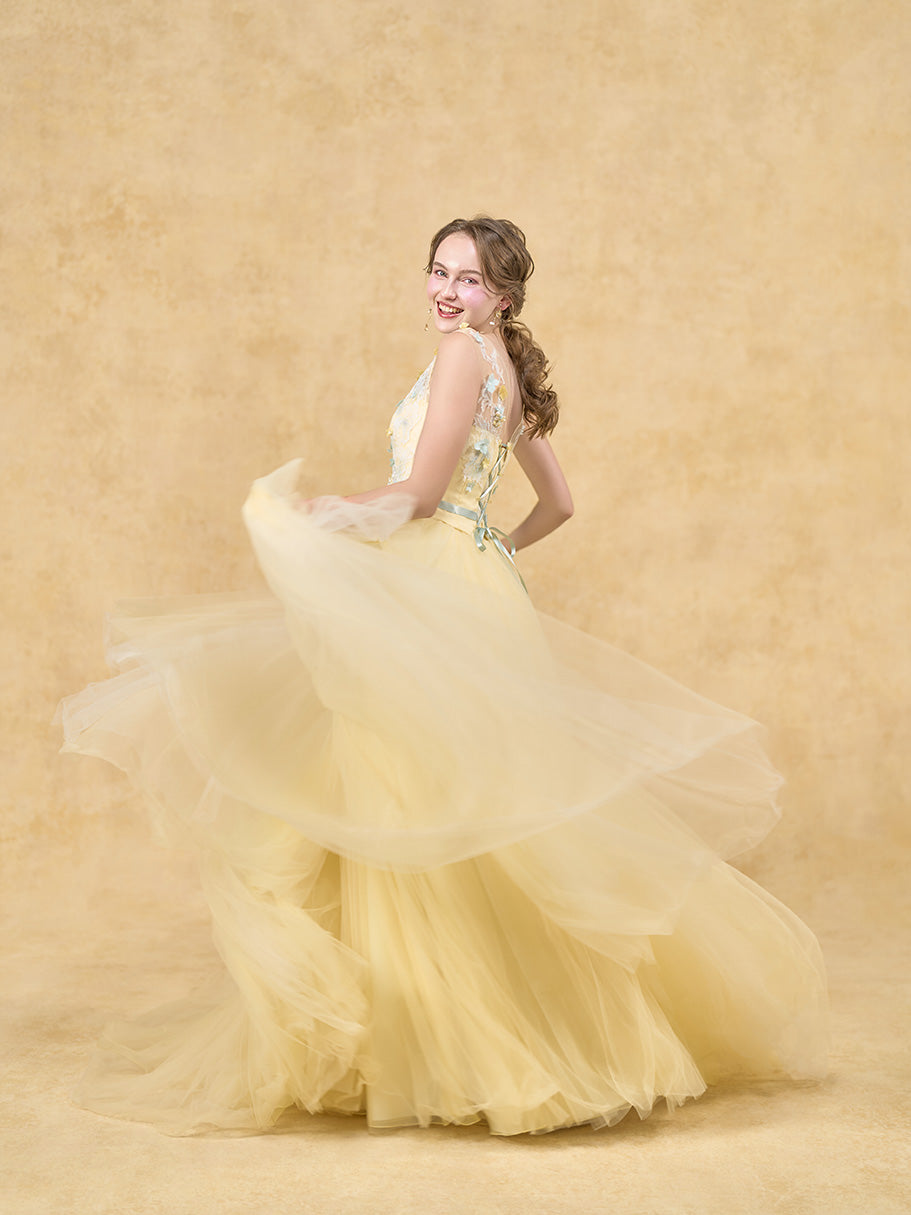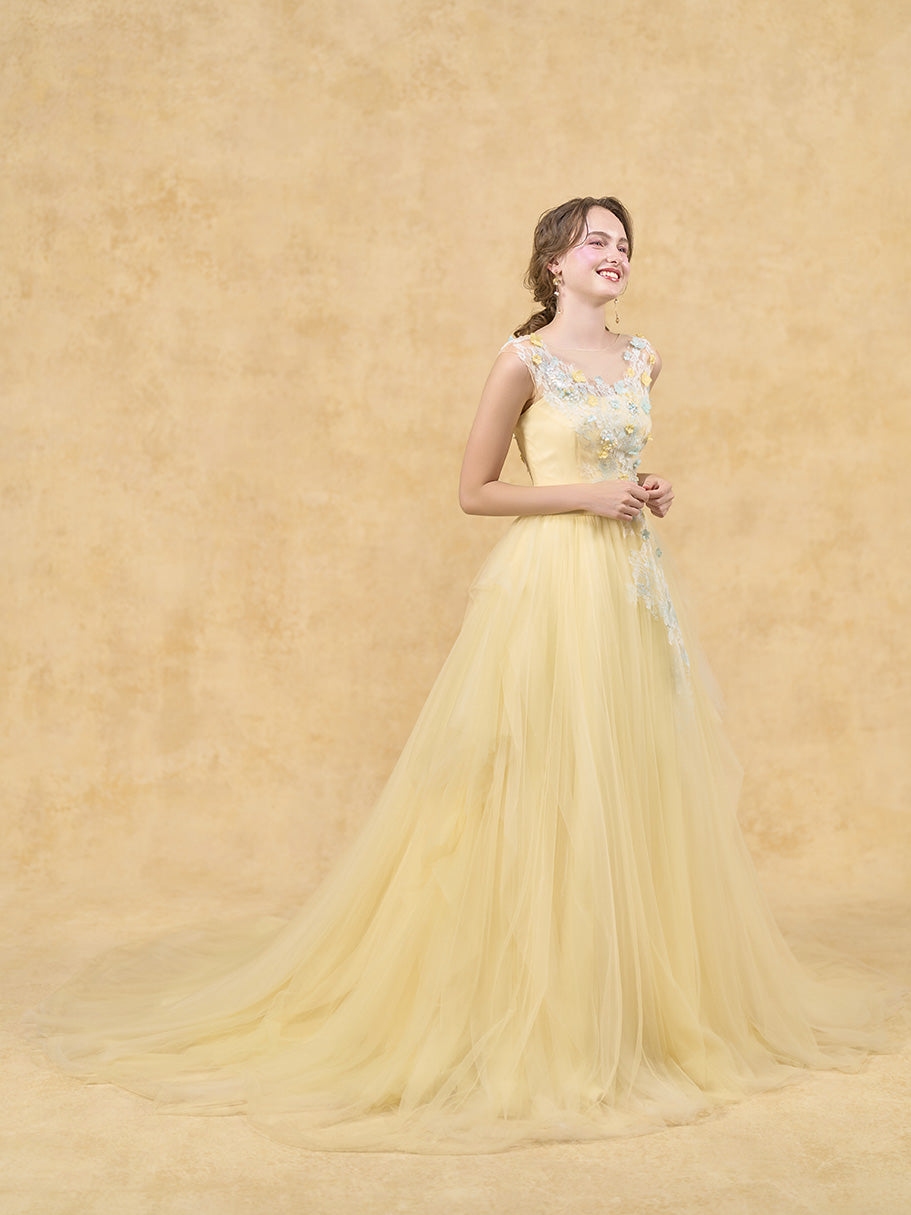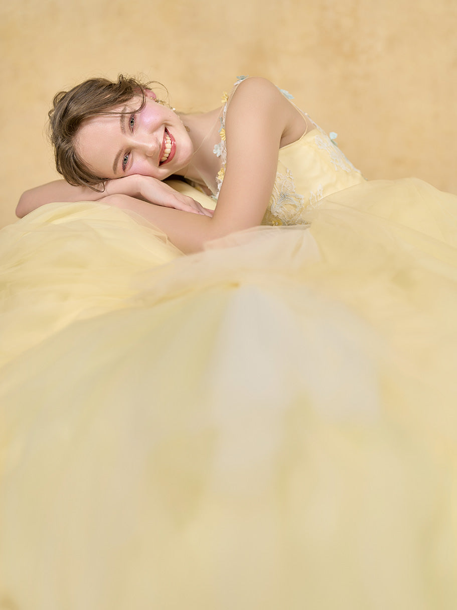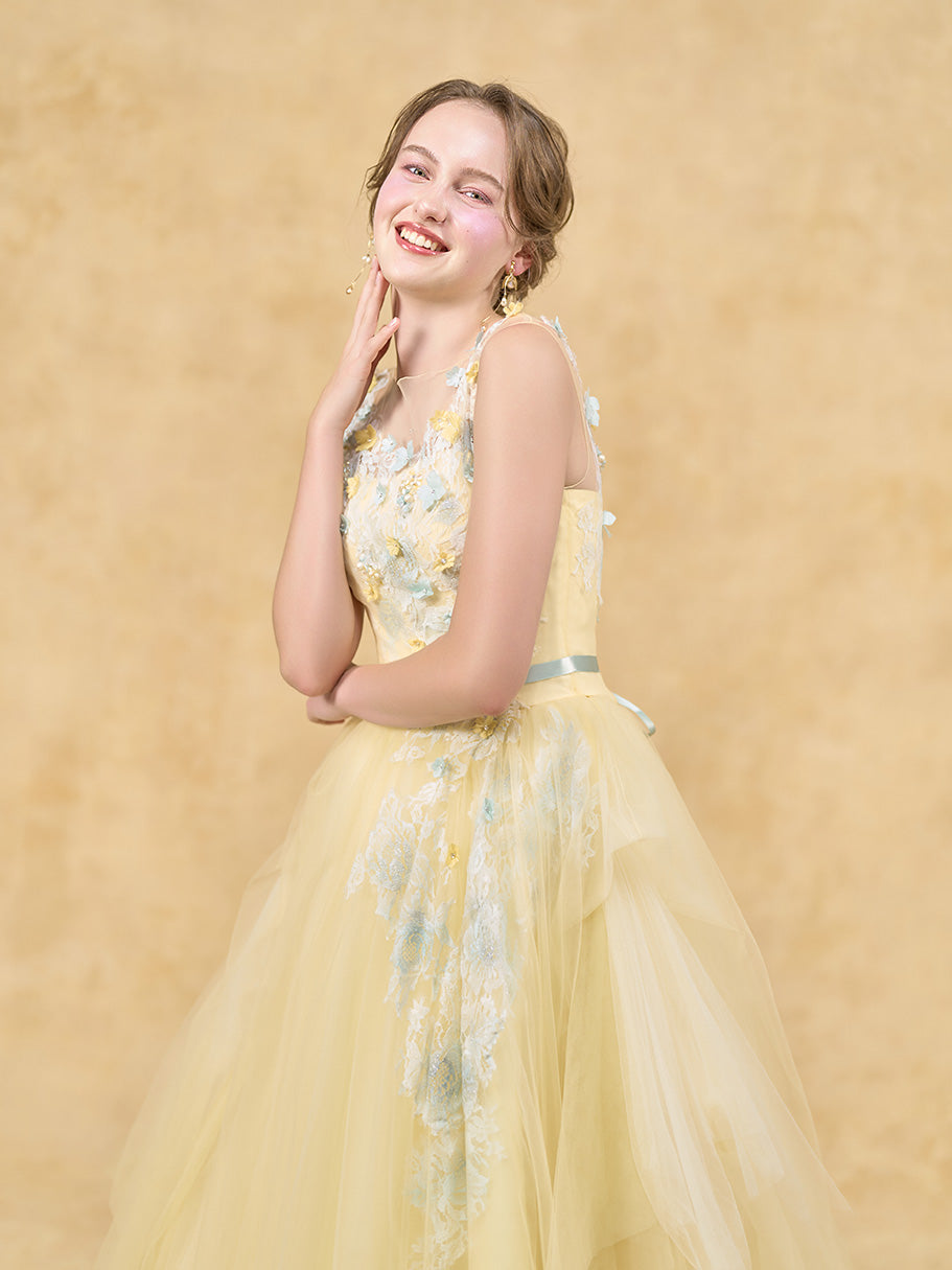 ブルーとイエローの小花が可愛らしく彩って、瑞々しいドレス姿を叶えます。