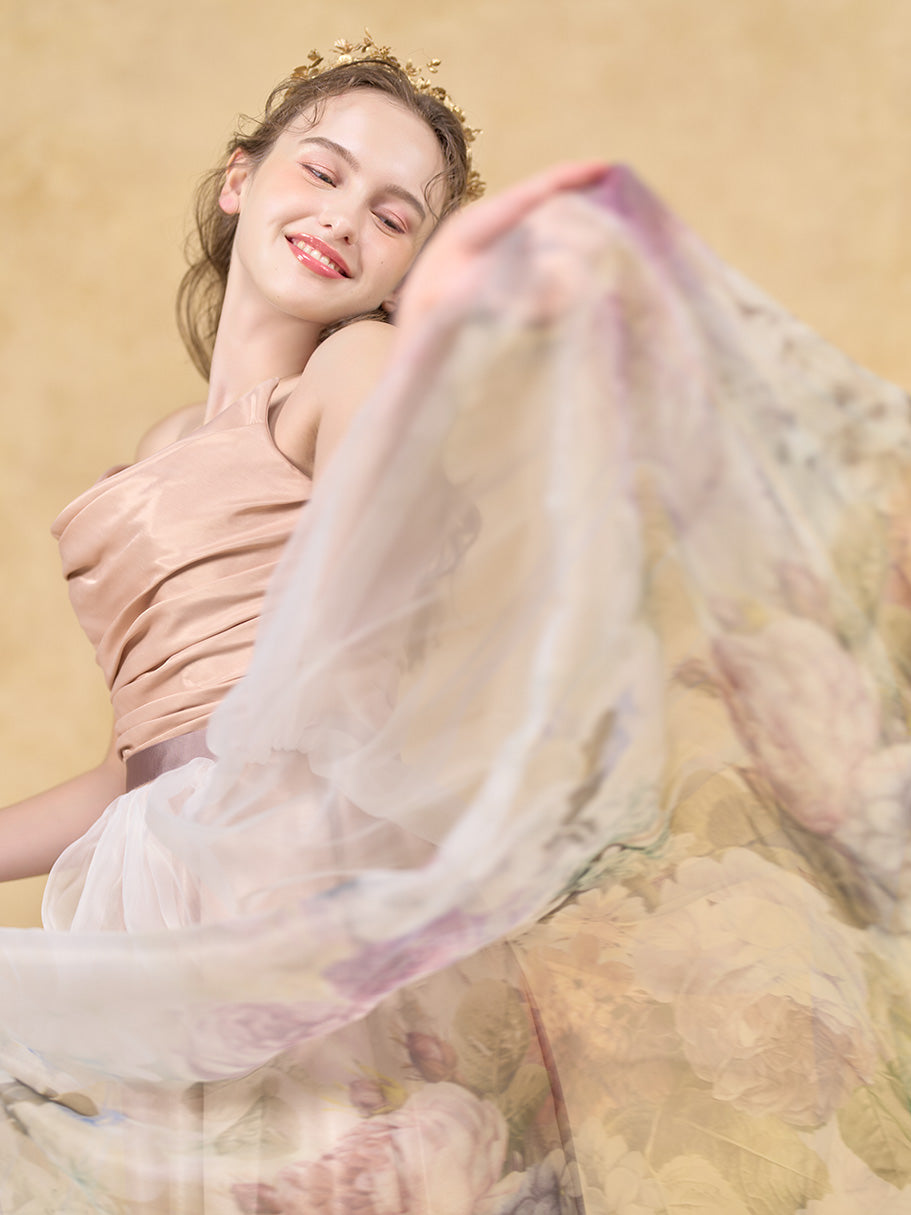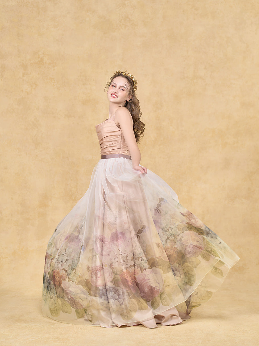 大柄のフラワープリントとヌーディーなピンクに染めたシャンタンを合わせた