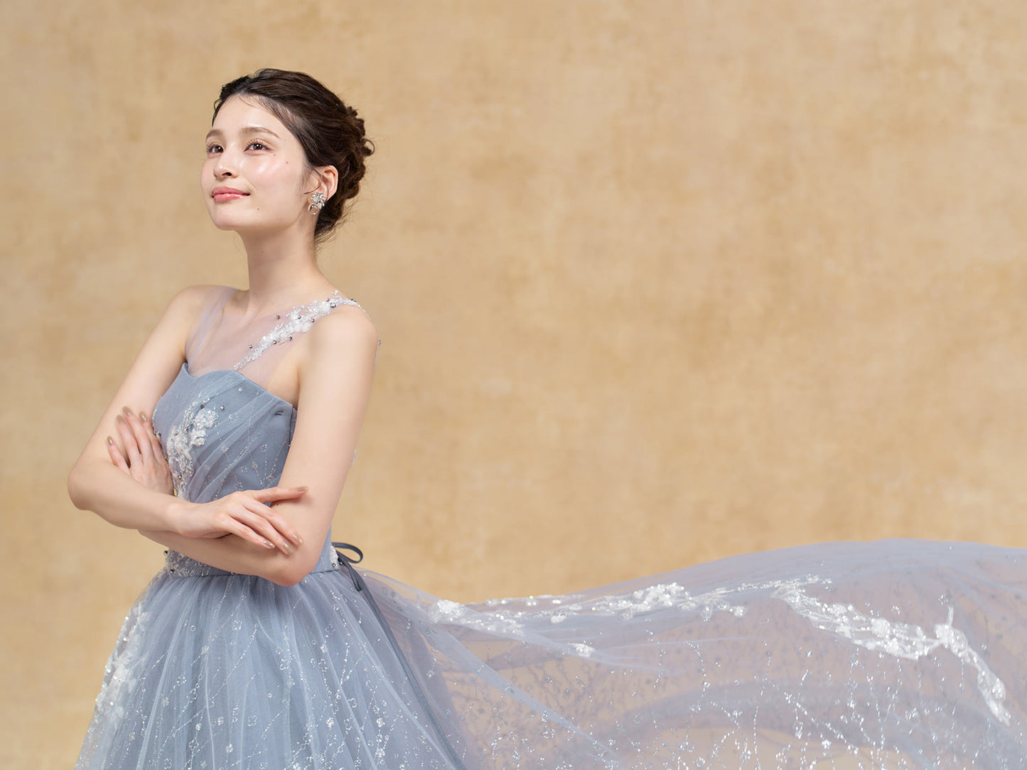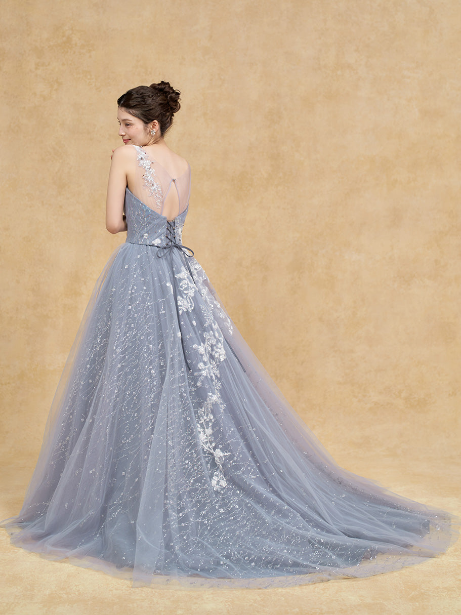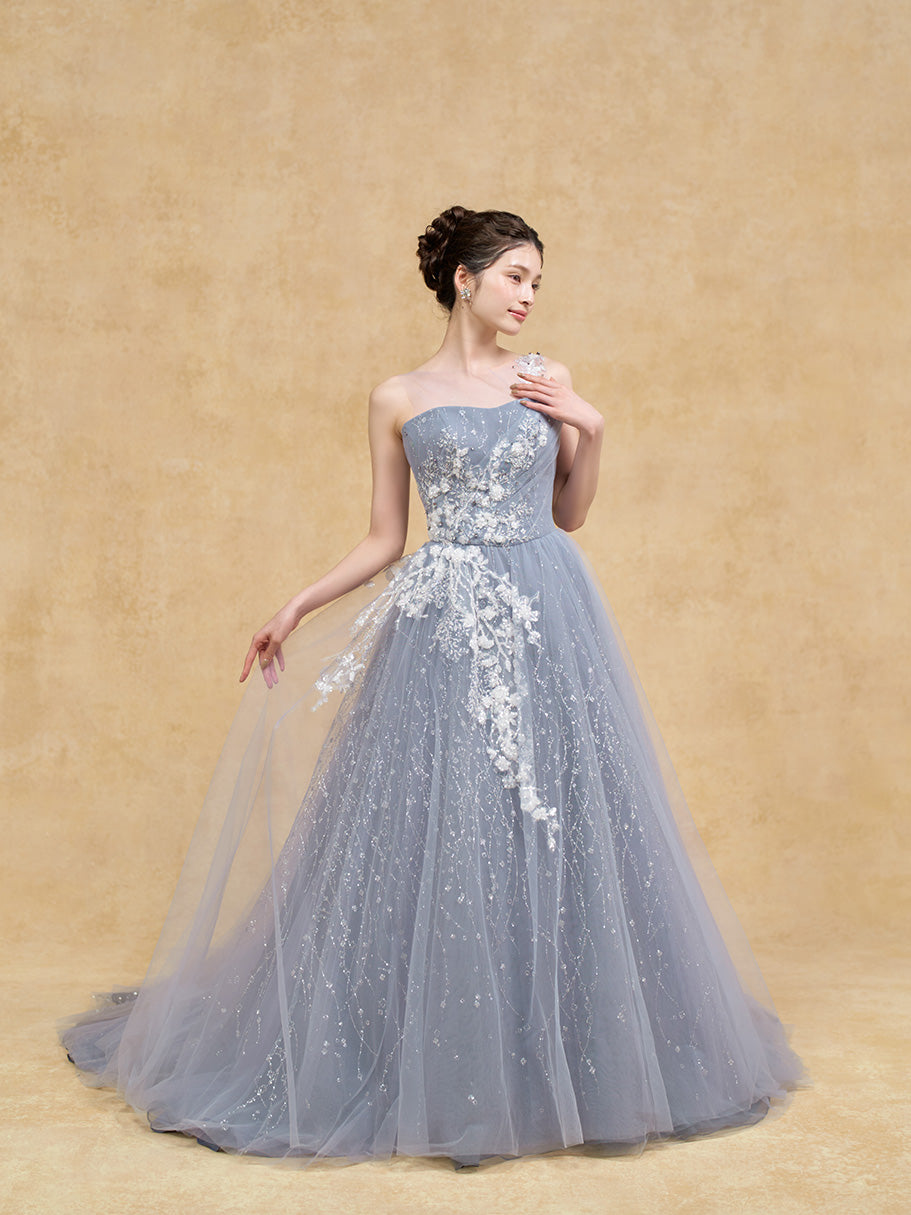 キラキラと輝くチュールに重なる、トップから流れ落ちるような