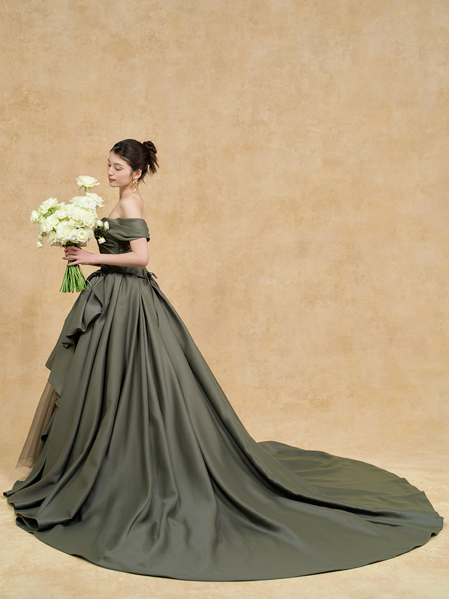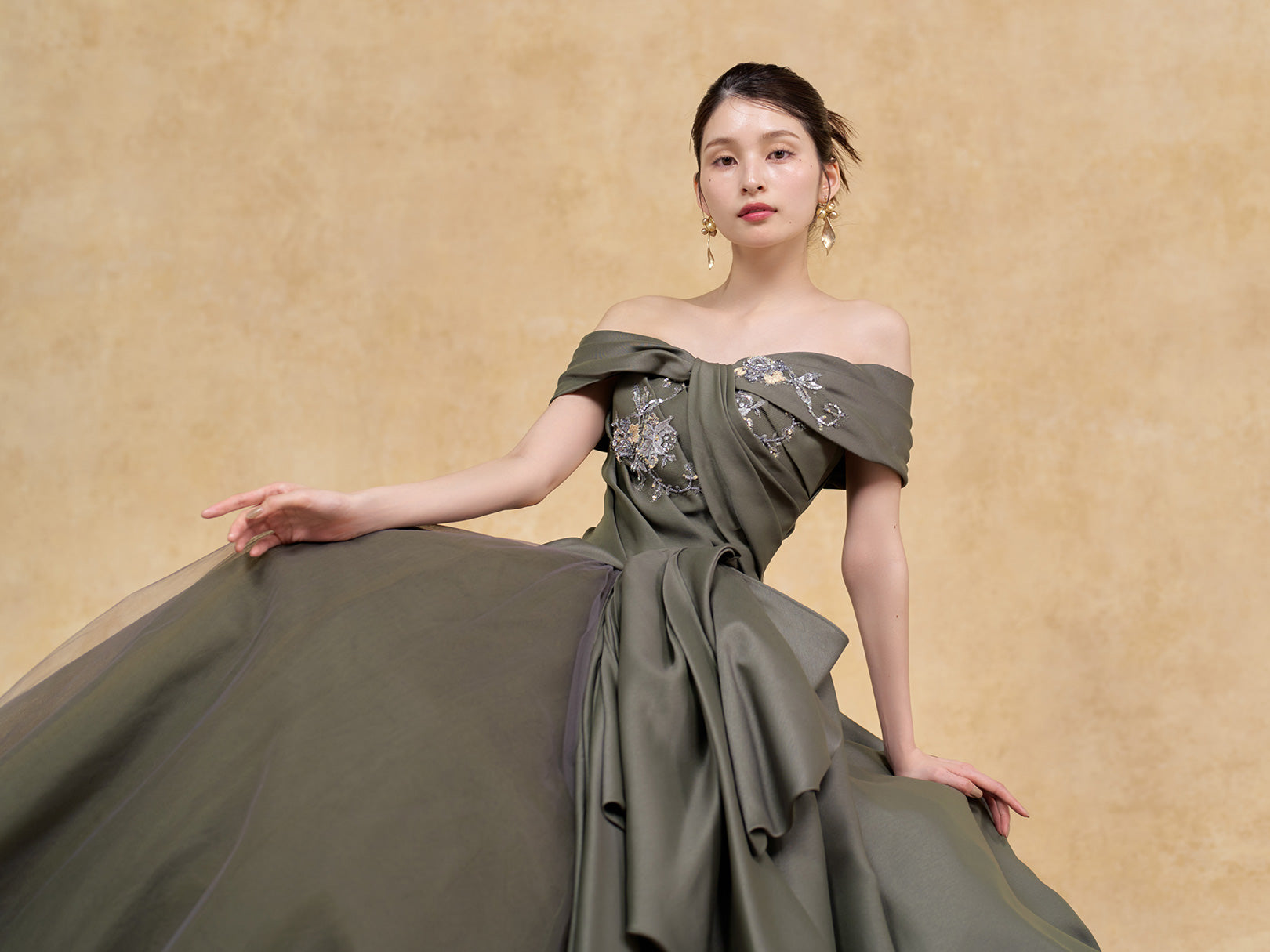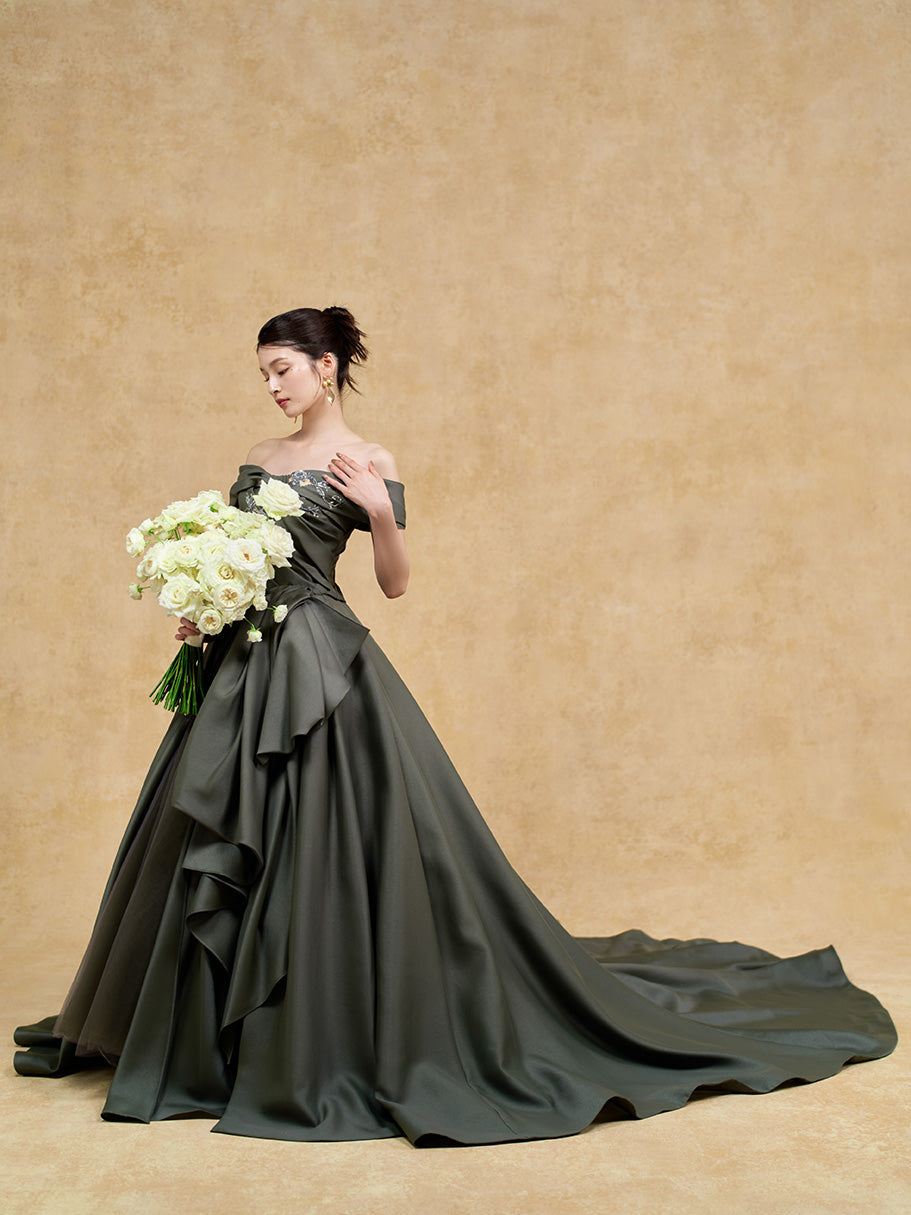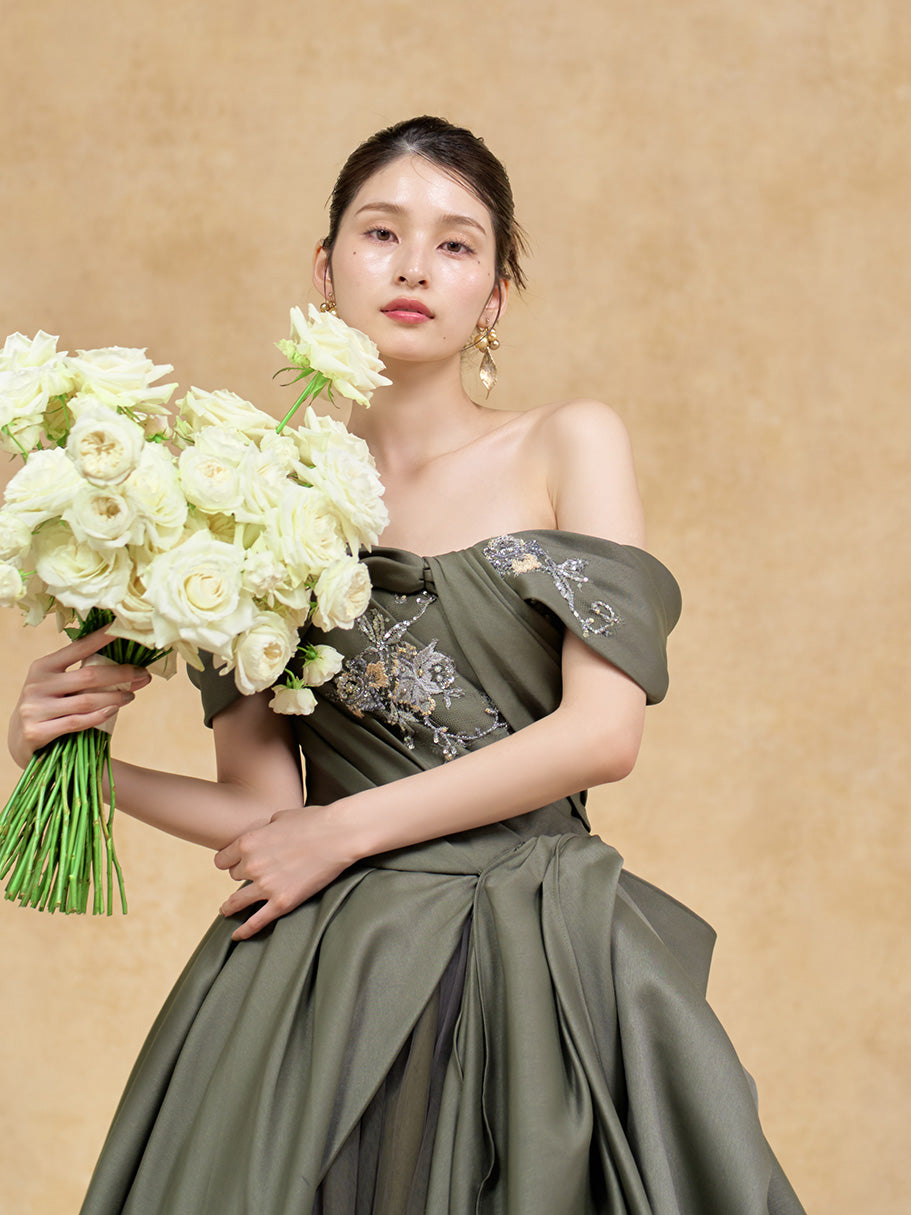 オリジナルで染色したカーキグリーンはファッション感度の高い花嫁に人気のトレンドカラー。