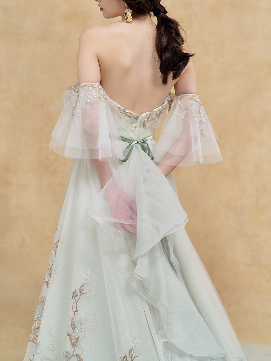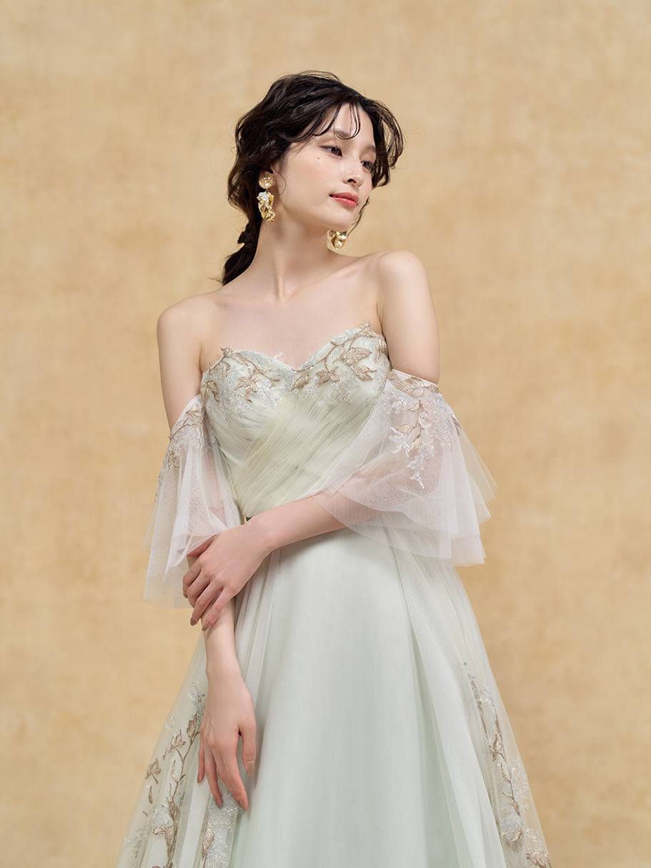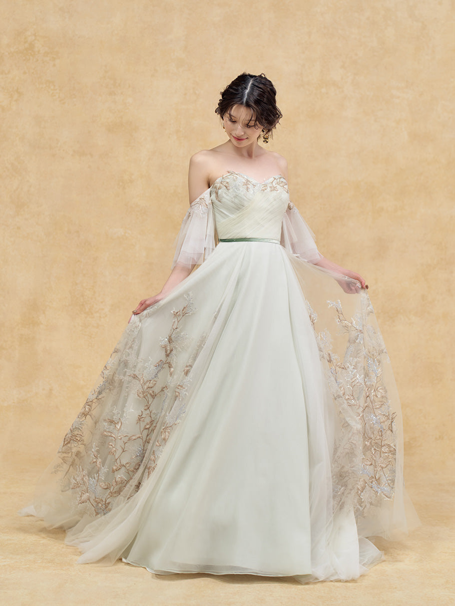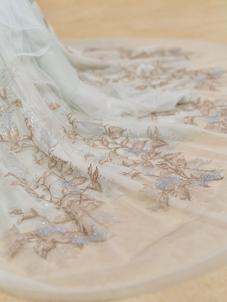 淡いグリーンのチュールにリーフや枝の刺繍を重ねた一着。