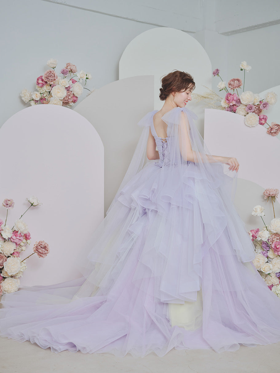 肩から流れ落ちるようなリボンとランダムなティアードスカートが
