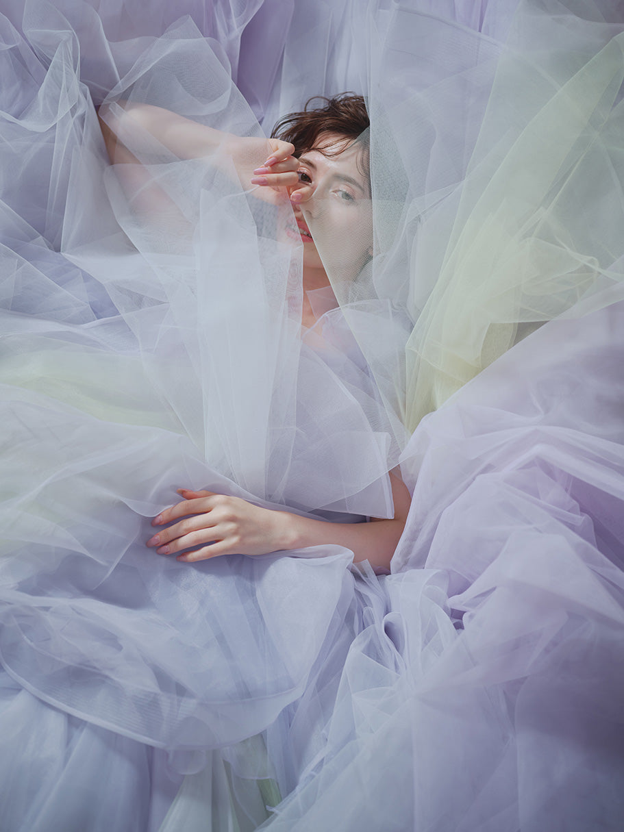 絶妙なバランスで重ね、ニュアンスのある色合いに仕上げた1着。