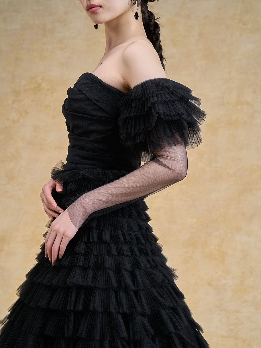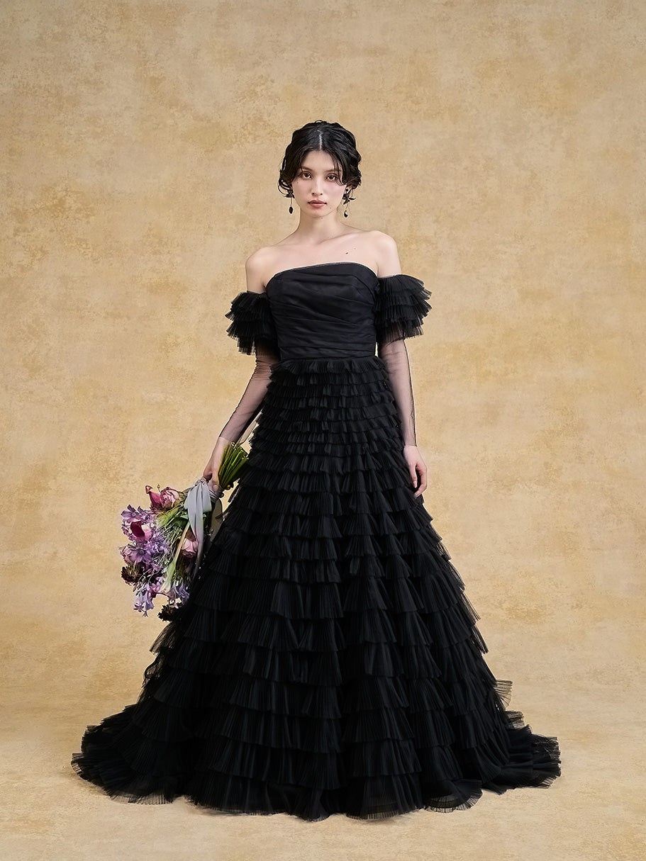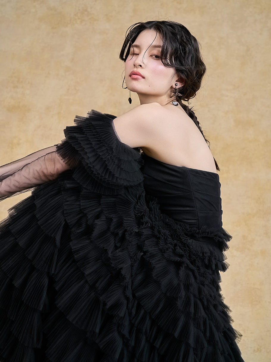 トレンドのティアードドレスをブラックでシックに仕上げた一着。