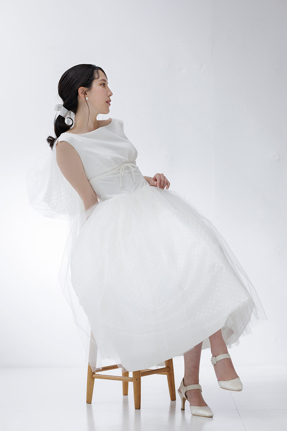 ミモレ丈のドット柄チュールスカートは軽やかな印象を与えます。