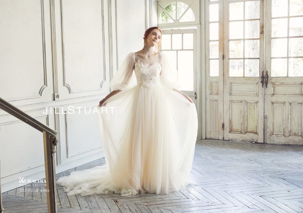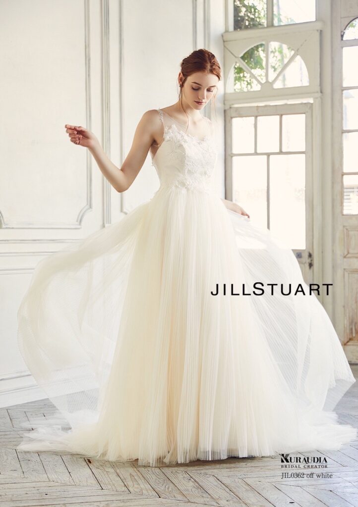 トップスにはJILLSTUARTらしいレースをあしらい、スカート部分はソフトチュールに細かなプリーツを幾重にも重ねています。