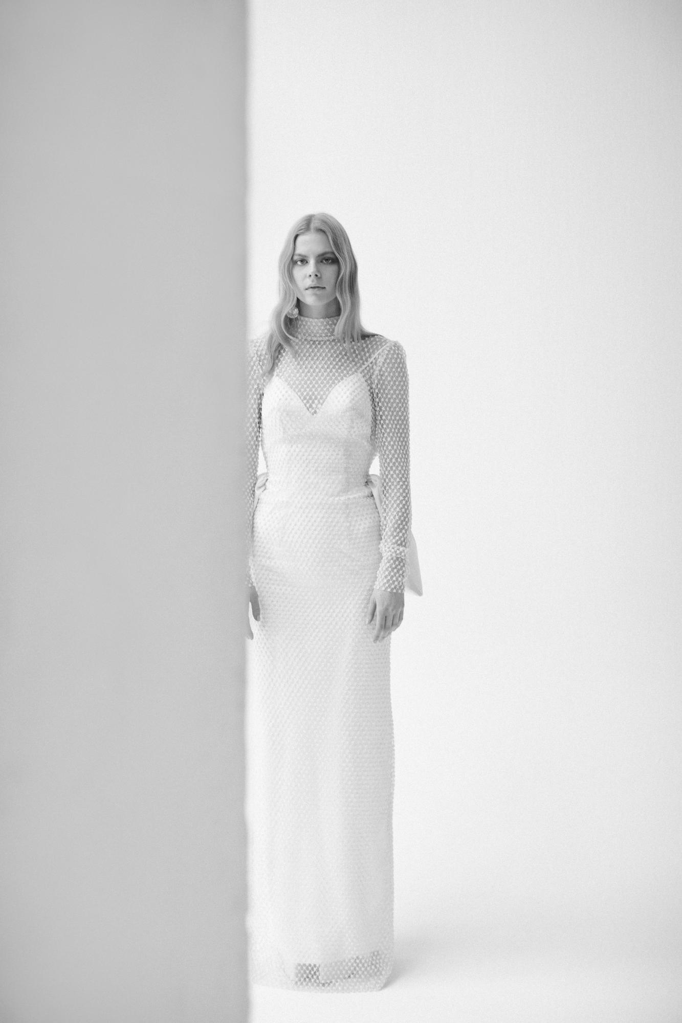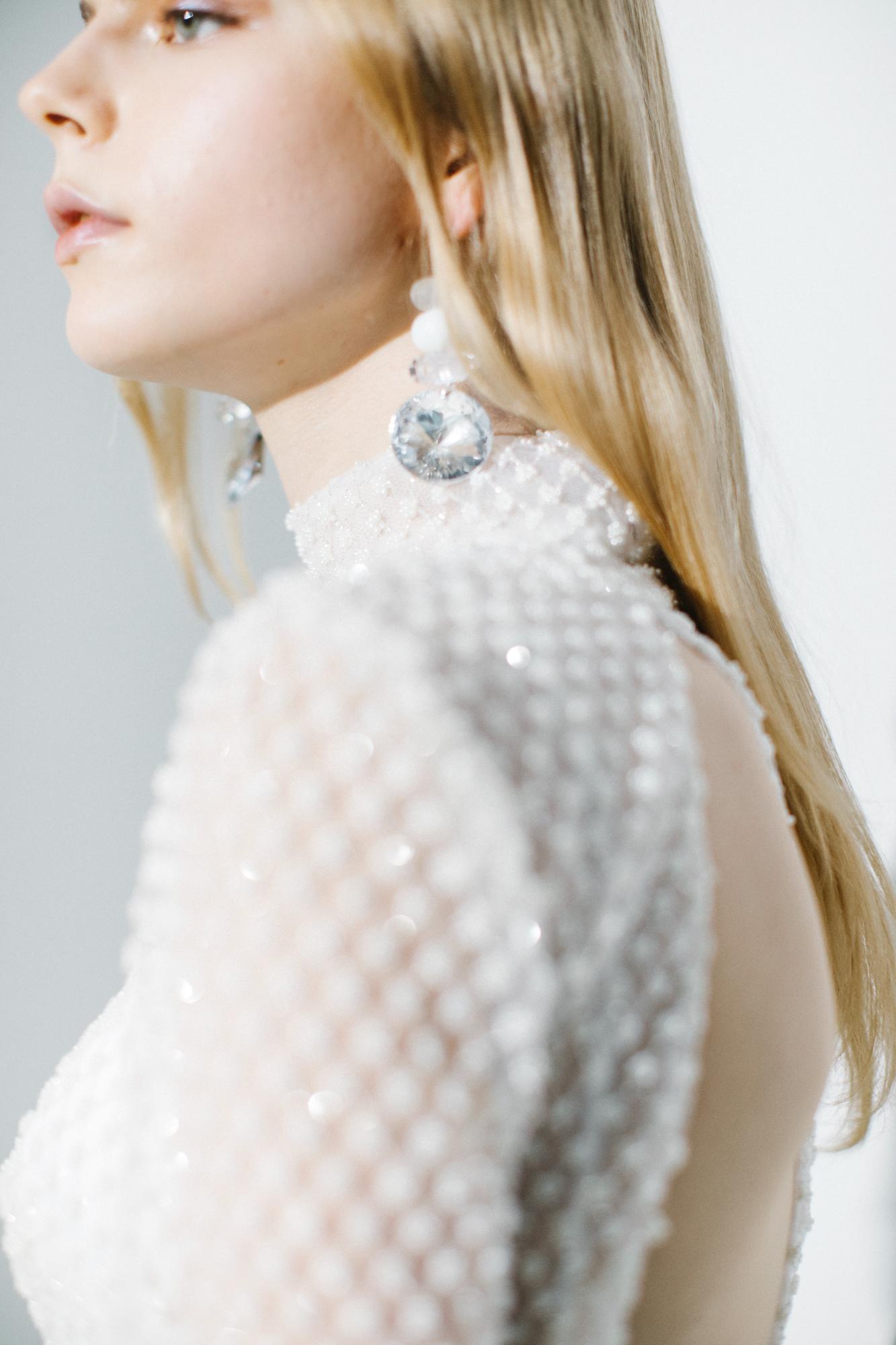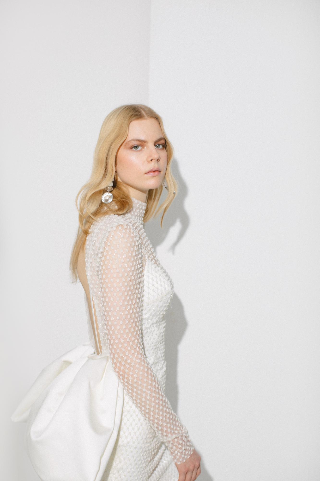 キラキラと歩くたび煌めくハイネックの長袖ドレスです。