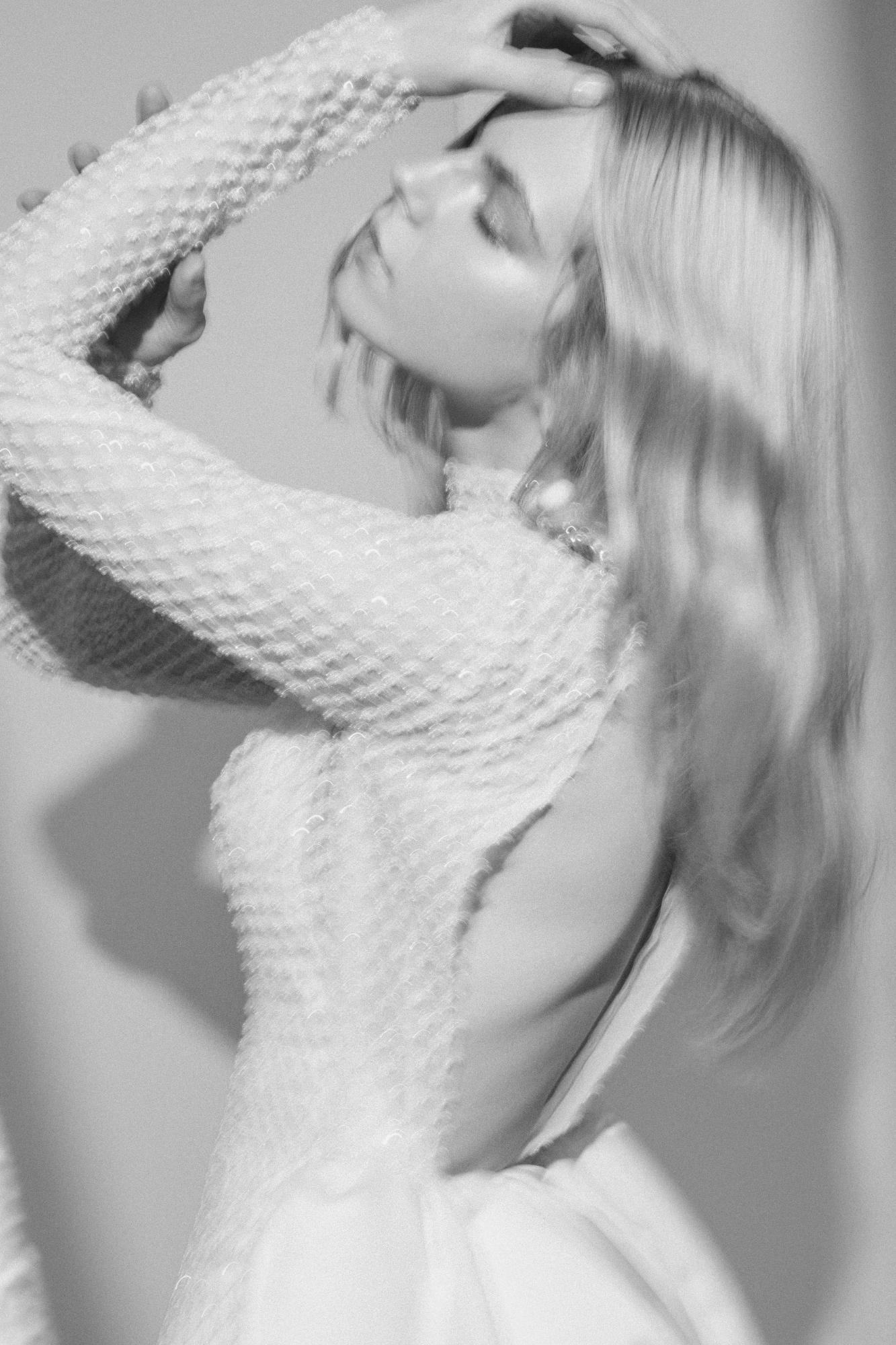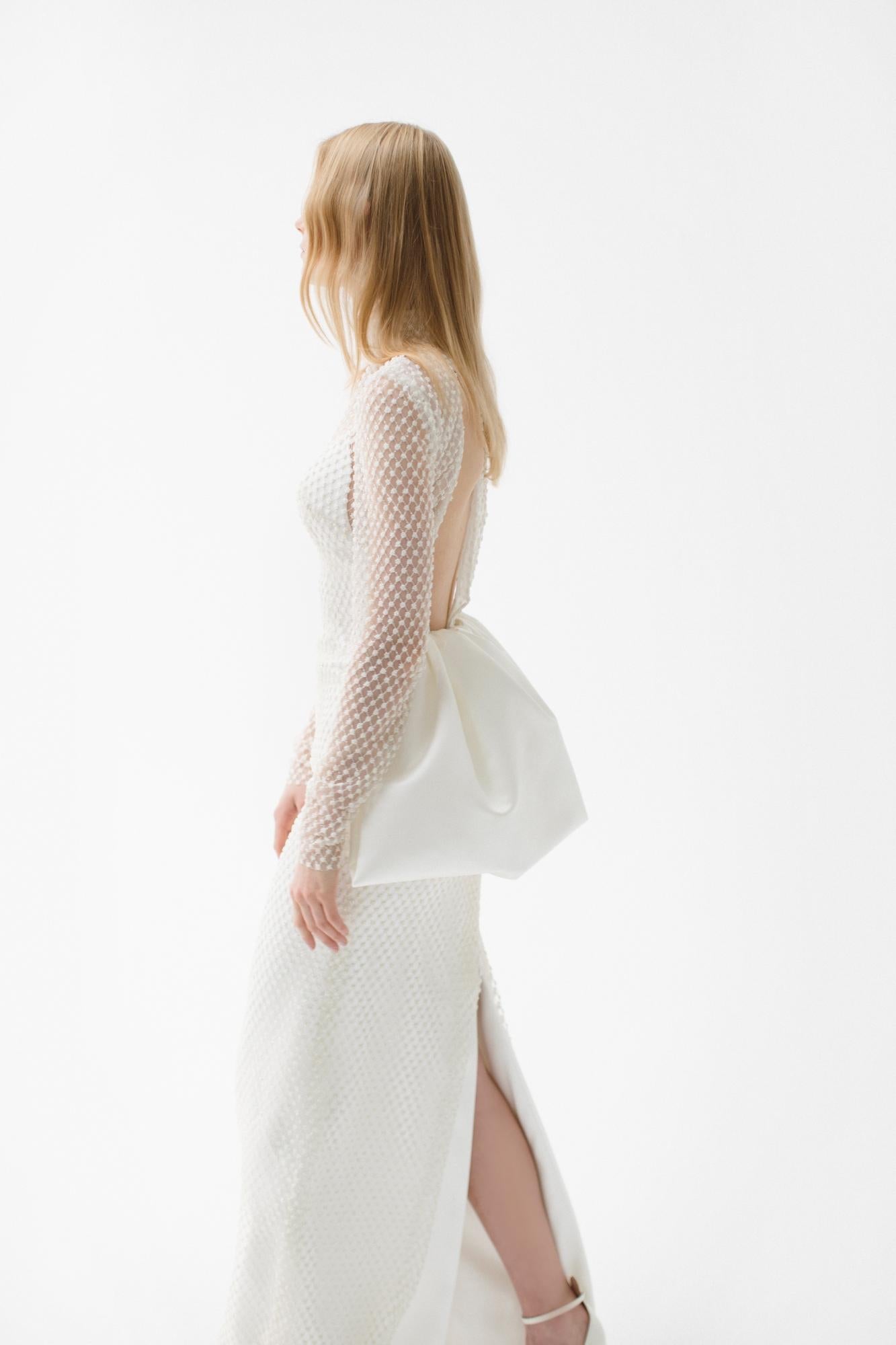 背中のカッティングは腰まですっと伸びスカートのスリットは深く程よい肌見せも叶う魅力の詰まった一着。