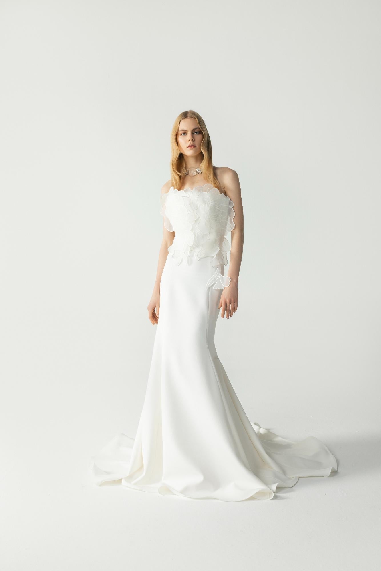 バストに沿わない平面的かつ構築的なビスチェはいい意味で逸脱したデザイン。