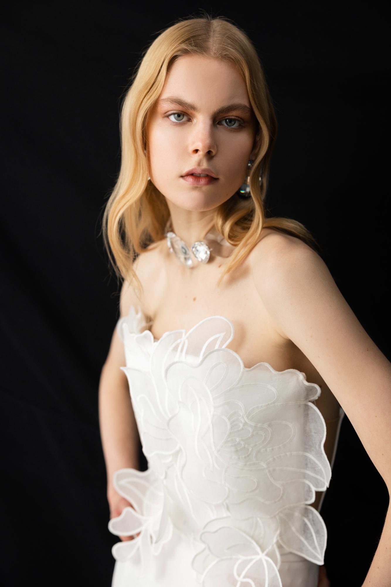 2Dのオーガンジーの花を3Dとして使用した装飾でBEGUMならではの拘りを感じられるドレスです。