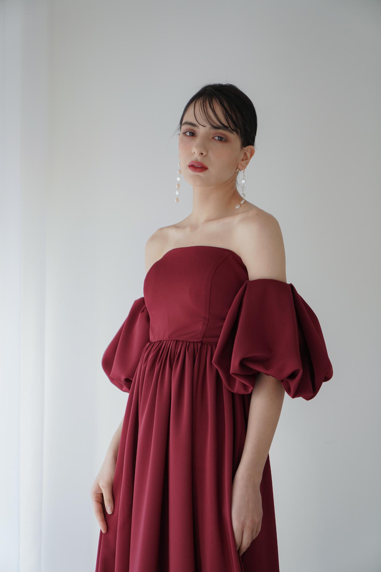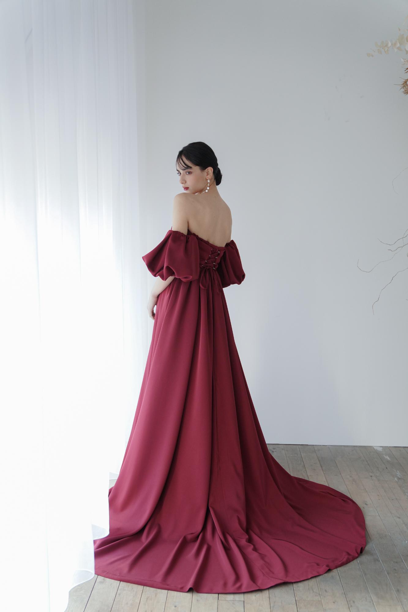ジョーゼットサテンの生地が織り成す、しなやかな光沢感を主役にしたプリンセスラインドレス。身にまとうワインレッドカラーが、大人のフェミニンさを際立たせます。ボリュームのあるスカートで、後ろ姿も絵になる花嫁姿に。