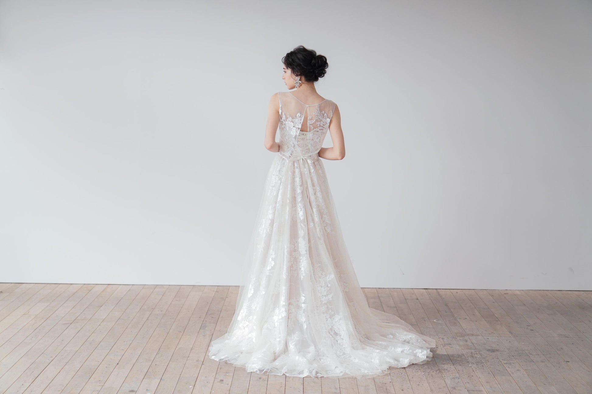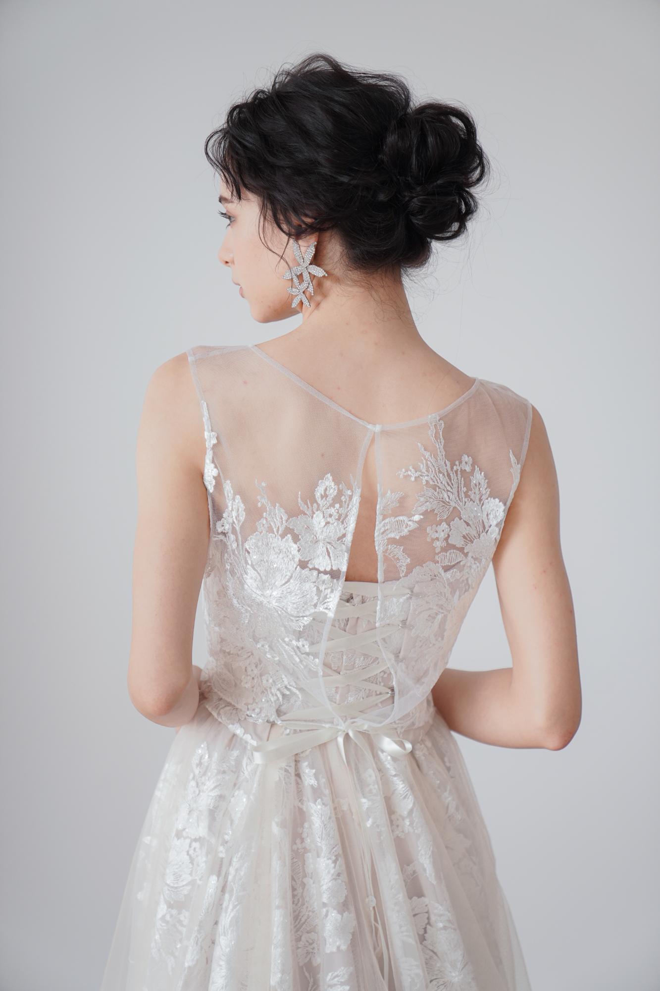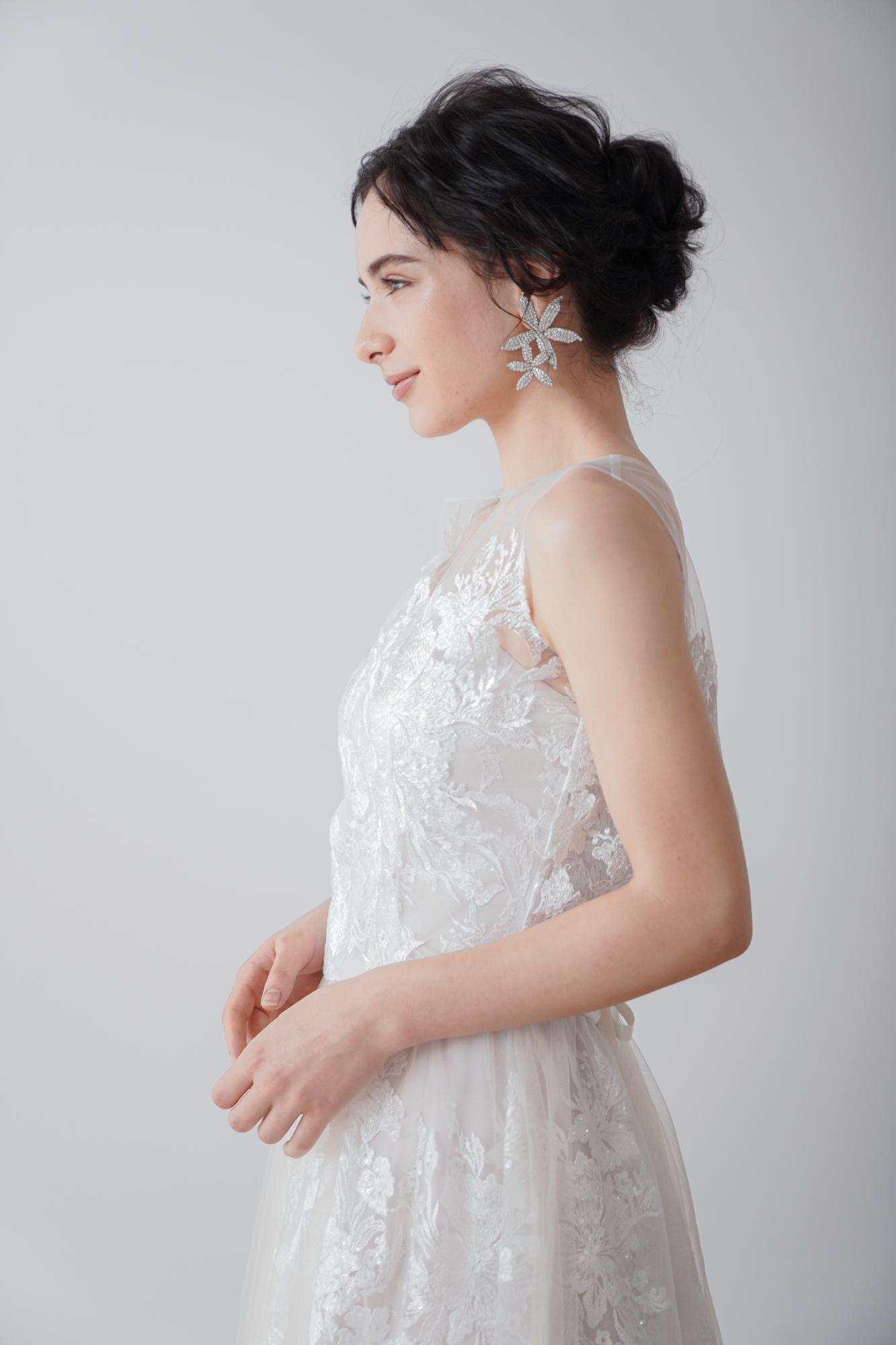 スカートのレースにソフトチュールを重ねることで、華美でありながらやわらかな雰囲気に。